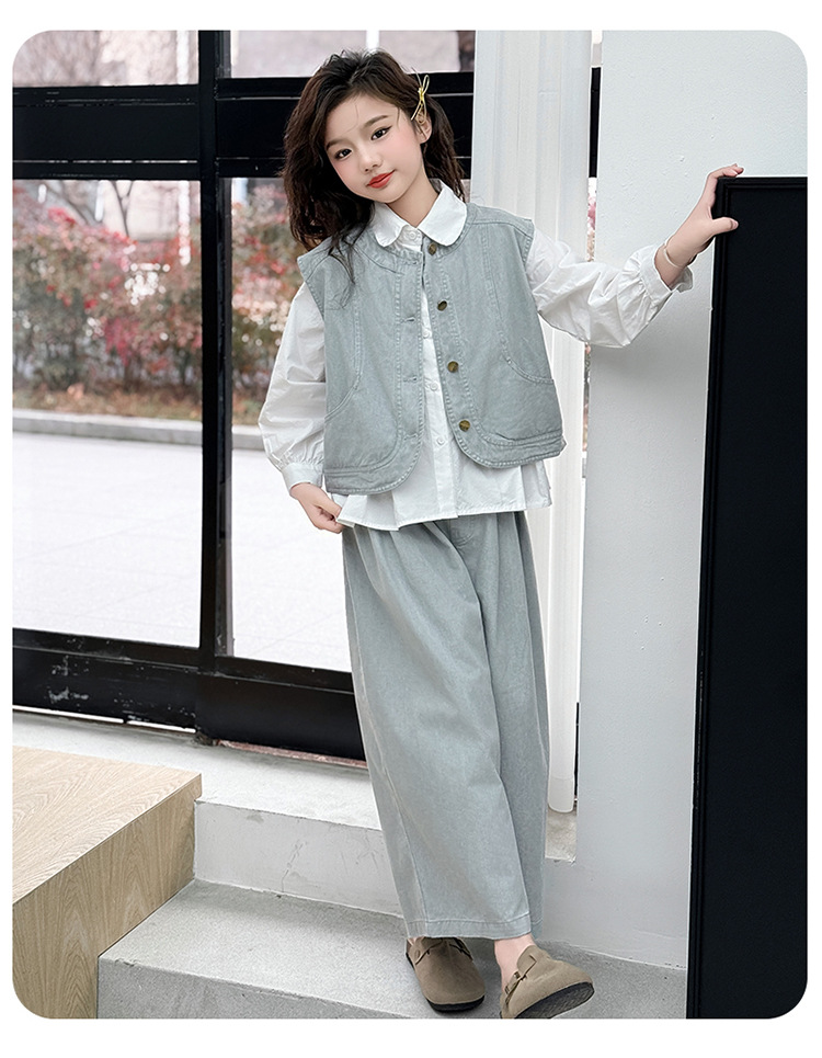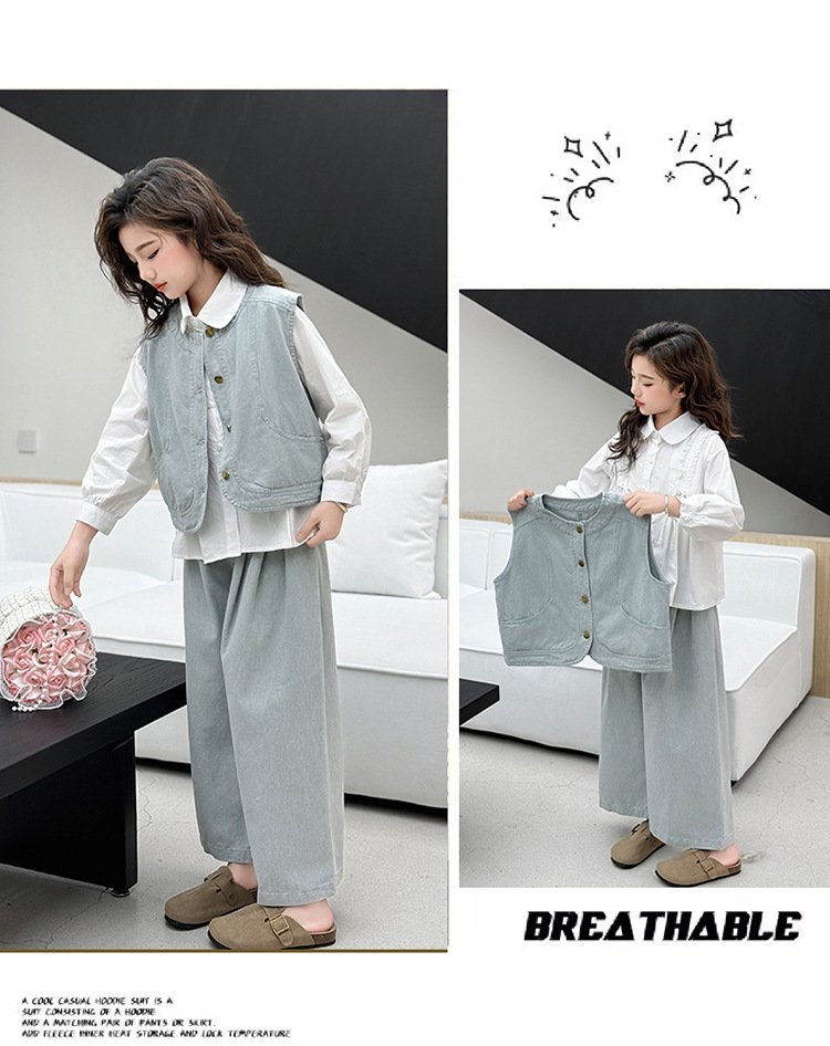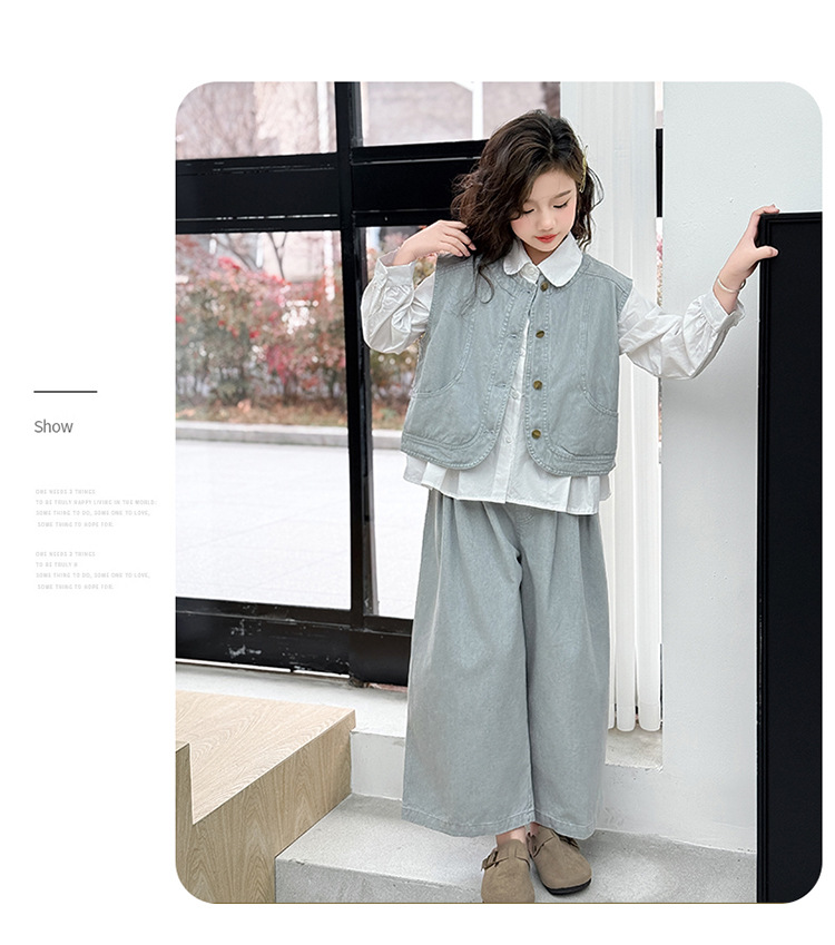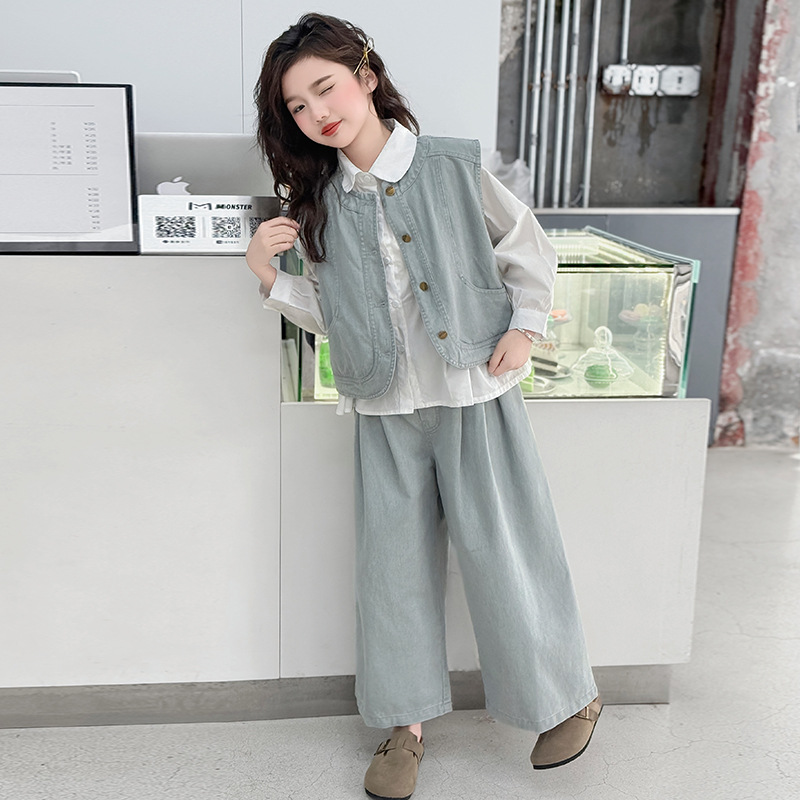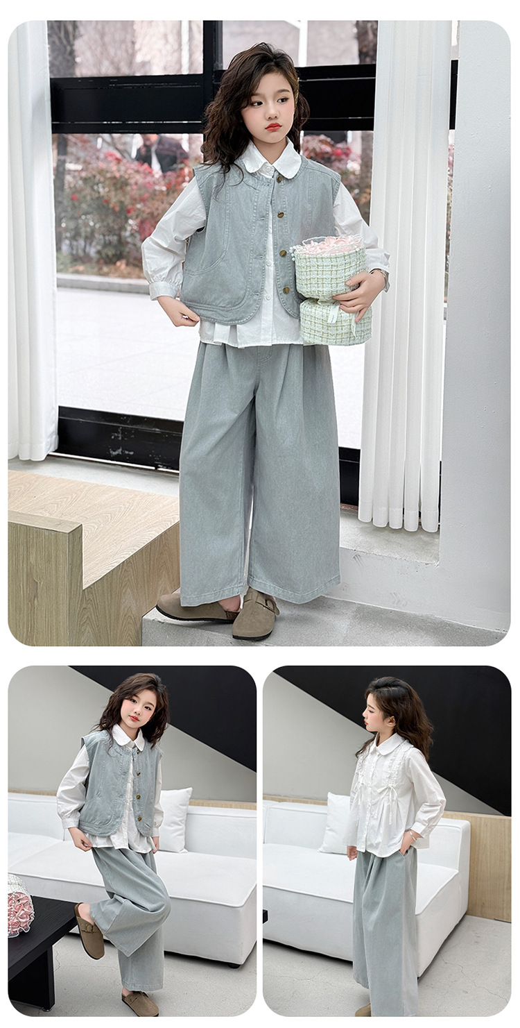 여자 캐주얼 예술적 스타일 봄 정장 봄 옷 2025 새로운 아기 소녀 유행 조끼 와이드 레그 팬츠 3 피스 세트
