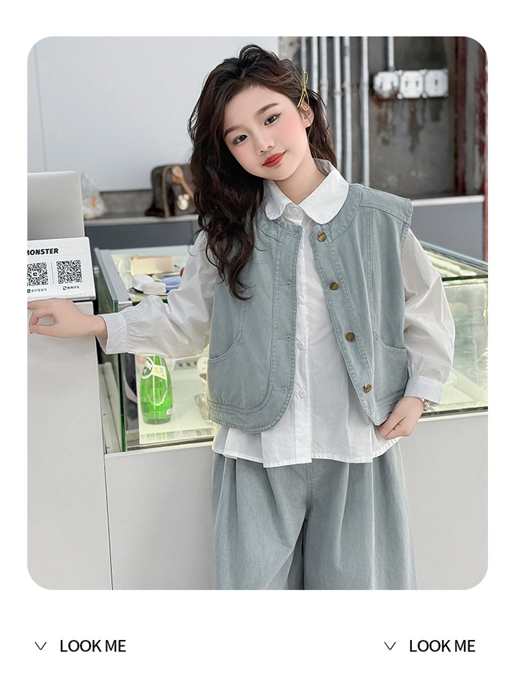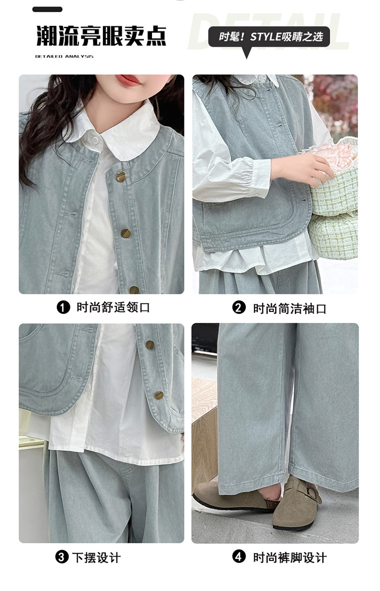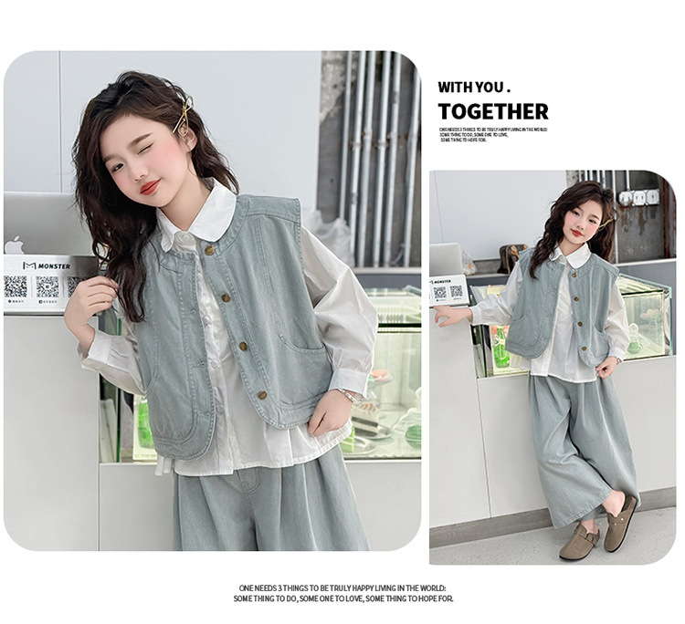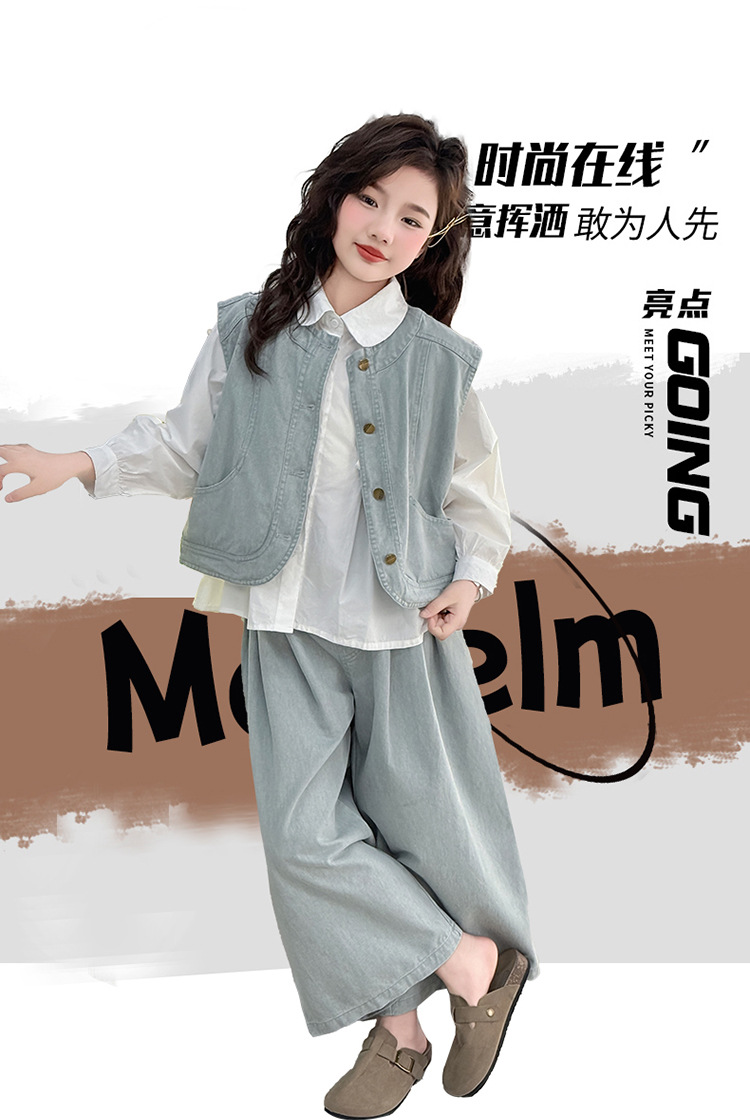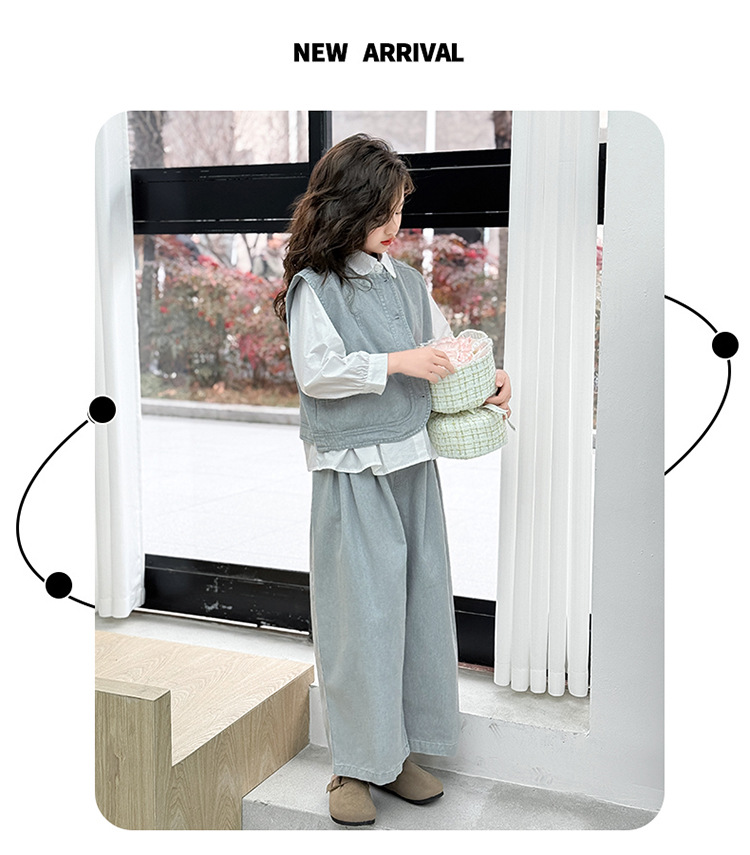 여자 캐주얼 예술적 스타일 봄 정장 봄 옷 2025 새로운 아기 소녀 유행 조끼 와이드 레그 팬츠 3 피스 세트