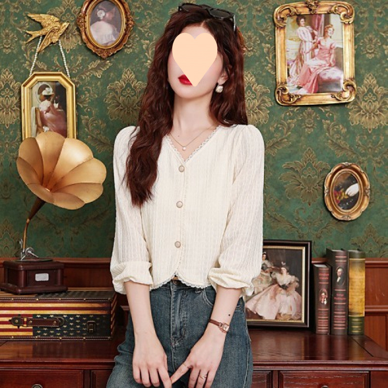 2025 봄 새로운 레이스 레이스 칼라 버블 소매 셔츠 올 매치 웨스턴 스타일 셔츠 탑 여성스토어 가기