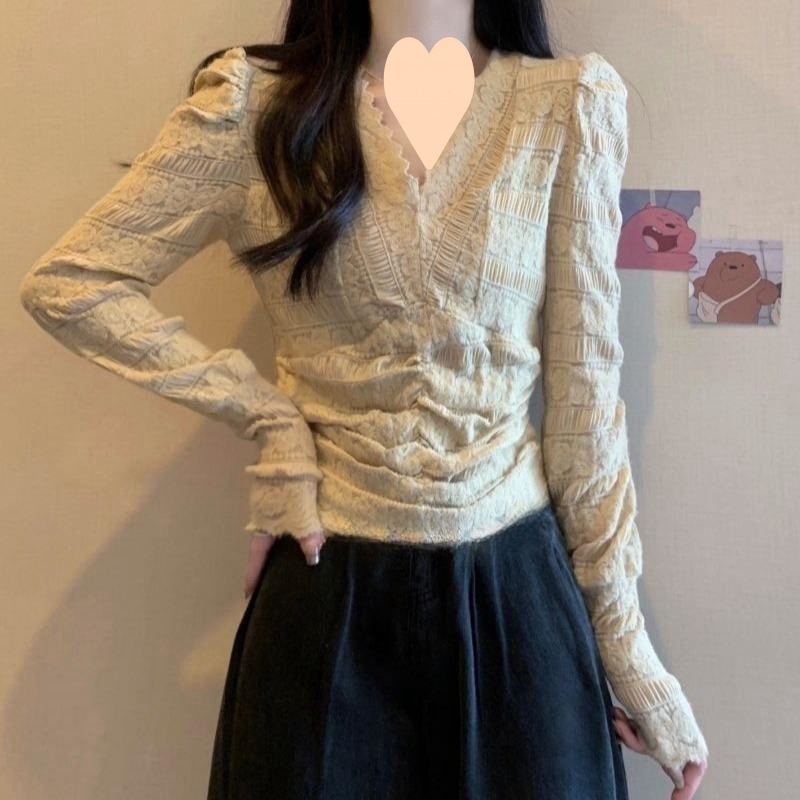 봄 2025 새로운 한국 스타일 내베이스 지방 슬리밍 프랑스 칼라 유럽 레이스 셔츠 탑