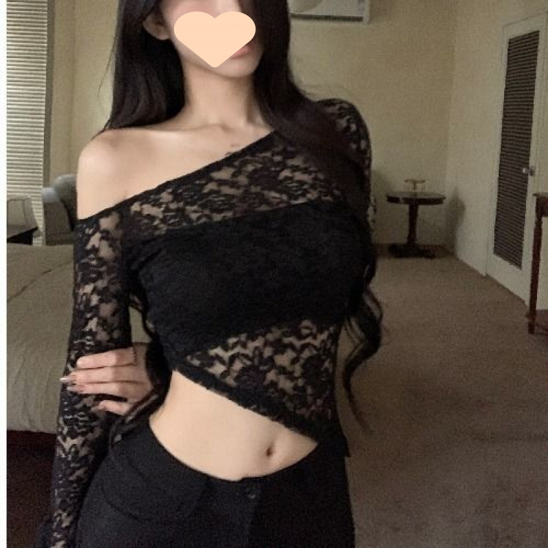 순수 블랙 슬란 트 어깨 긴팔 레이스 셔츠 여자 여름 섹시한 슬림 핏 불규칙한 짧은 오픈 숄더 혼 슬리브 탑