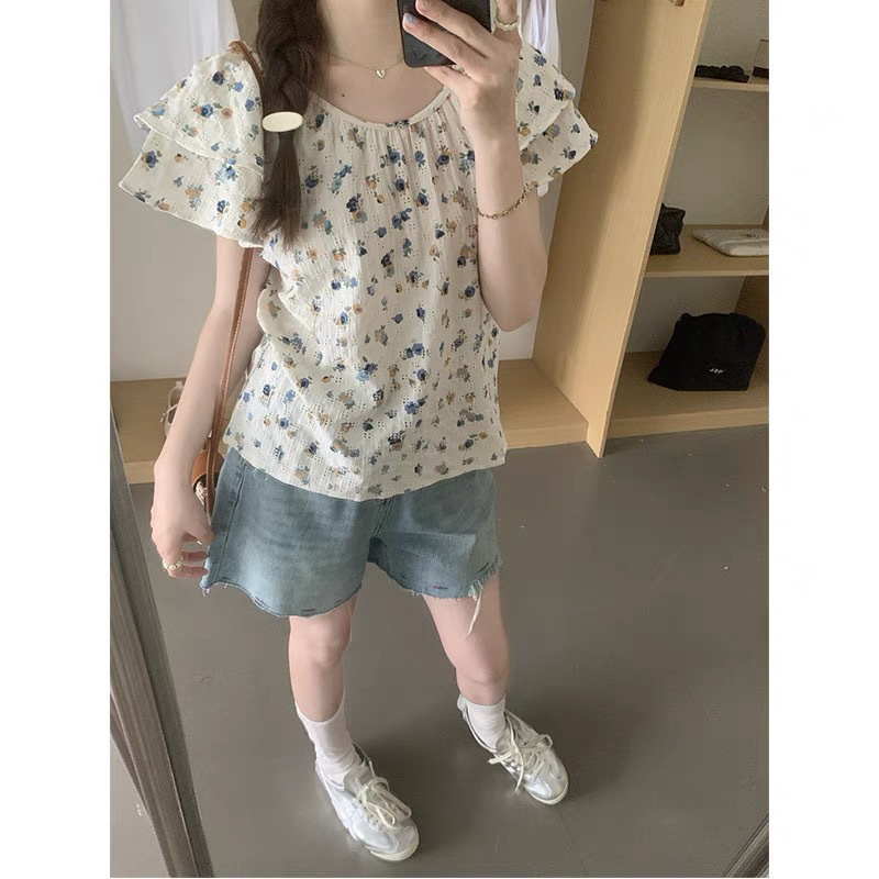 부드러운 스타일 레트로 서양식 연령 감소 달콤한 짧은 소매 칼라 작은 비행 소매 빈 세련된 꽃 셔츠 최고의 여성 여름