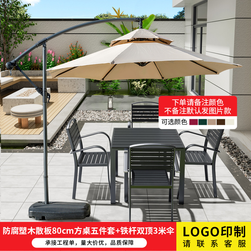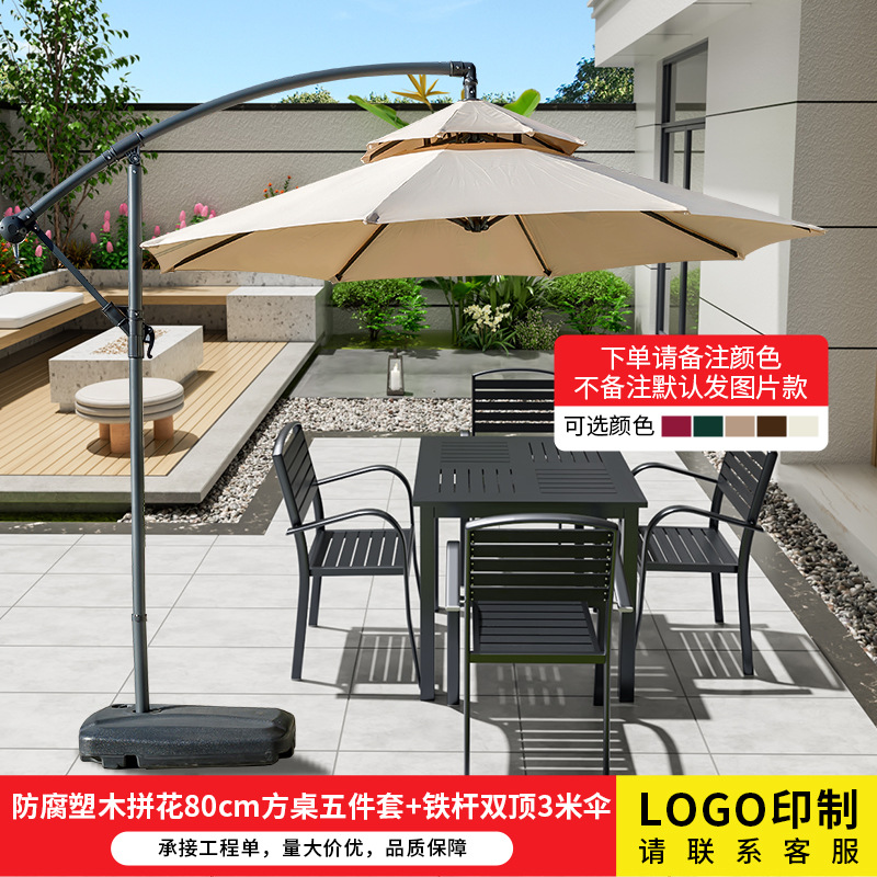 • 부식 방지 플라스틱 나무 쪽모이 세공 80cm 정사각형 테이블 5종 세트 + 철제 이중 지붕 3m 우산