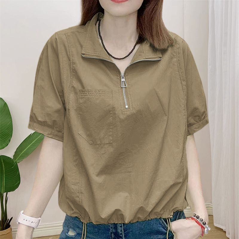 지퍼 옷깃이 달린 얇은 반팔 셔츠 2025 여름 새로운 도착 짧은 인형 셔츠 느슨한 탑스토어 가기