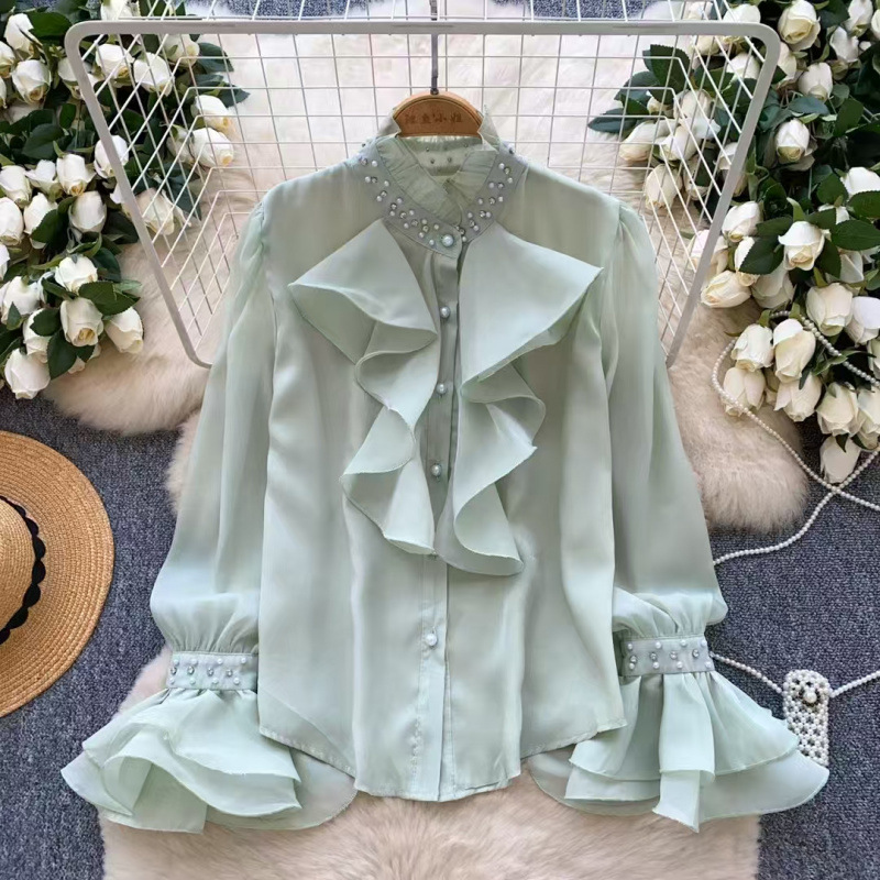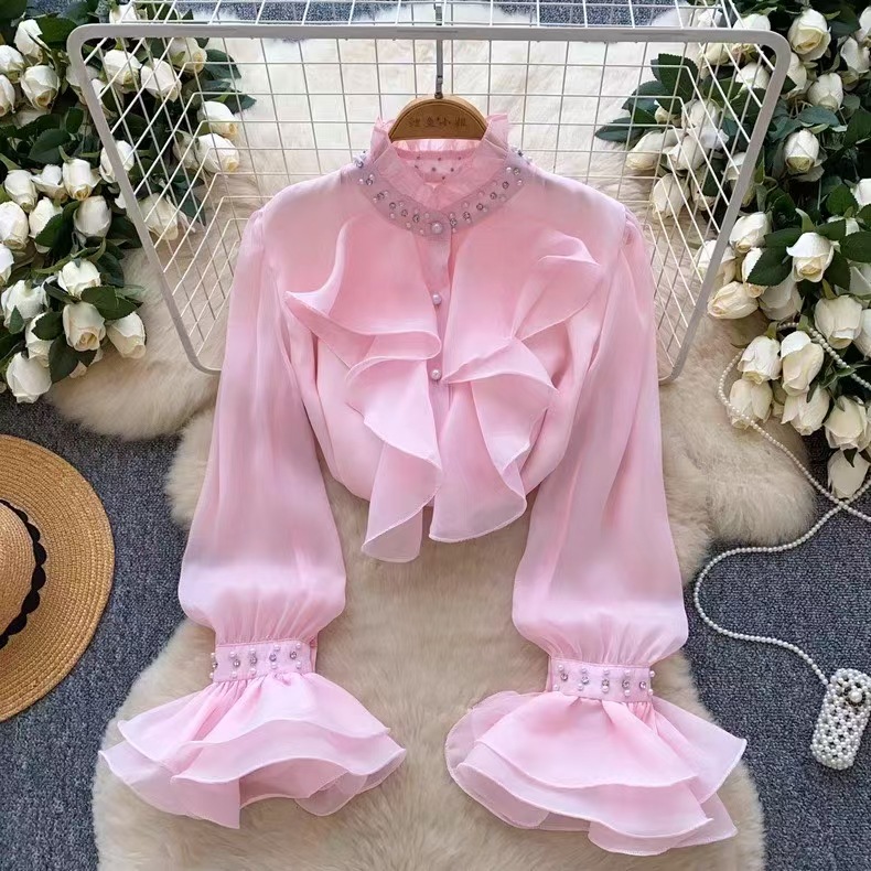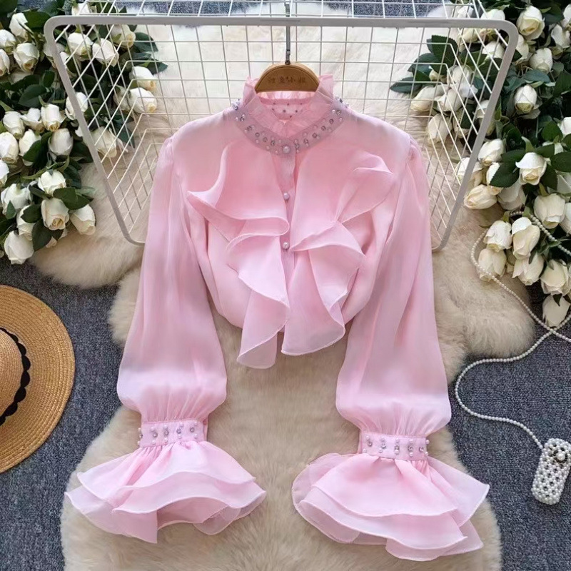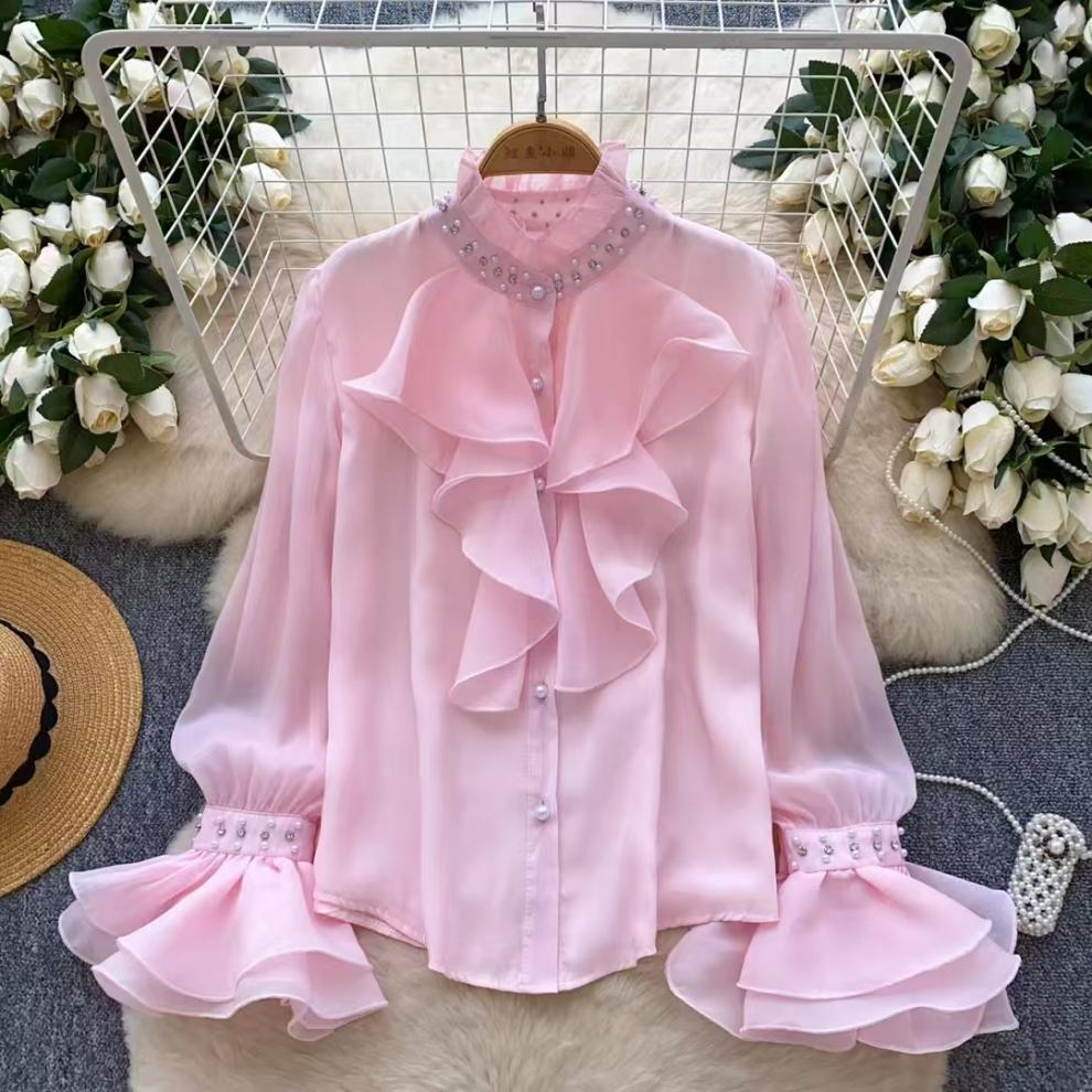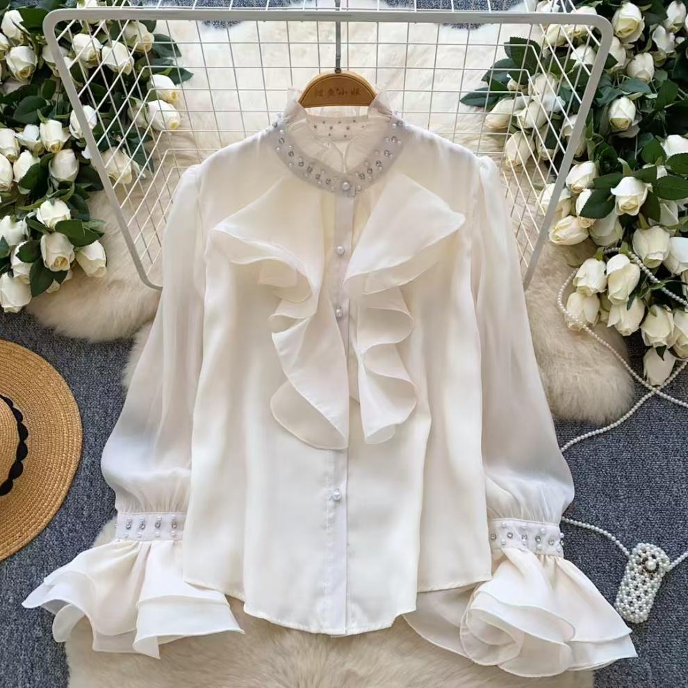 다이아몬드로 장식 된 프릴 칼라 긴팔 셔츠 여성의 가을 허리 길이 우아한 쉬폰 셔츠 디자인 아름답고 황금색 탑스토어 가기