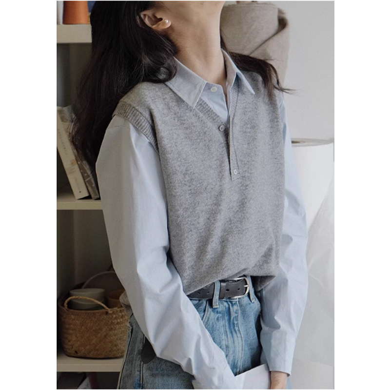 프렌치 그레이 V 넥 스웨터 니트 조끼 여성 조끼 봄과 가을 하이 엔드 소형 웨이스트 코트 셔츠 탑스토어 가기