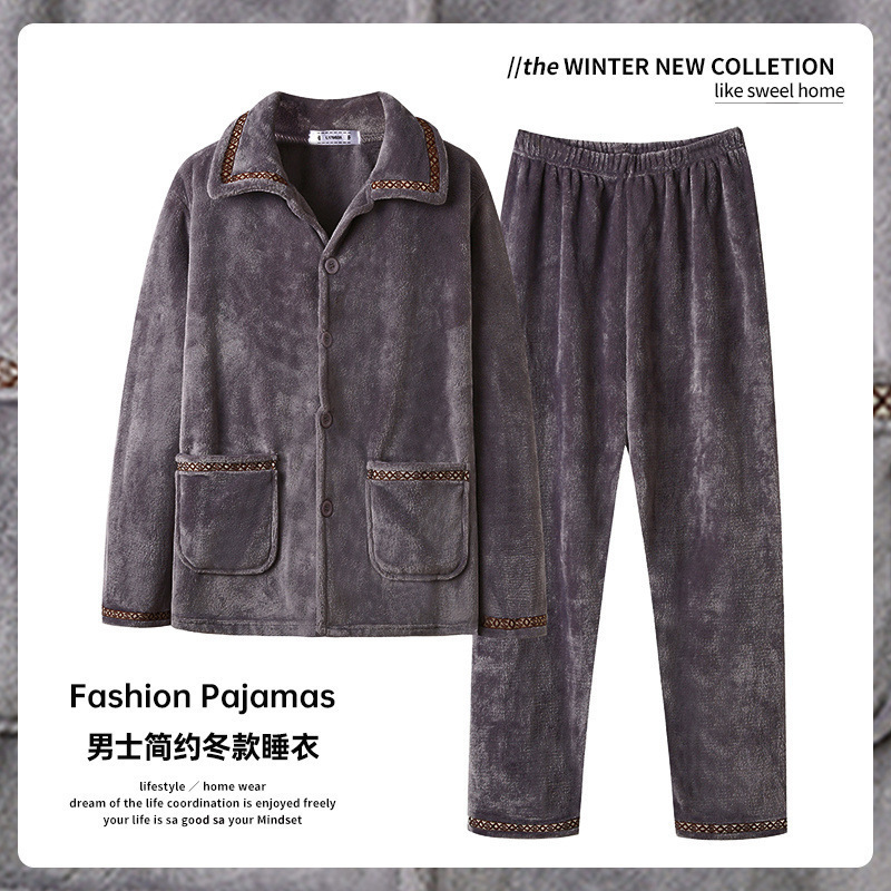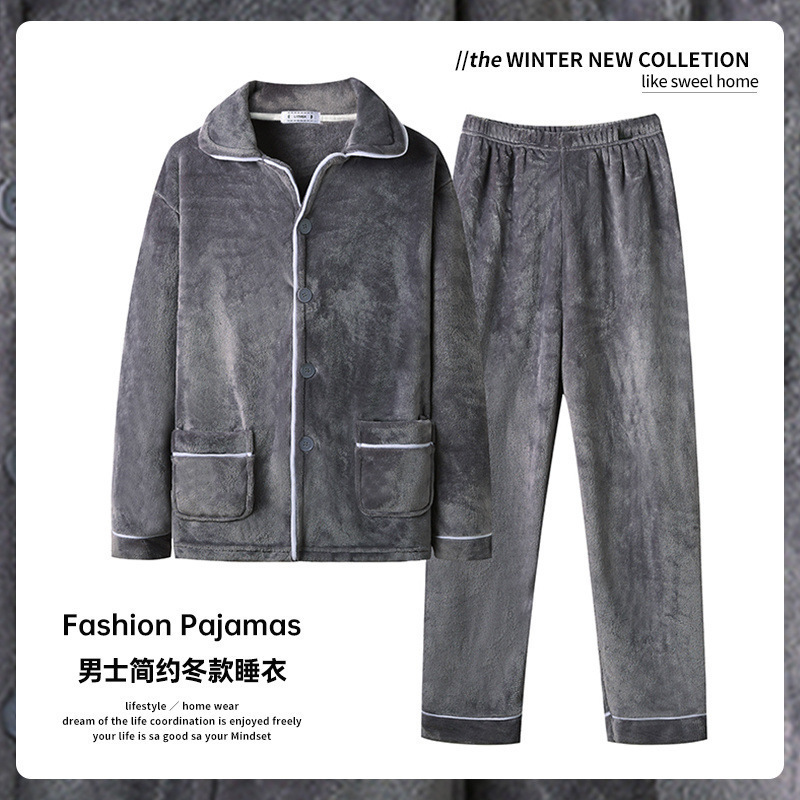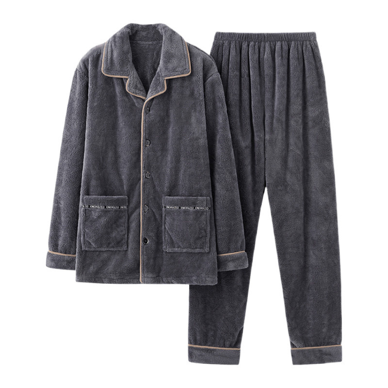 가을과 겨울 남자 산호 양털 파자마는 따뜻한 긴 소매 플란넬 홈 옷을 입고 기모 세트.