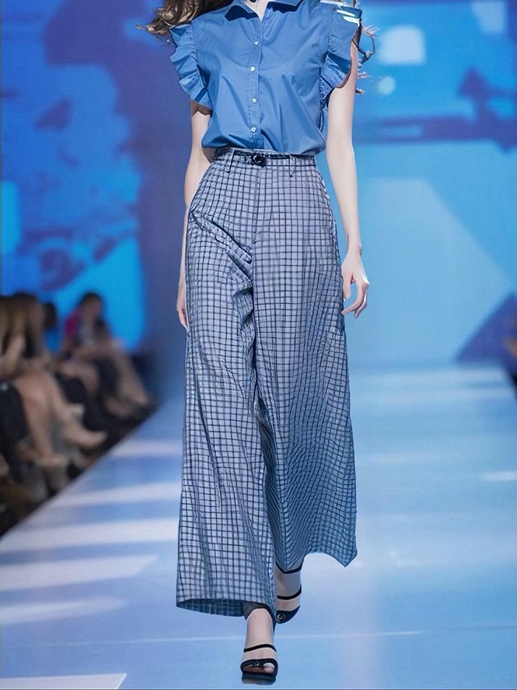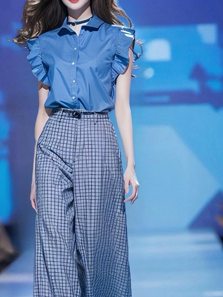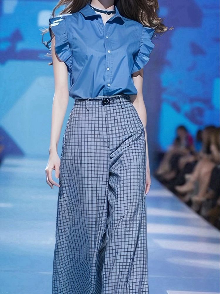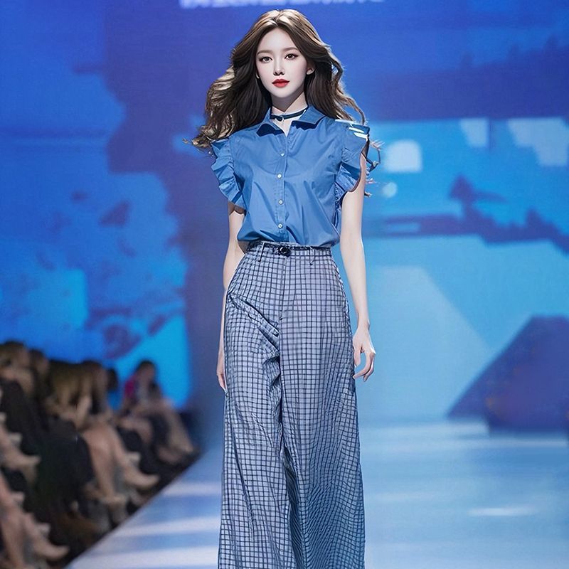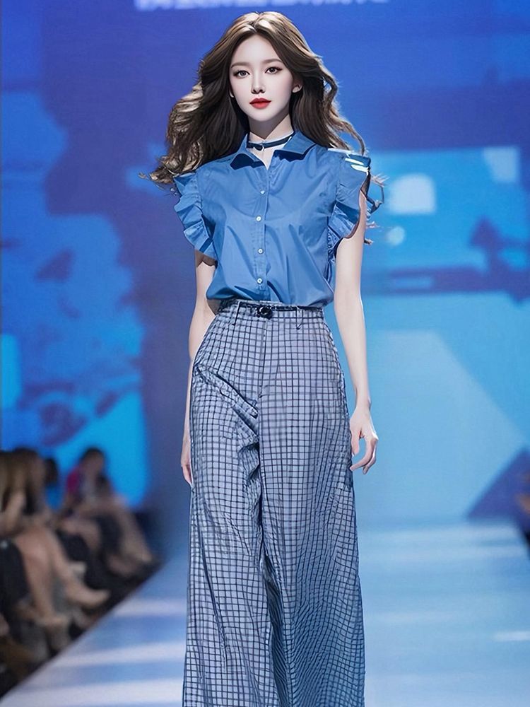 도파민 착용 2025 여름 새로운 블루 플라잉 슬리브 셔츠 높은 허리 느슨한 넓은 다리 바지 투피스 세트