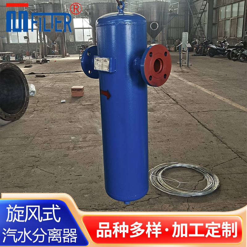 旋风式(也称离心式):大量含水的蒸汽或压缩空气进入汽水分离器,并在其中以旋流向下倾斜式运动;旋流的气体中夹带的水份由于速度降低,在已有的离心力作用下,被分离出来水汽在汽水分离器内壁上聚集;在分离的液体汇集到一定程度后流入集水槽中,经自动疏水阀排出,干燥清洁的蒸汽从分离器出口排出。