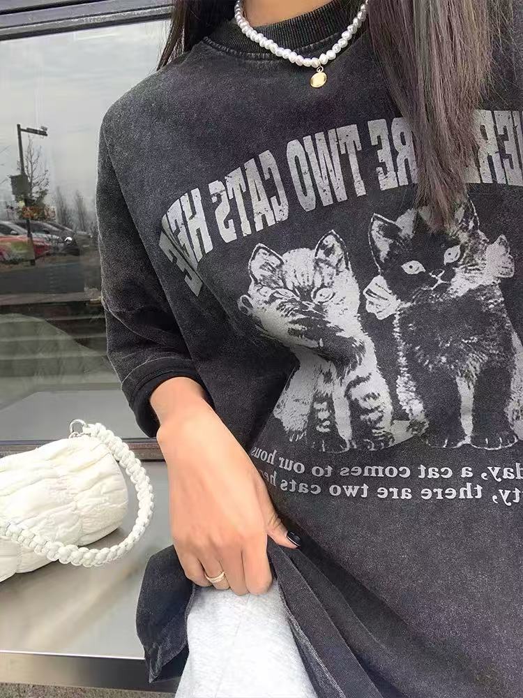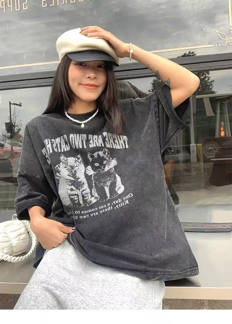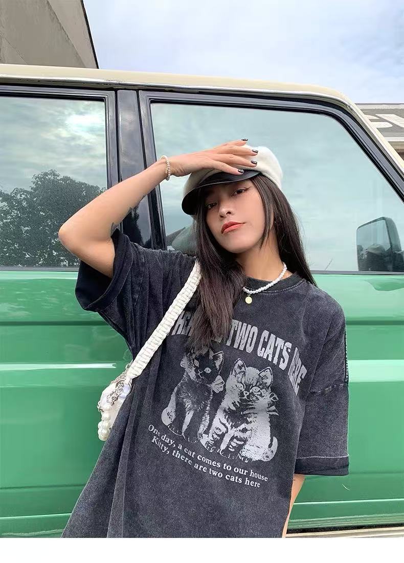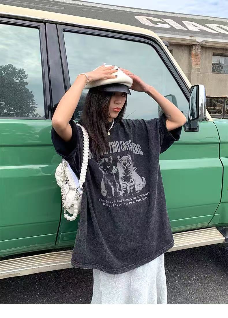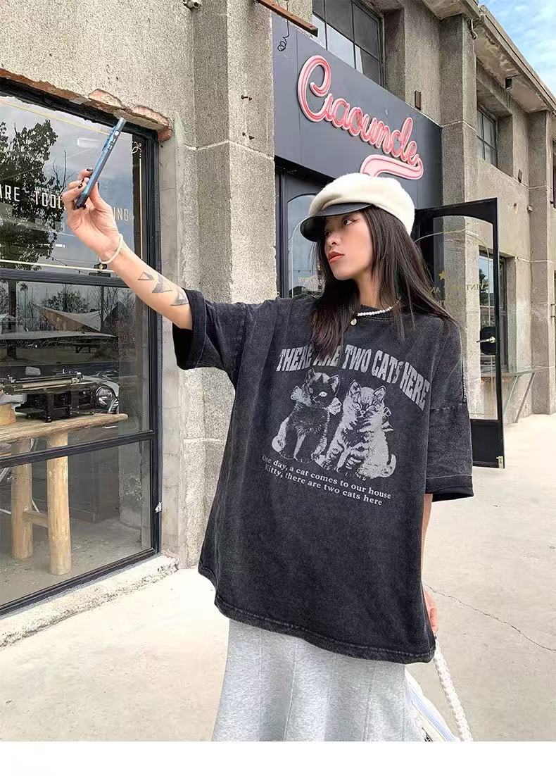 남성과 여성의 여름 오버 사이즈 아메리칸 스타일 복고풍 반팔 여성용 틈새 디자인 센스 세탁 오래 된 루즈 티셔츠 여성스토어 가기