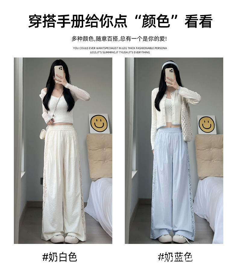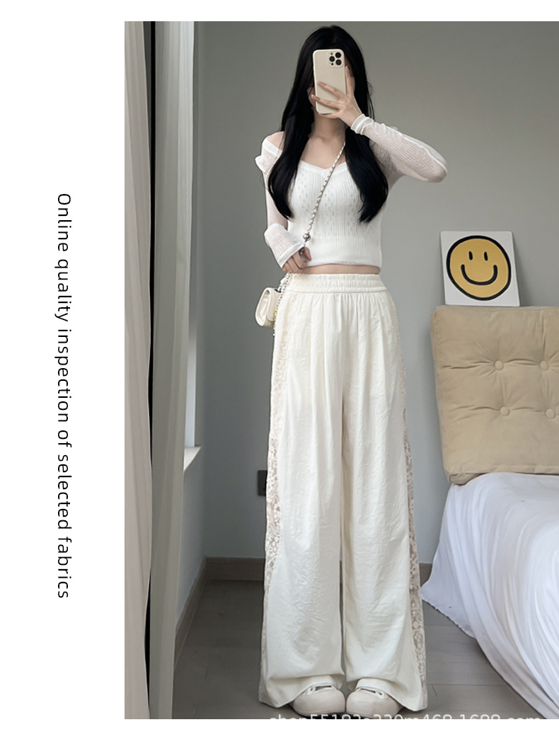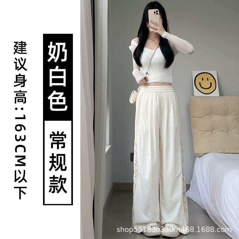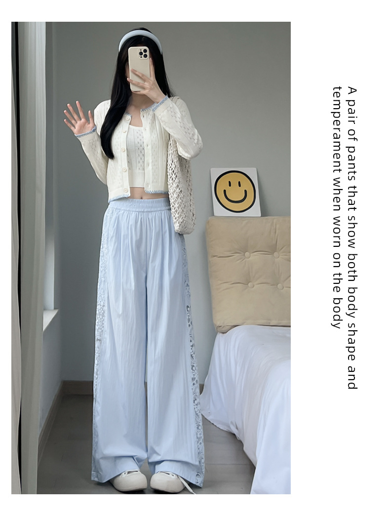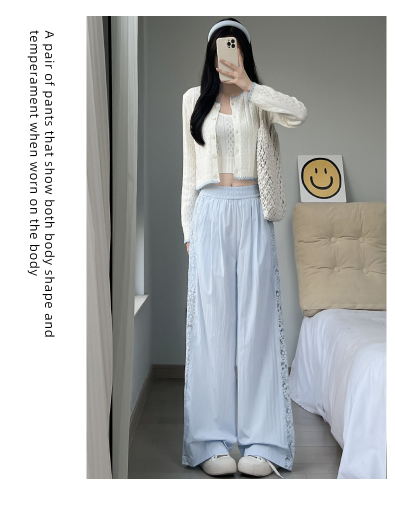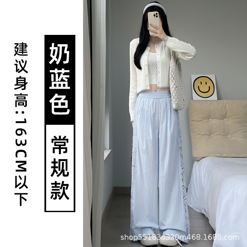 레이스 스티칭 중공 와이드 레그 팬츠 여성의 봄과 여름 2025 새로운 하이 허리 디자인 센스 루즈 슬리밍 아이스 실크 캐주얼 팬츠스토어 가기