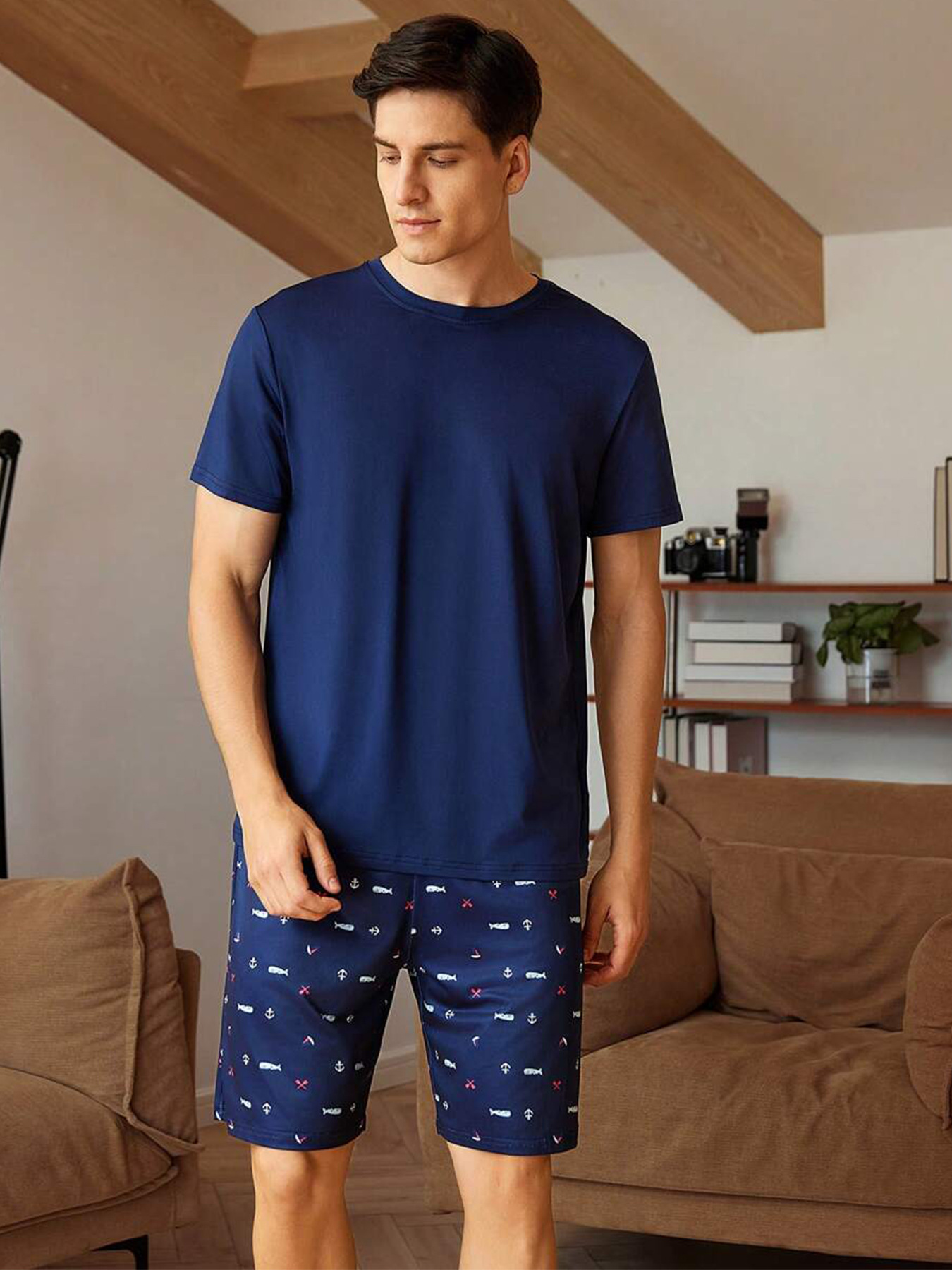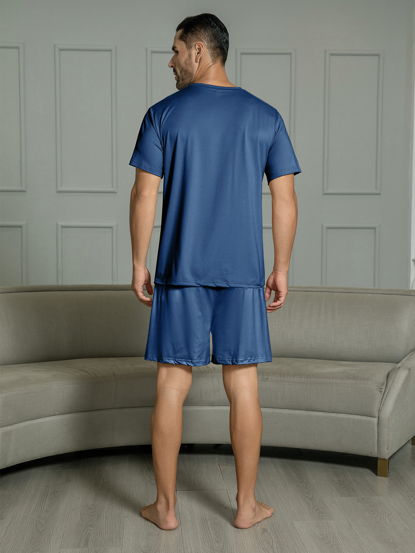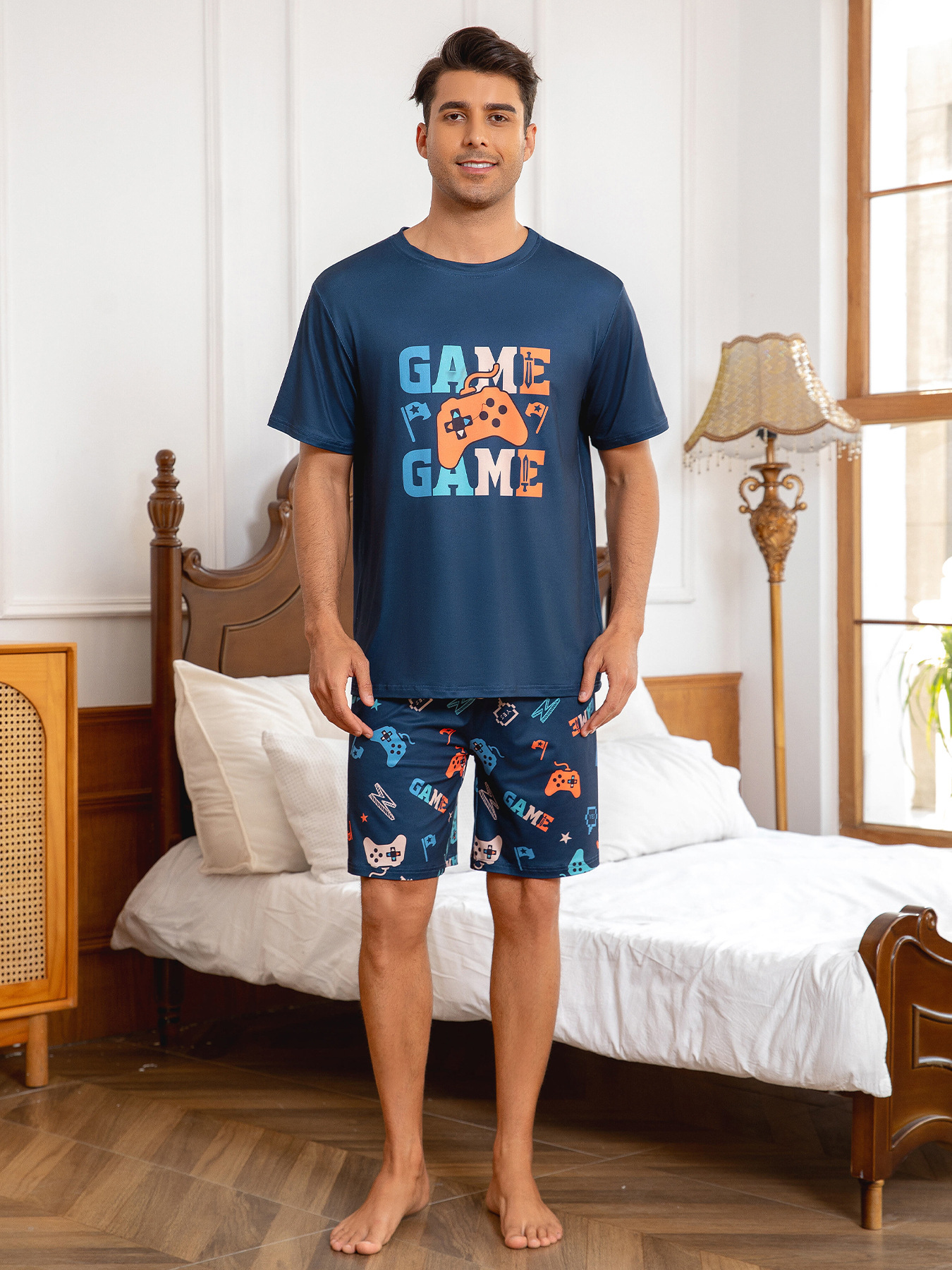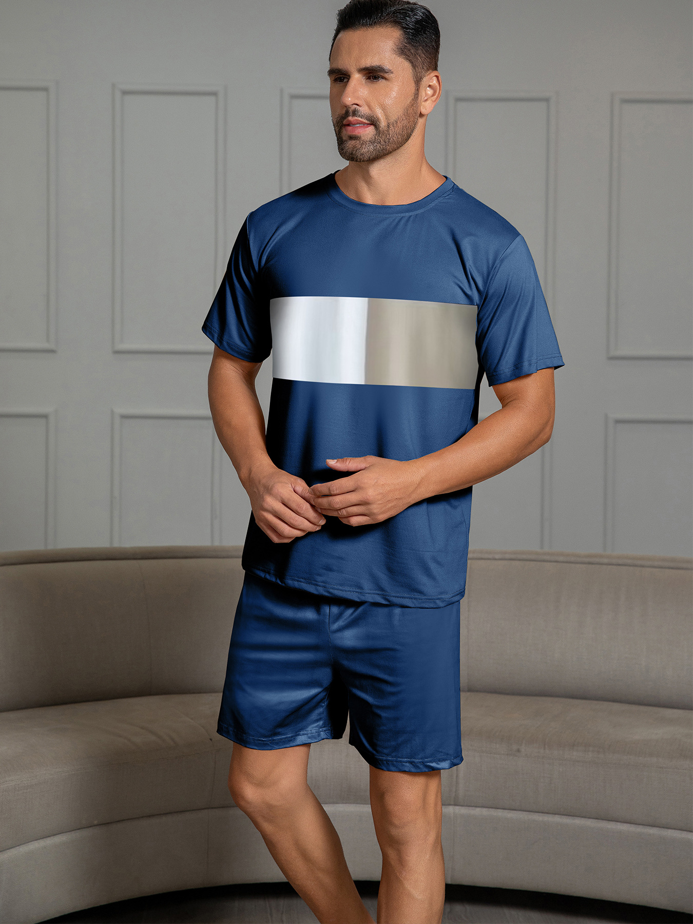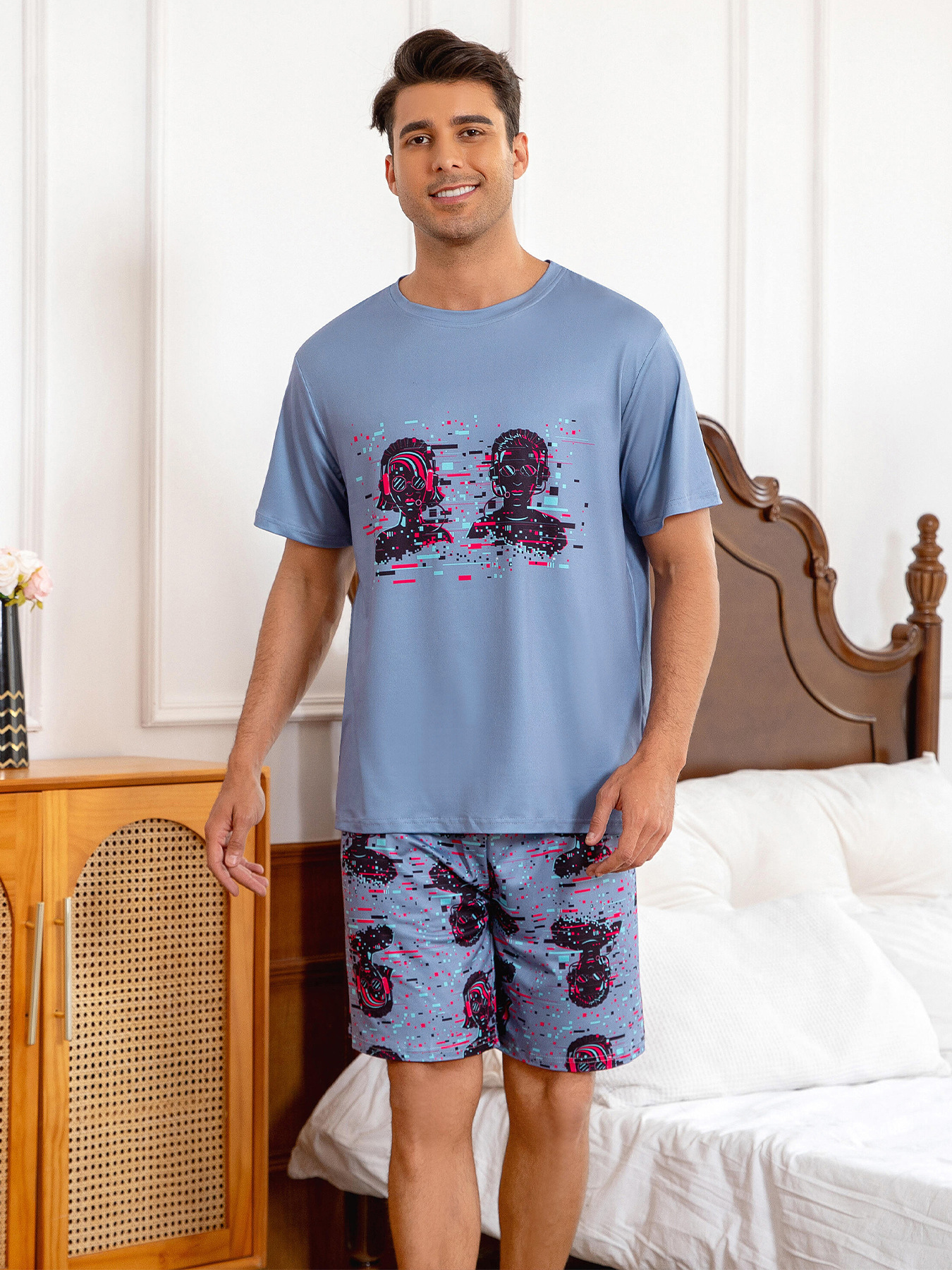 국경 간 대외 무역 남자 잠옷 여름 모조 면 캐주얼 라운드 넥 반팔 반바지 느슨한 홈 의류 세트 착용스토어 가기