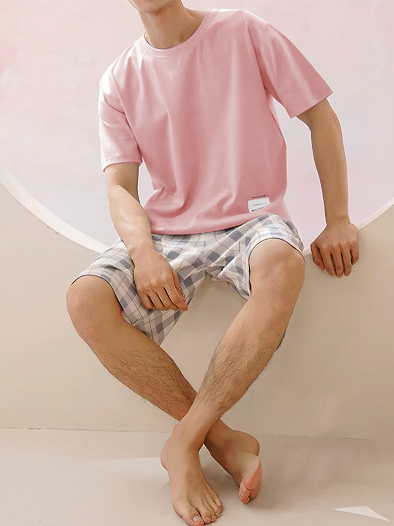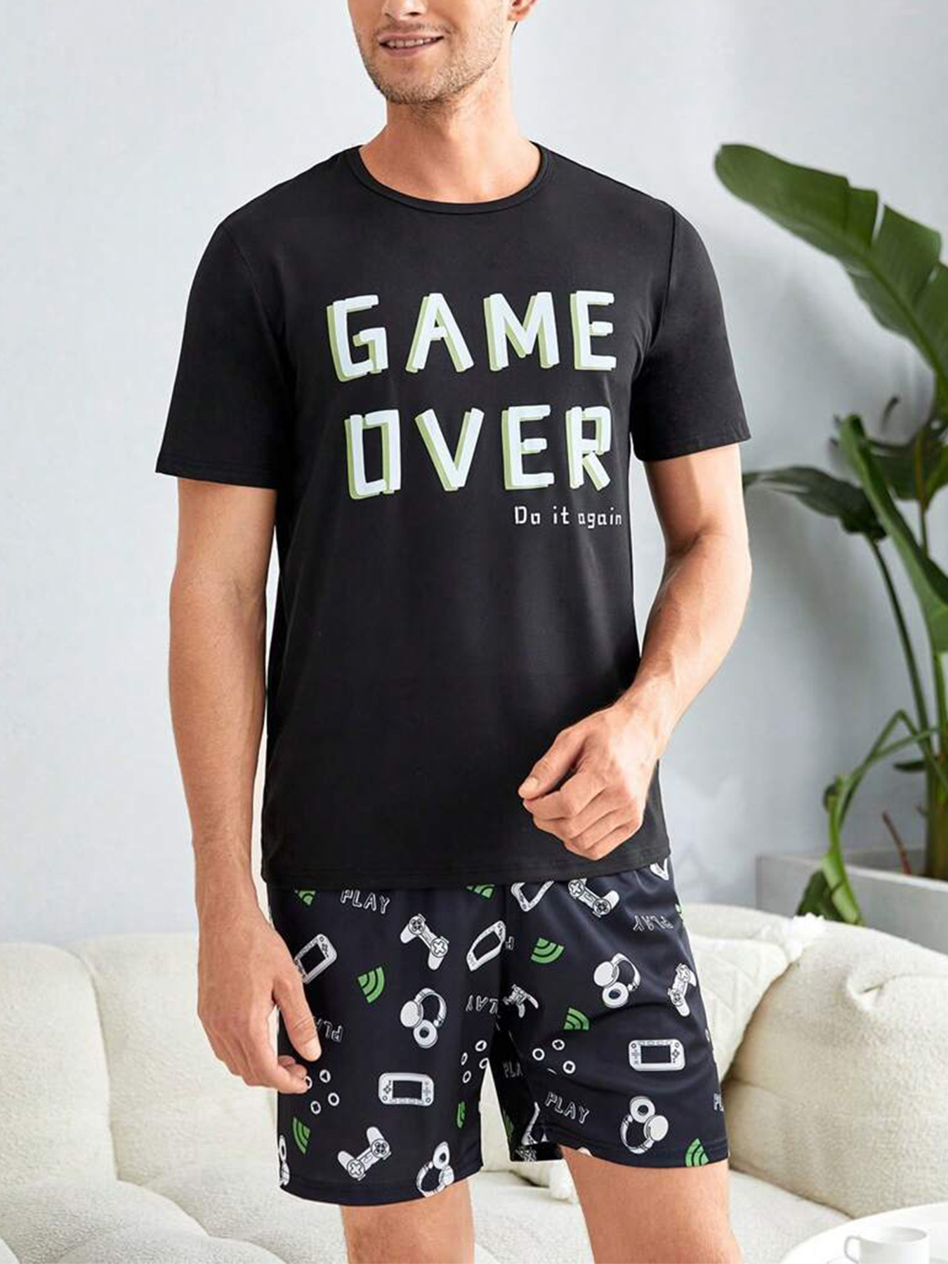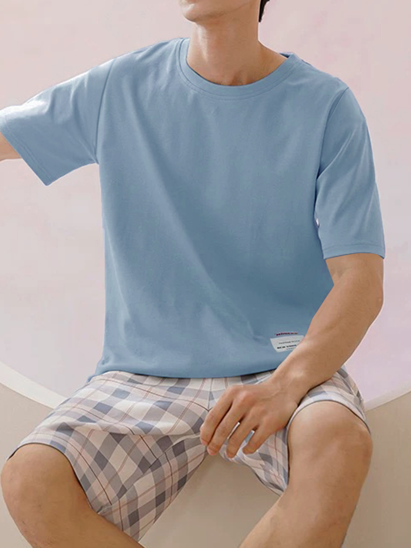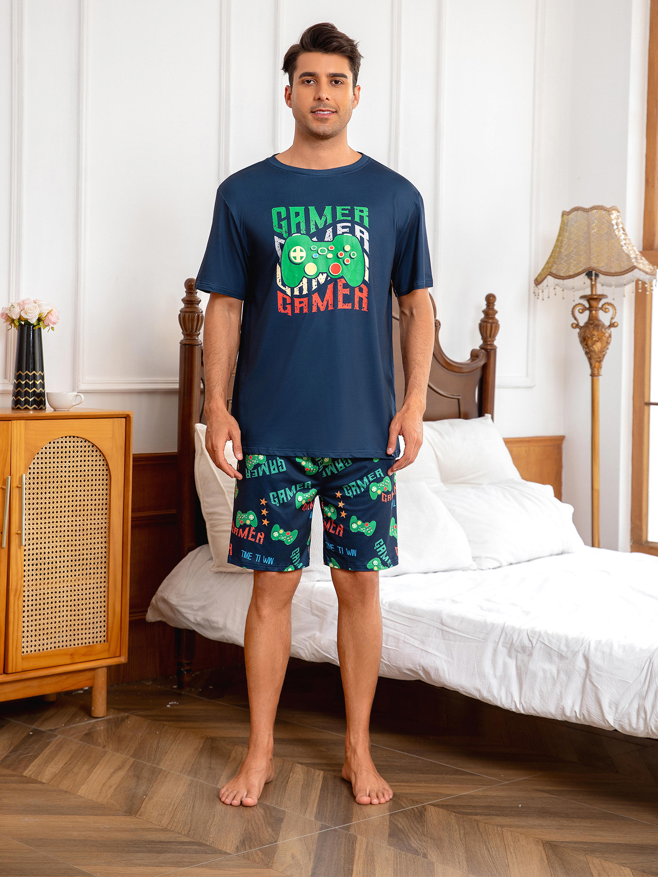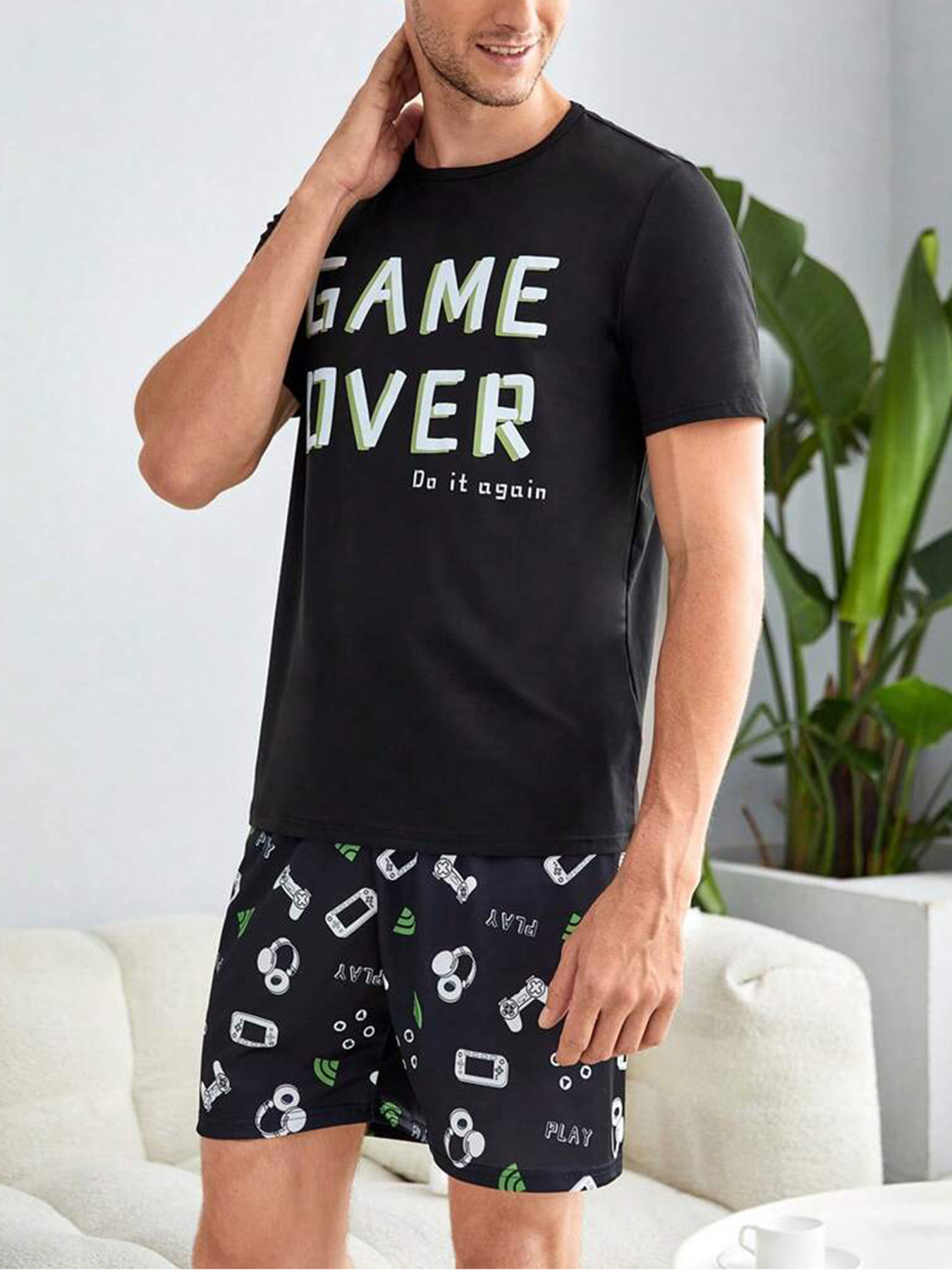 국경 간 대외 무역 남자 잠옷 여름 모조 면 캐주얼 라운드 넥 반팔 반바지 느슨한 홈 의류 세트 착용스토어 가기