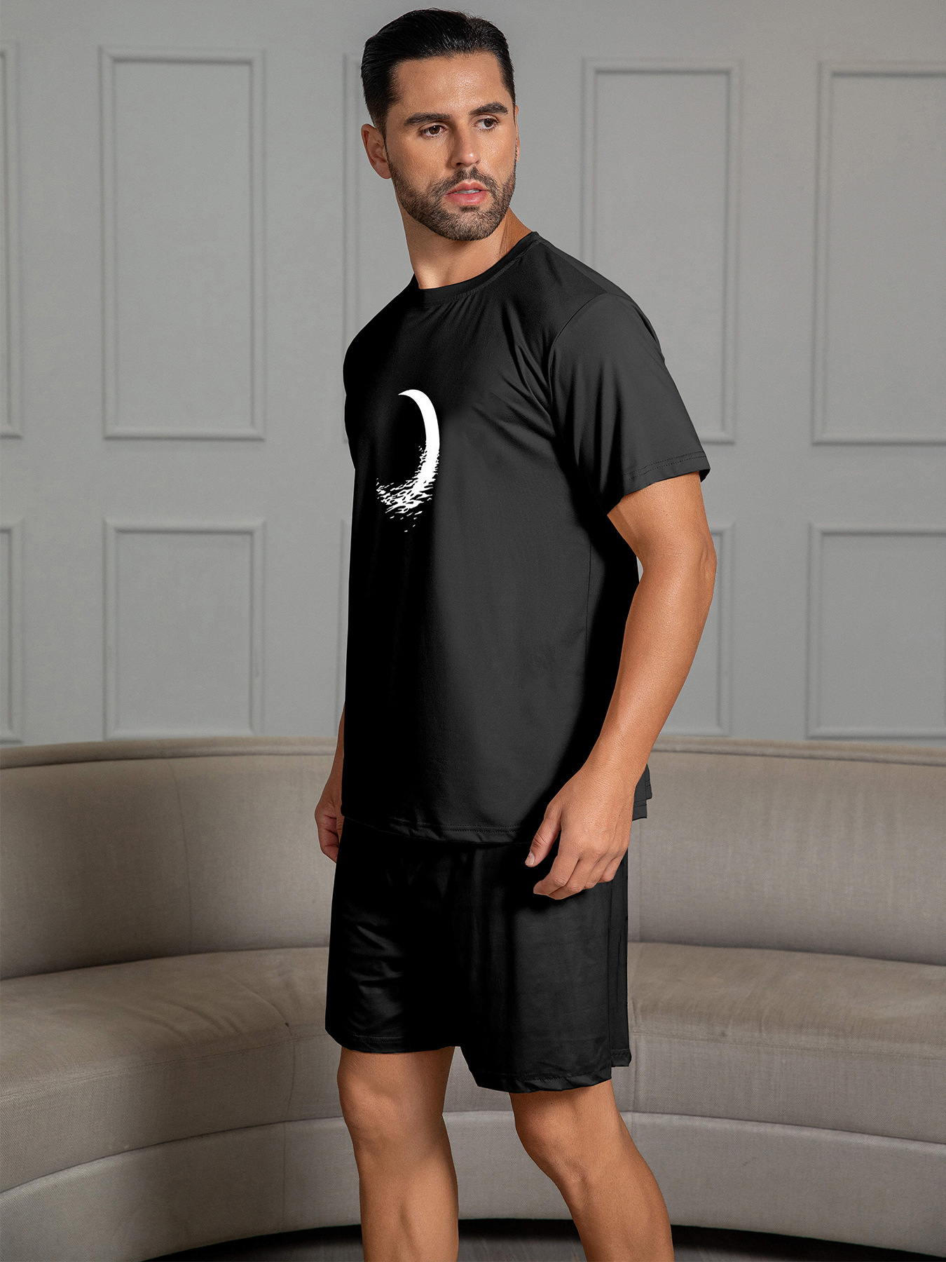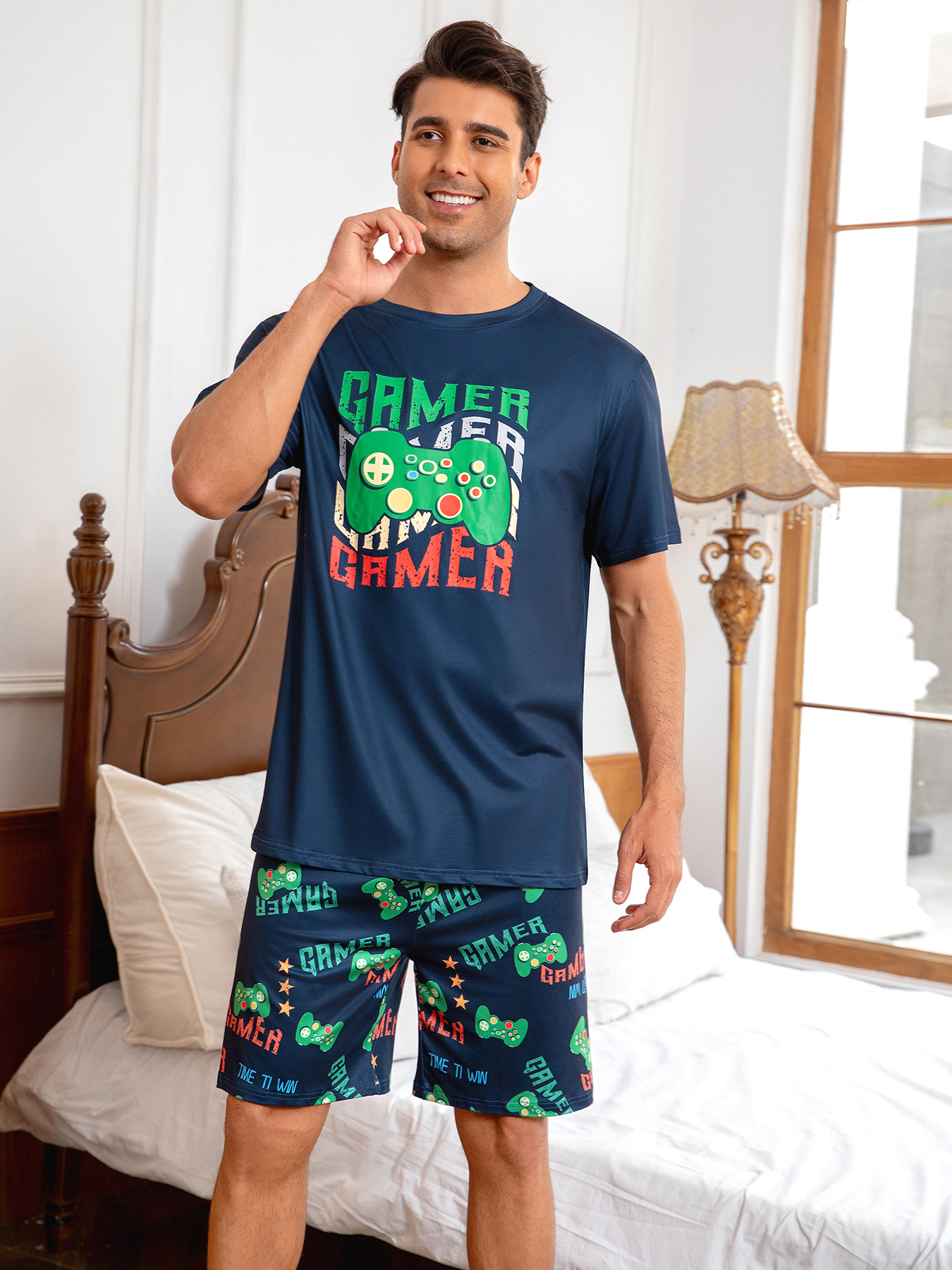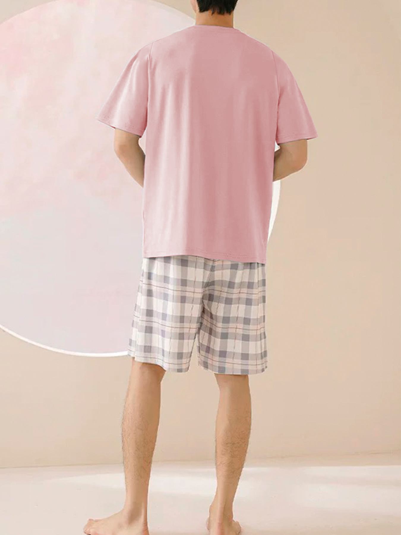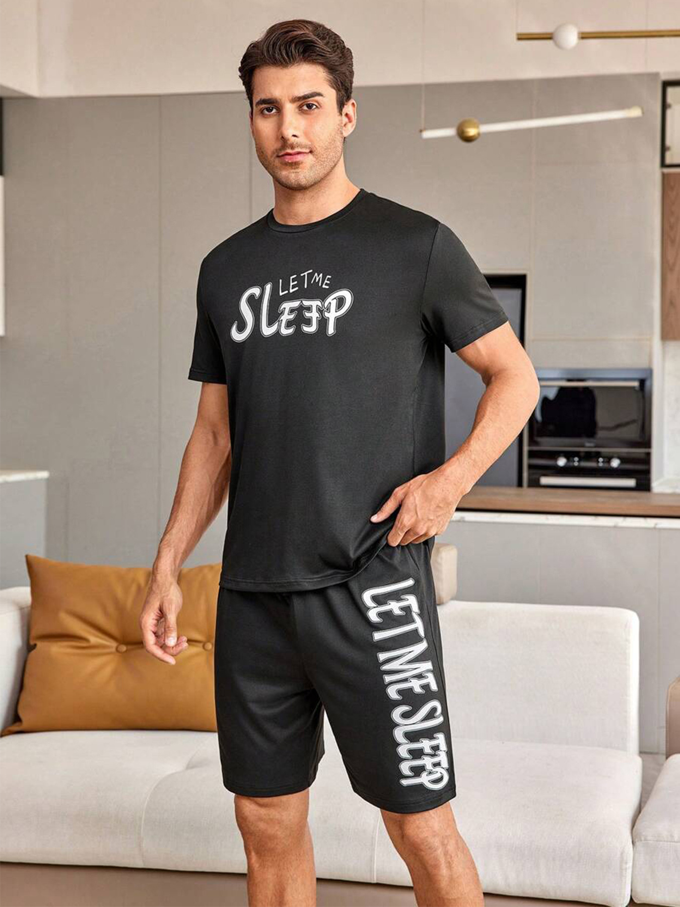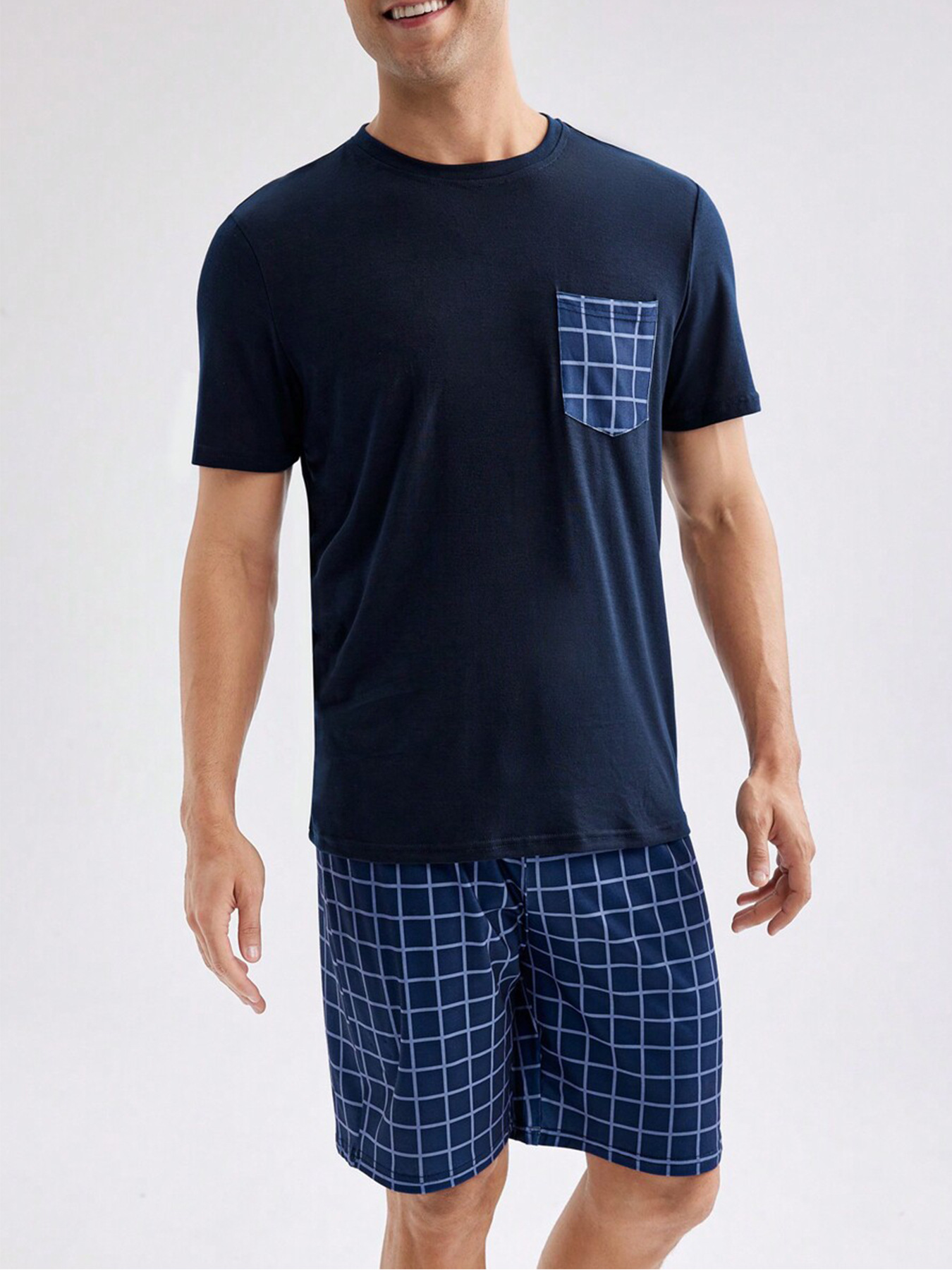 국경 간 대외 무역 남자 잠옷 여름 모조 면 캐주얼 라운드 넥 반팔 반바지 느슨한 홈 의류 세트 착용스토어 가기