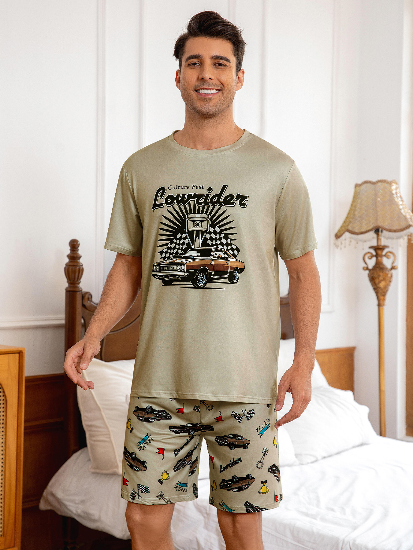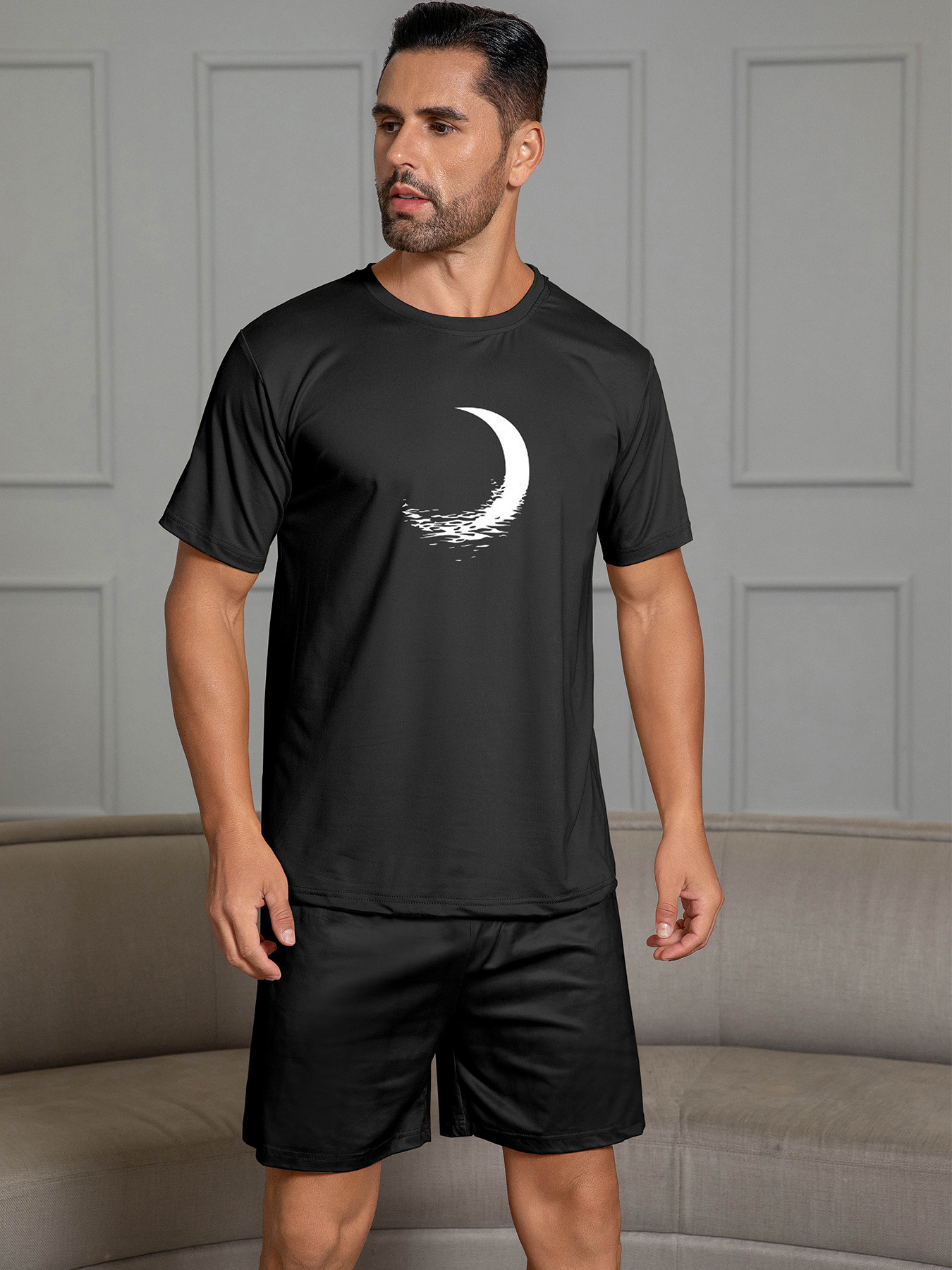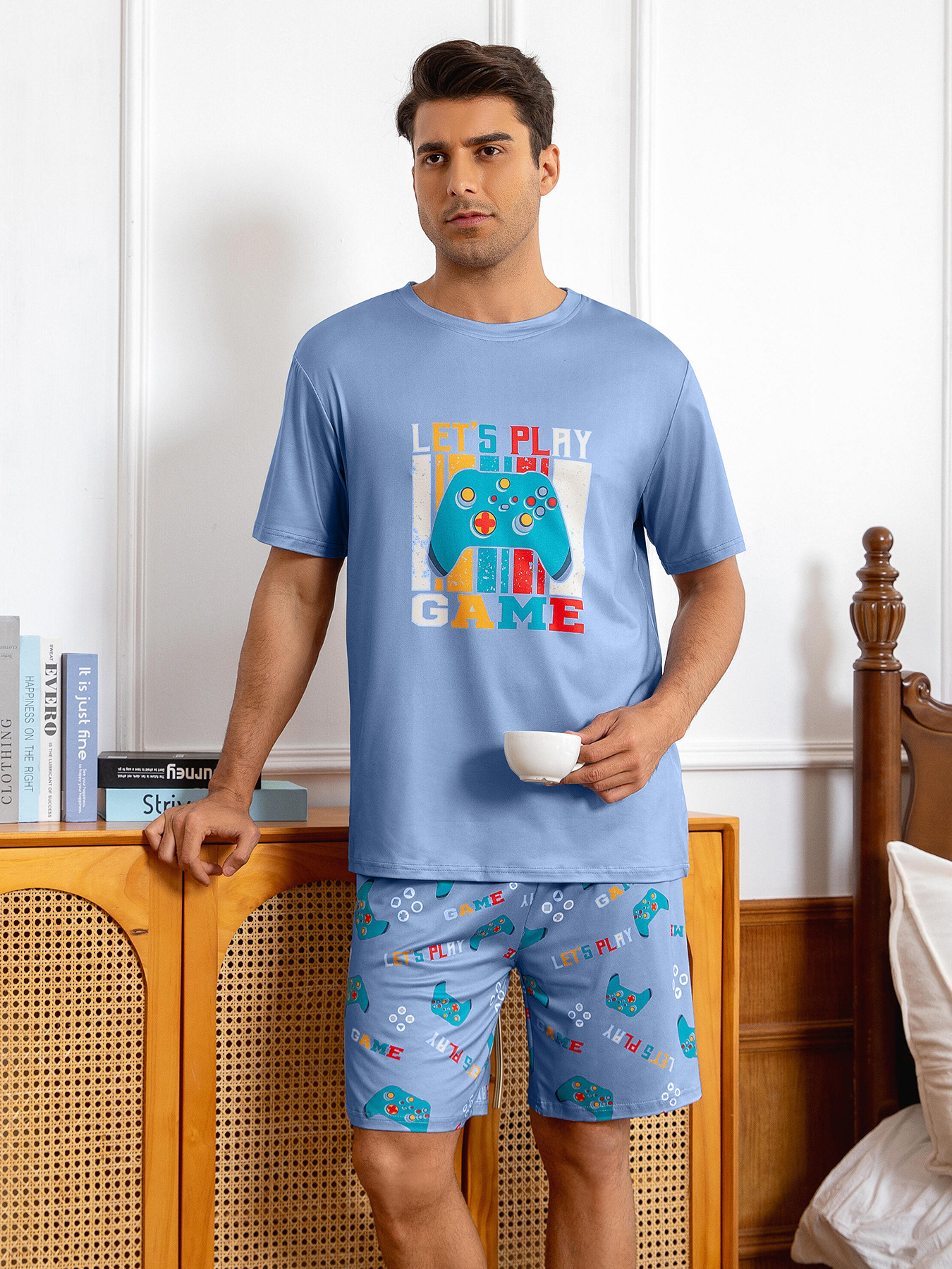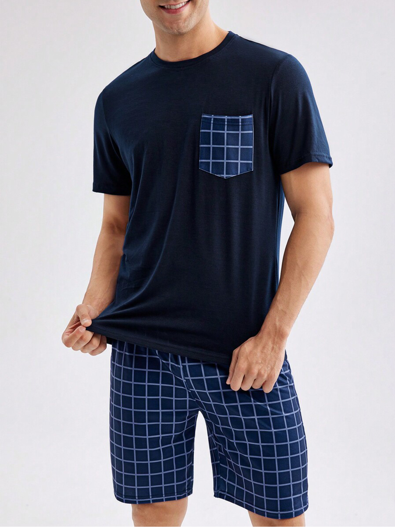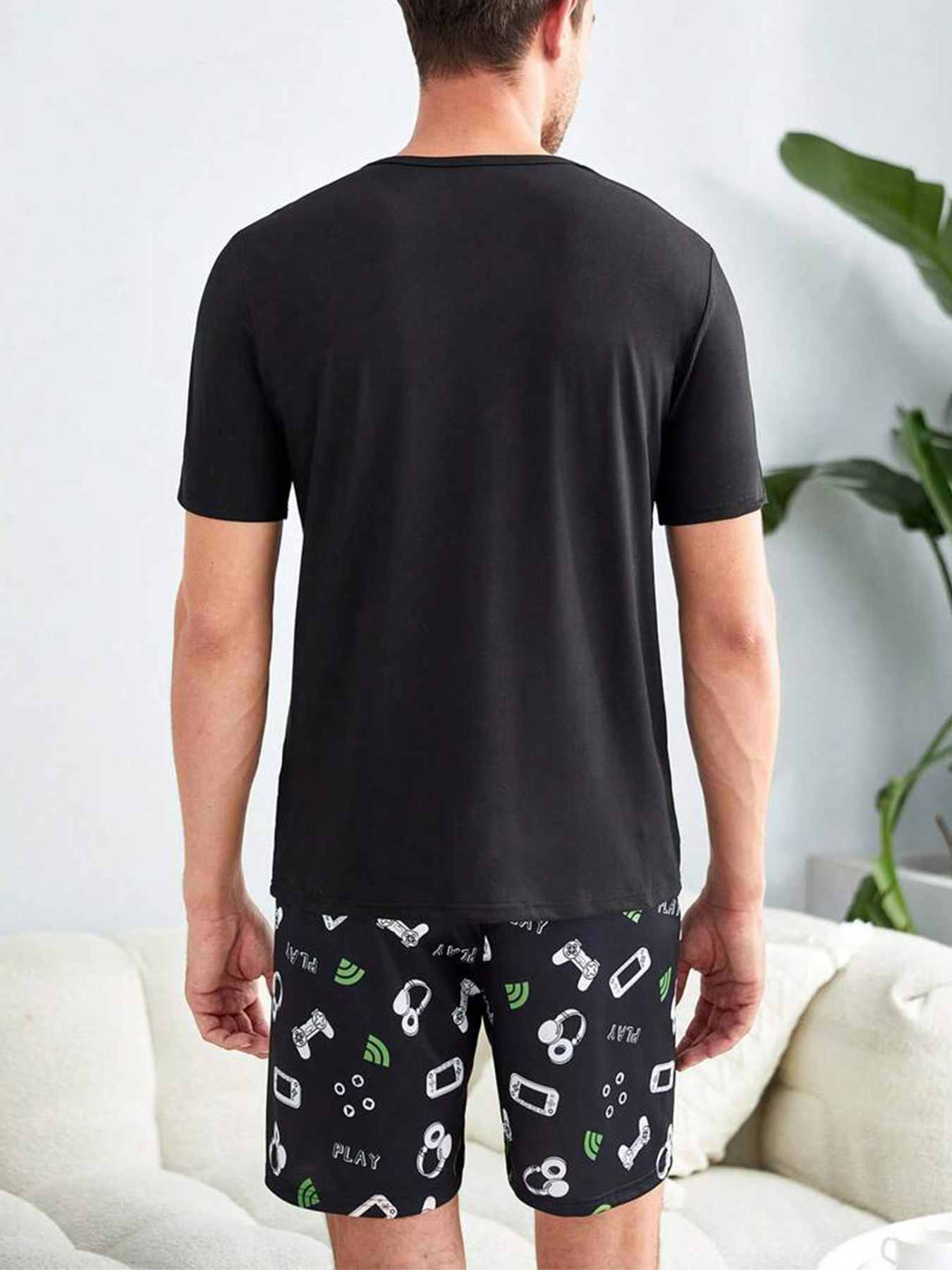 국경 간 대외 무역 남자 잠옷 여름 모조 면 캐주얼 라운드 넥 반팔 반바지 느슨한 홈 의류 세트 착용스토어 가기