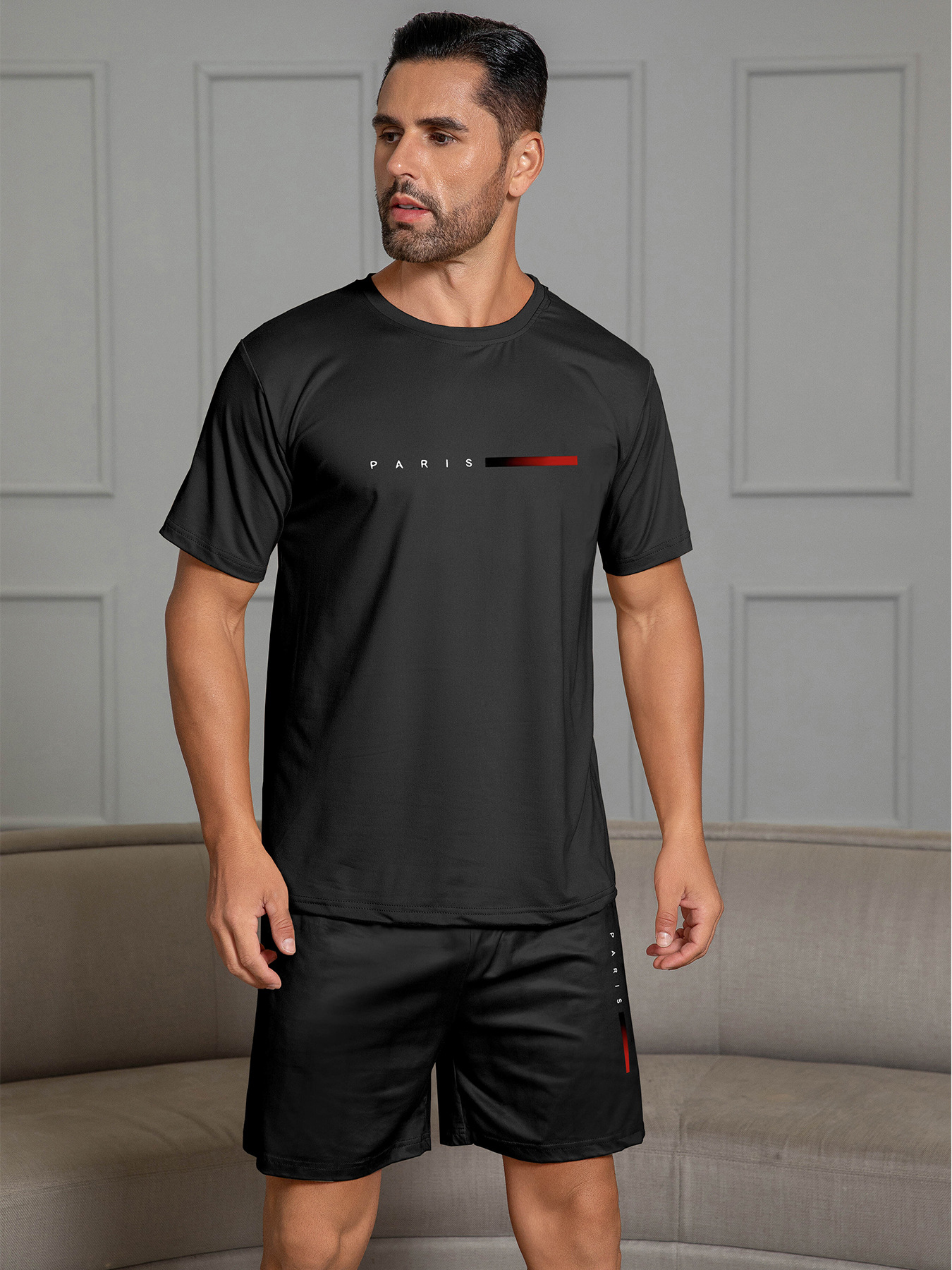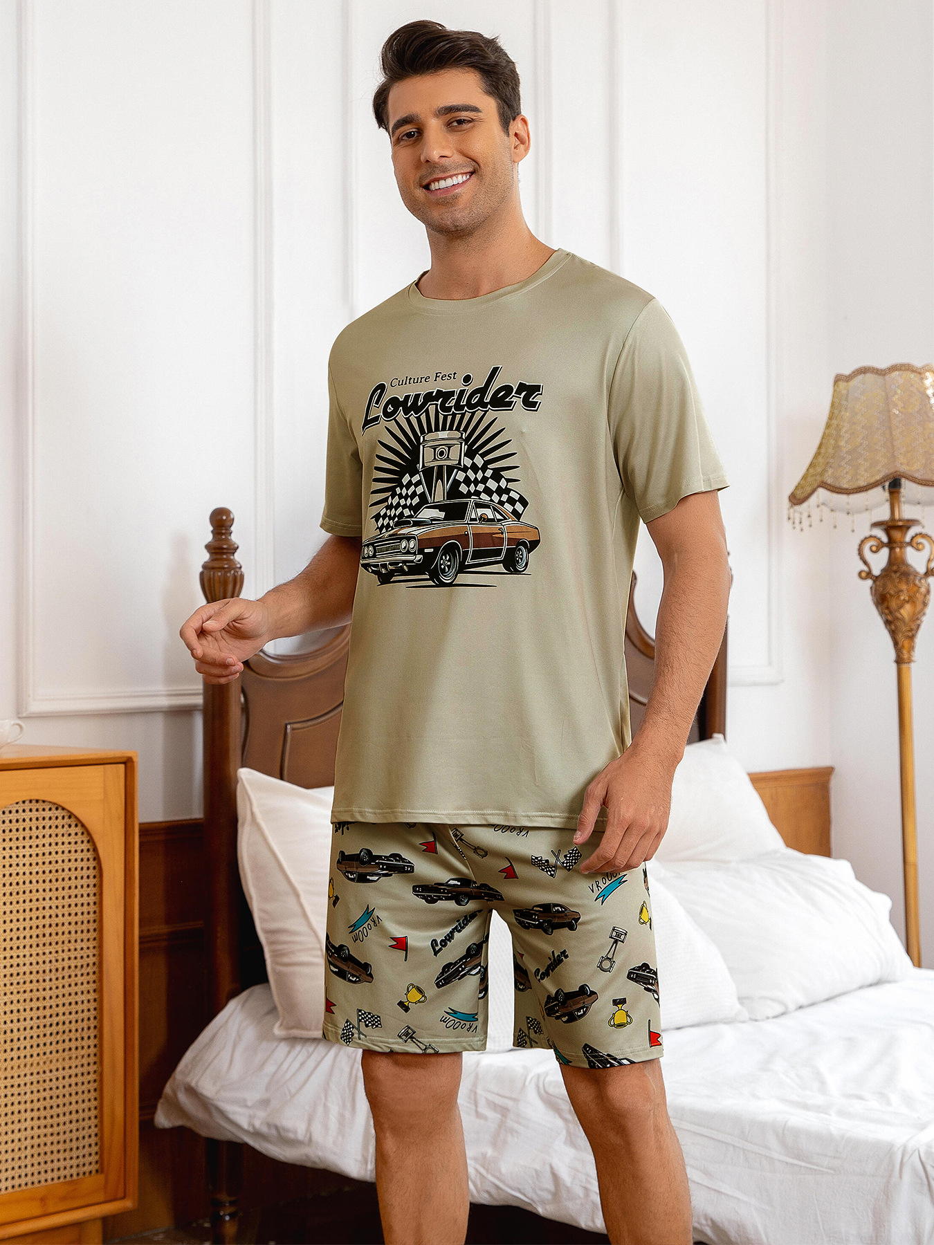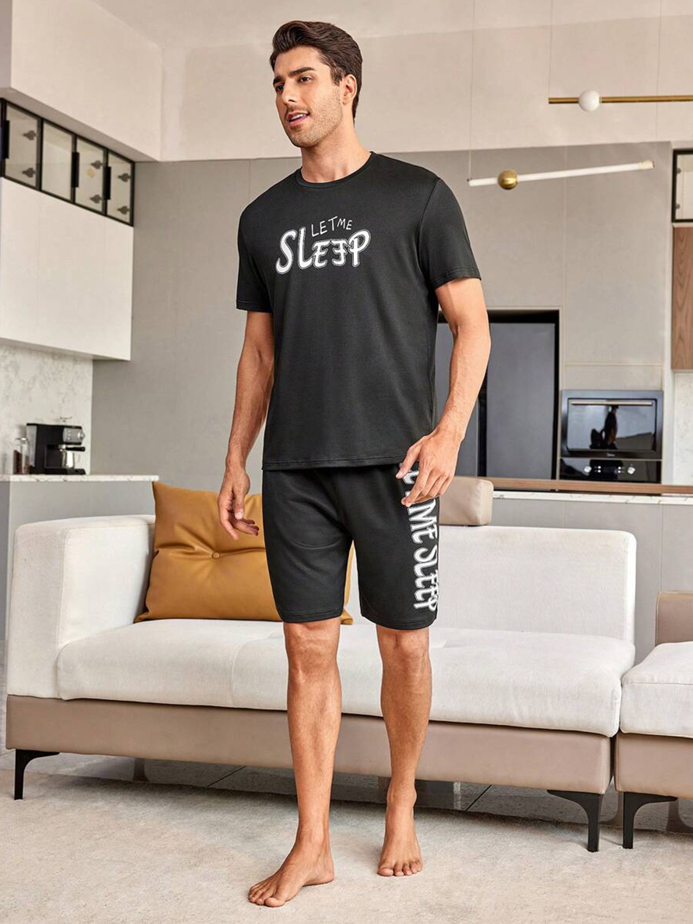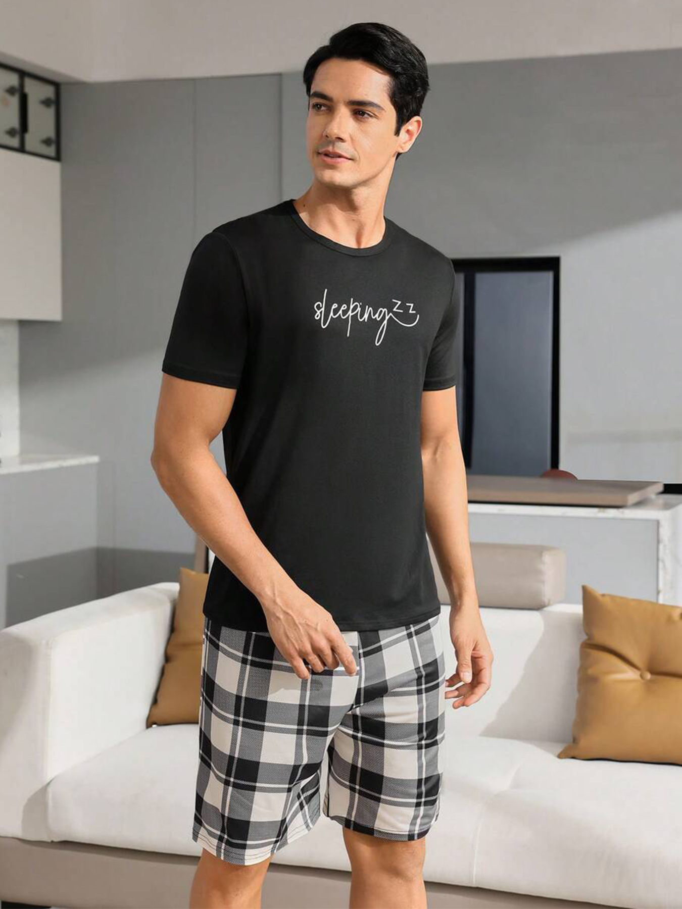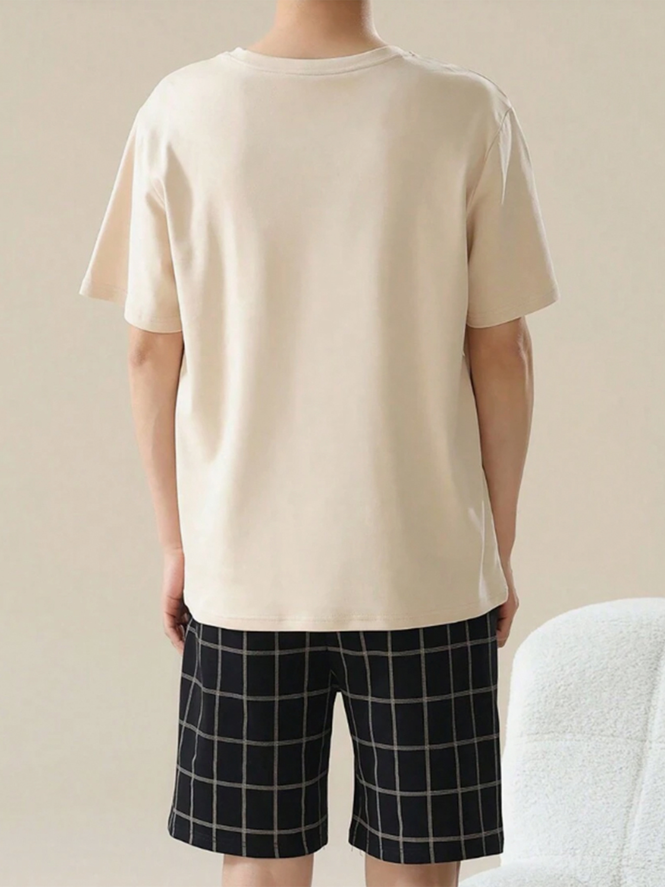 국경 간 대외 무역 남자 잠옷 여름 모조 면 캐주얼 라운드 넥 반팔 반바지 느슨한 홈 의류 세트 착용스토어 가기