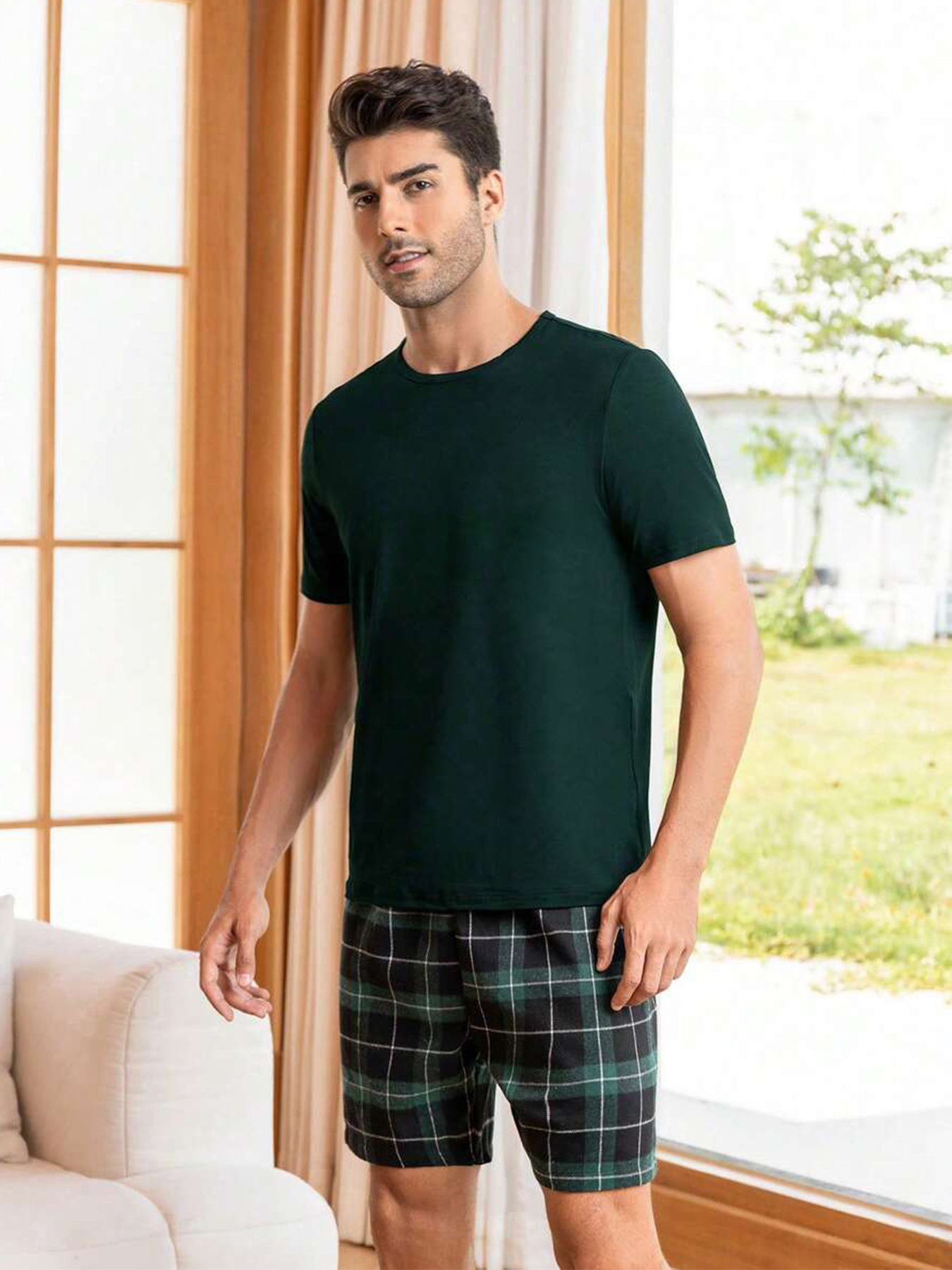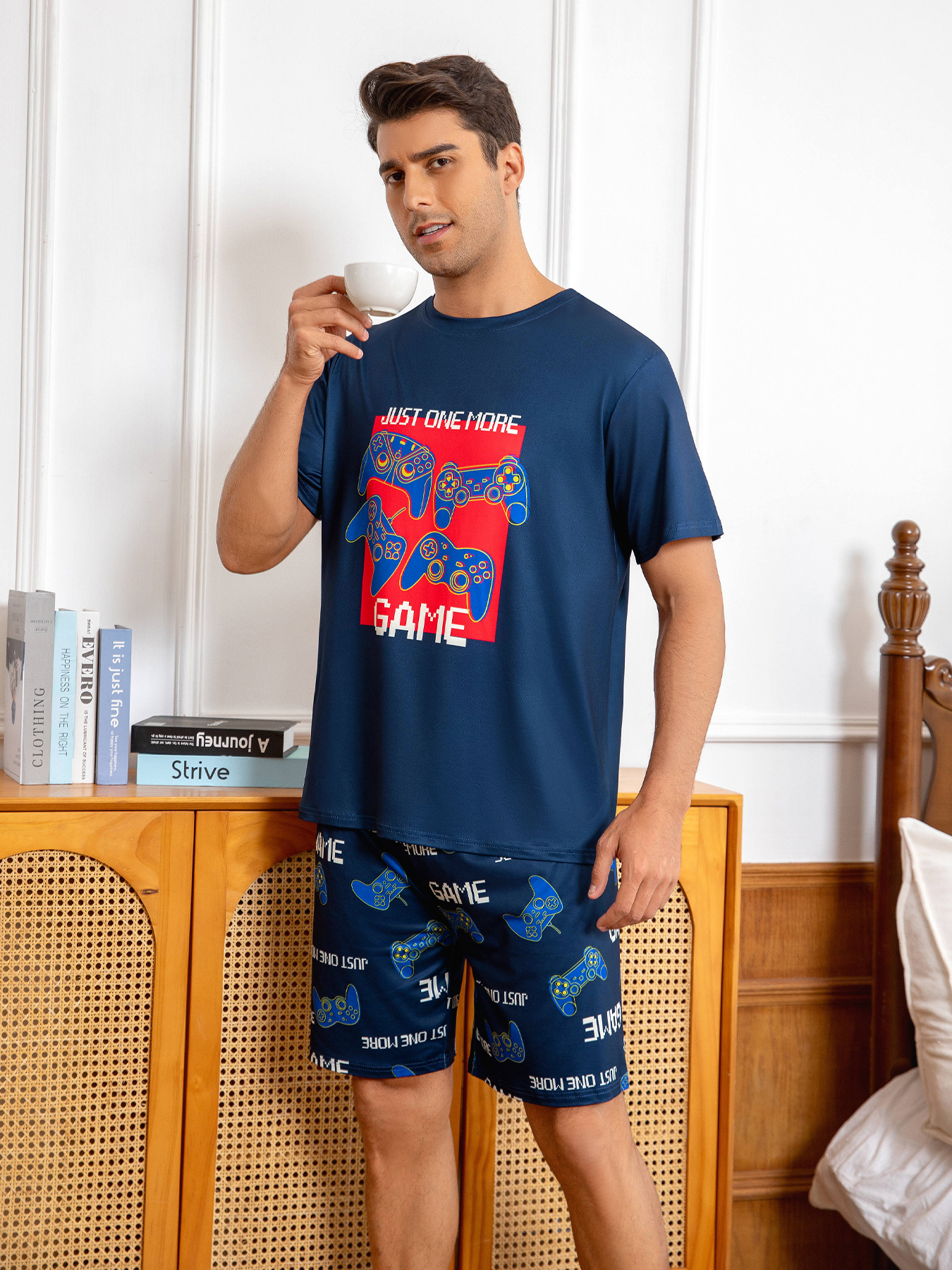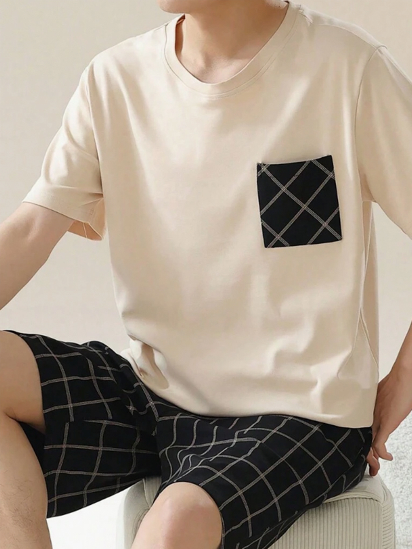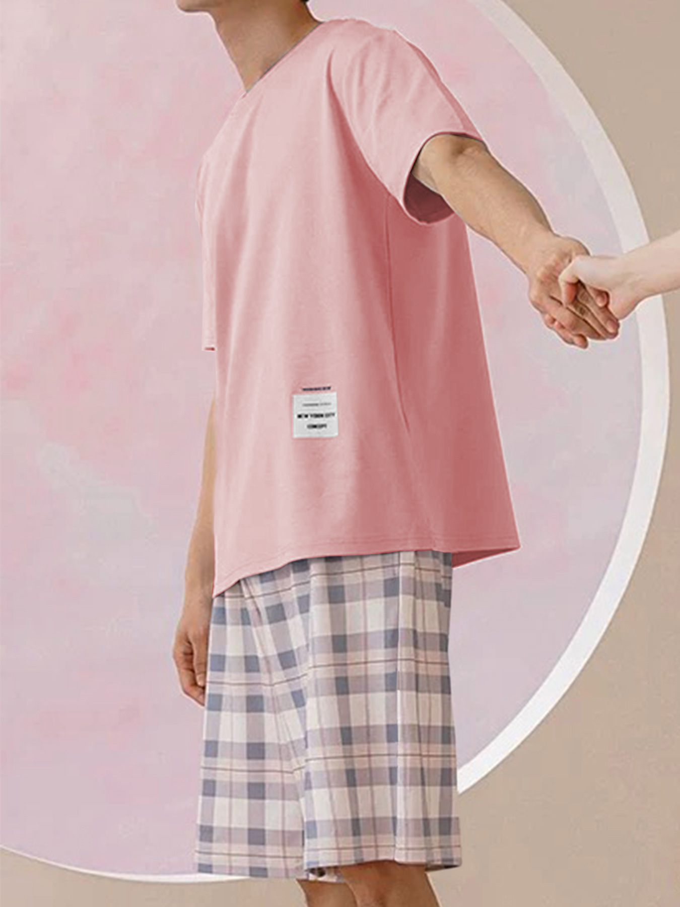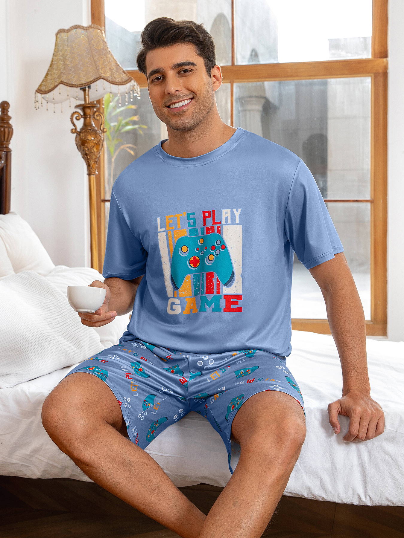 국경 간 대외 무역 남자 잠옷 여름 모조 면 캐주얼 라운드 넥 반팔 반바지 느슨한 홈 의류 세트 착용스토어 가기