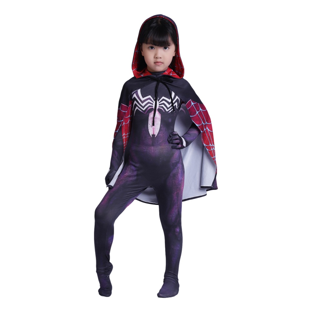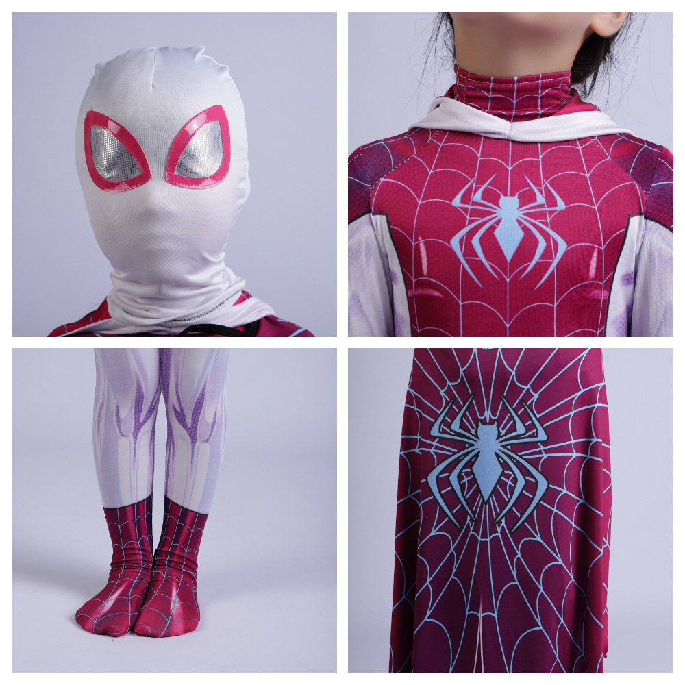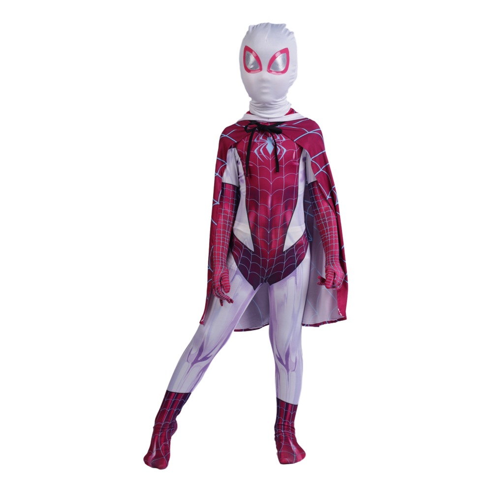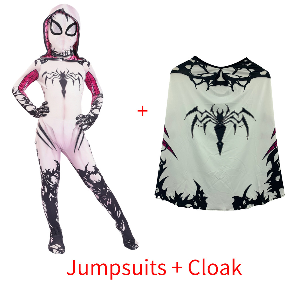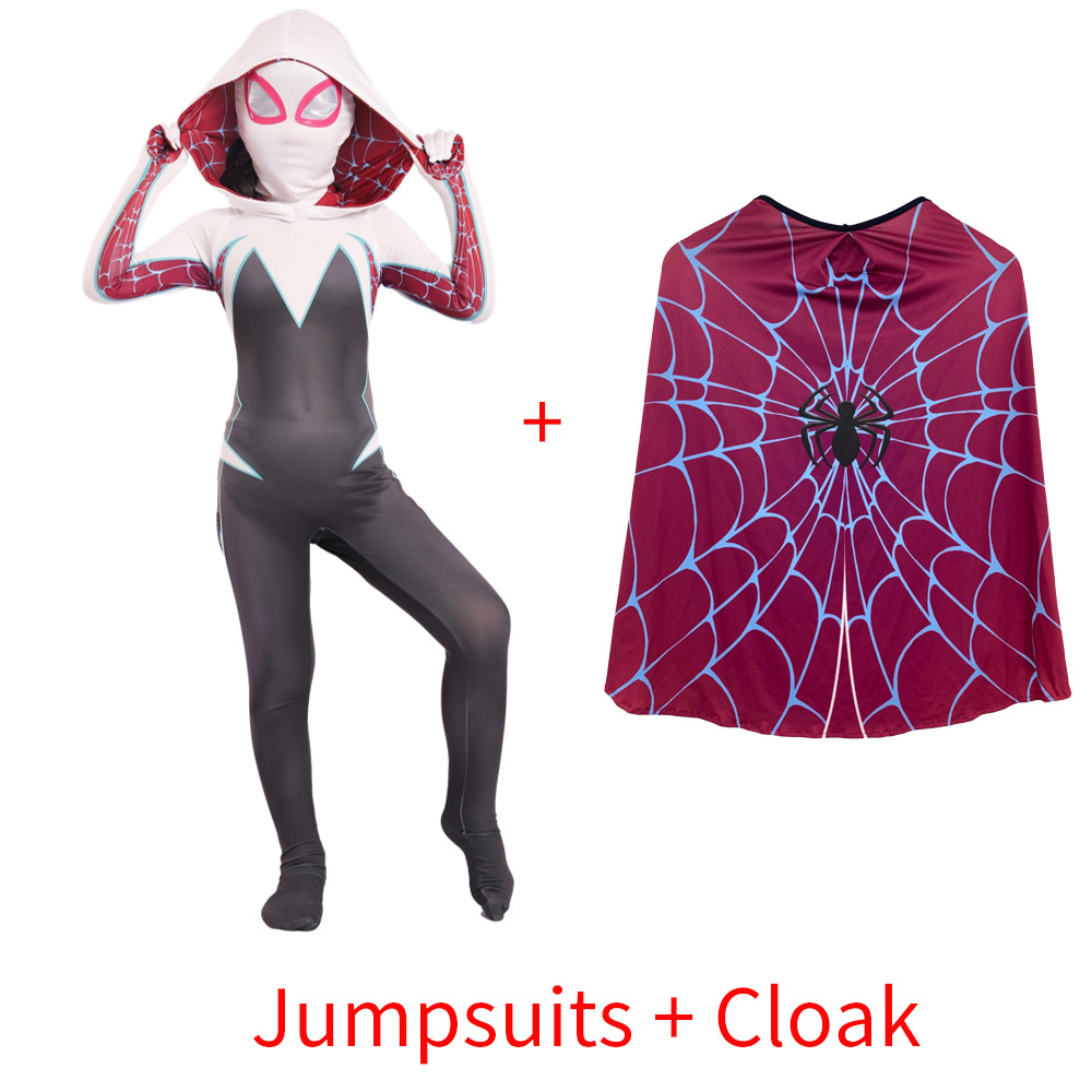 평행 우주 그웬 스파이더 맨 타이트 키즈 할로윈 코스프레 의상 거미 망토 밀크 실크