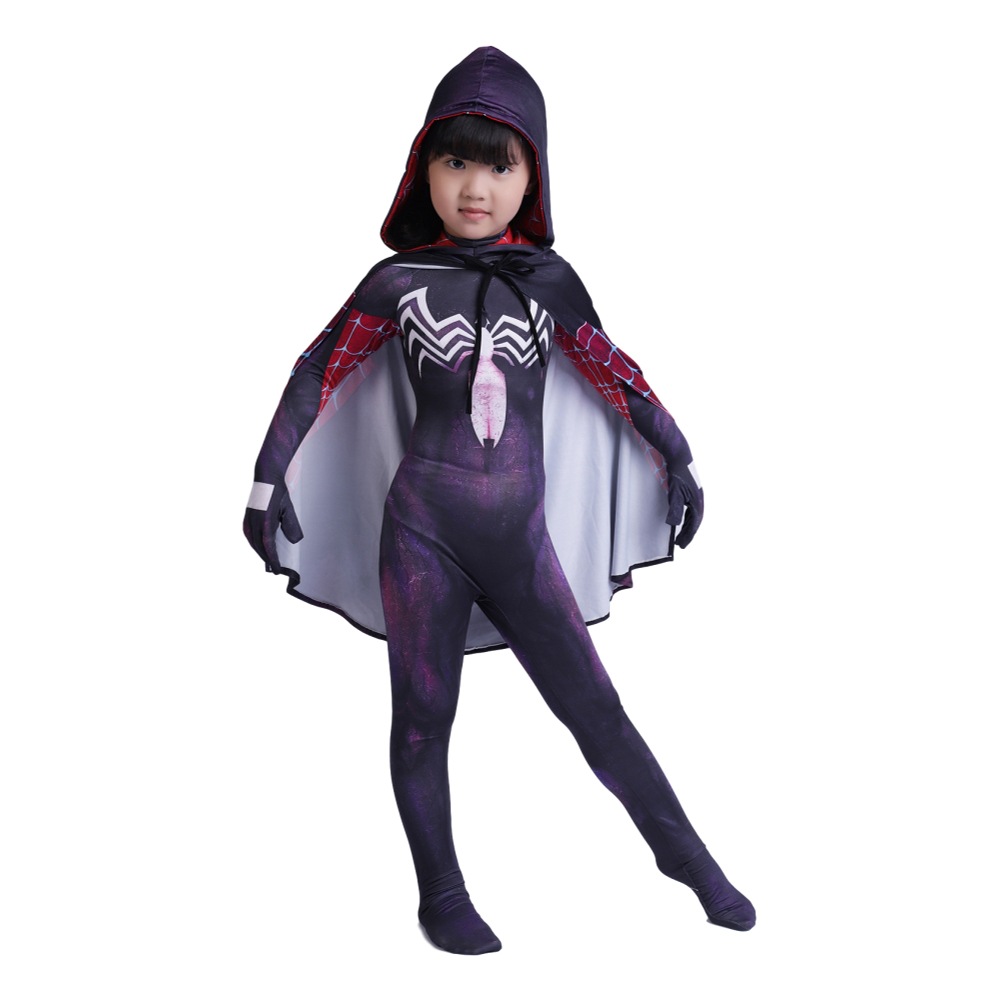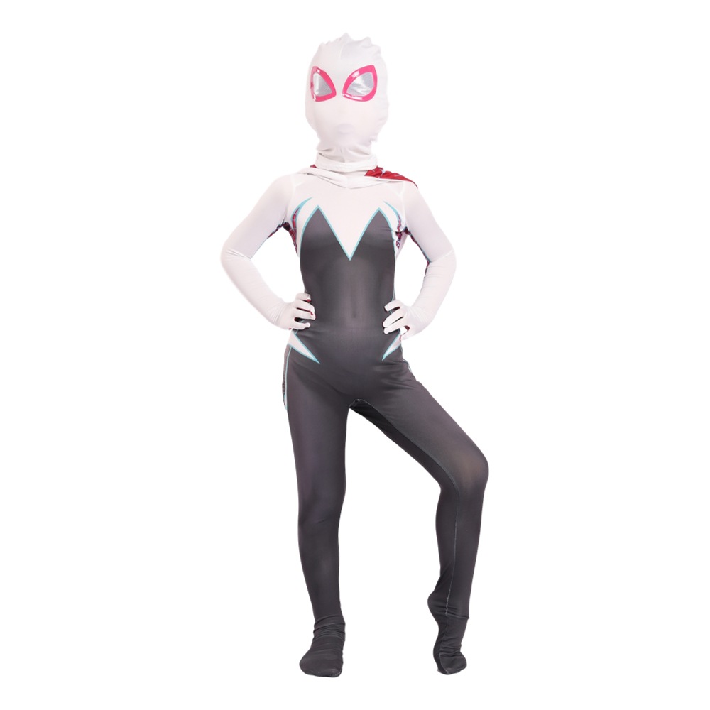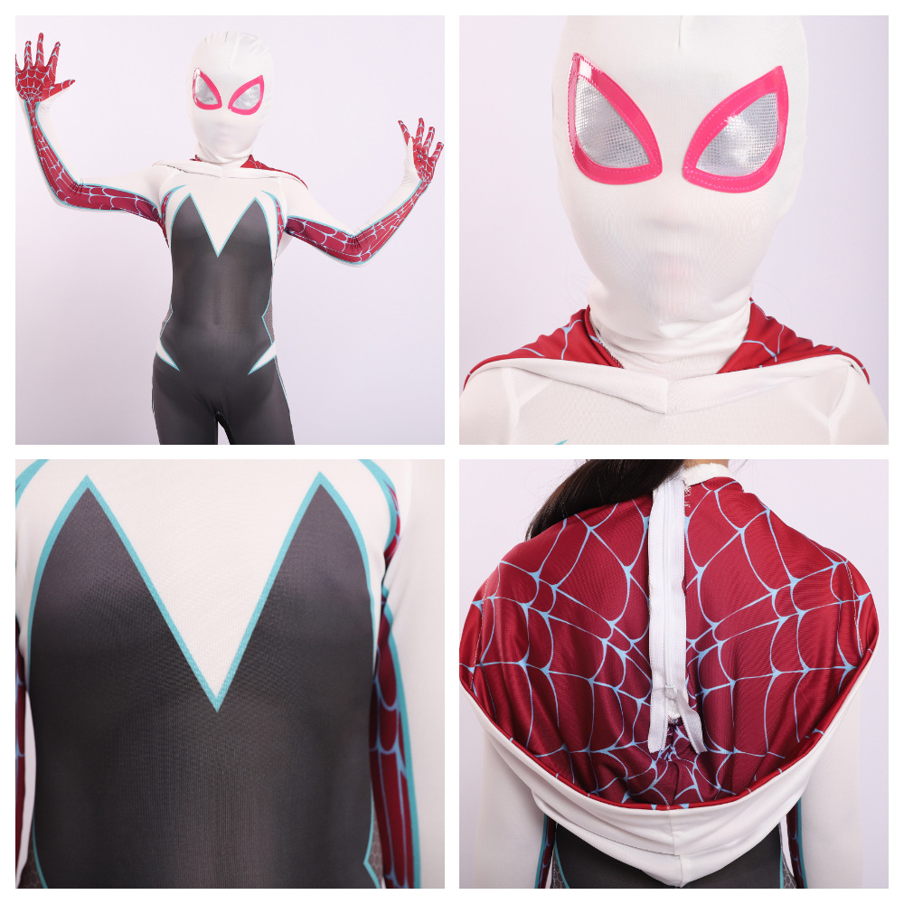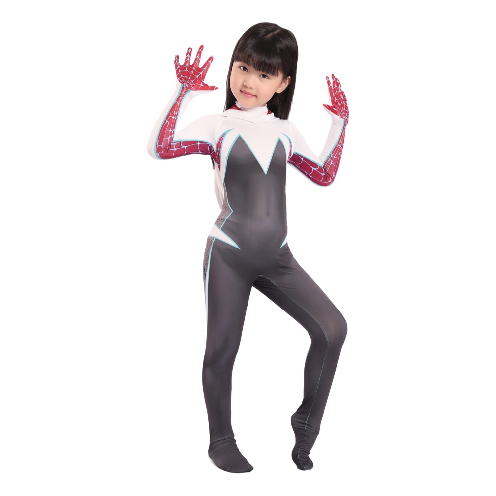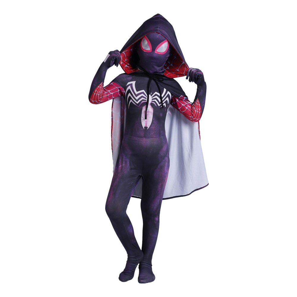 평행 우주 그웬 스파이더 맨 타이트 키즈 할로윈 코스프레 의상 거미 망토 밀크 실크