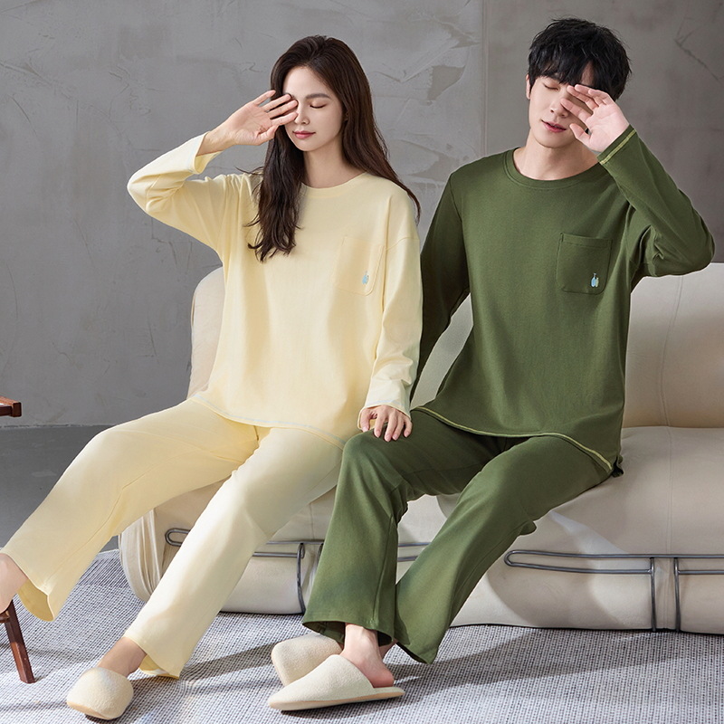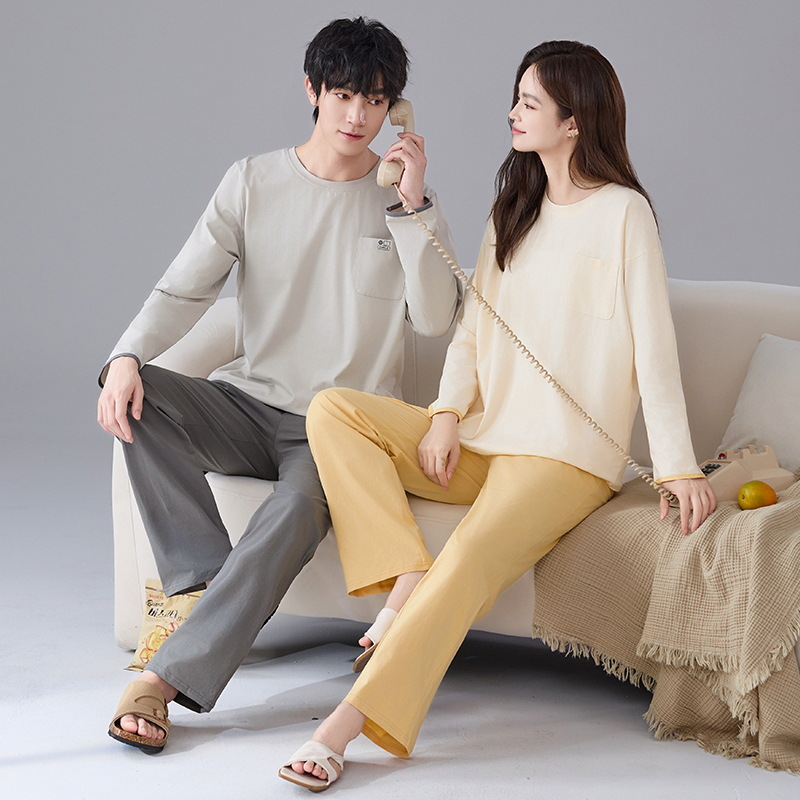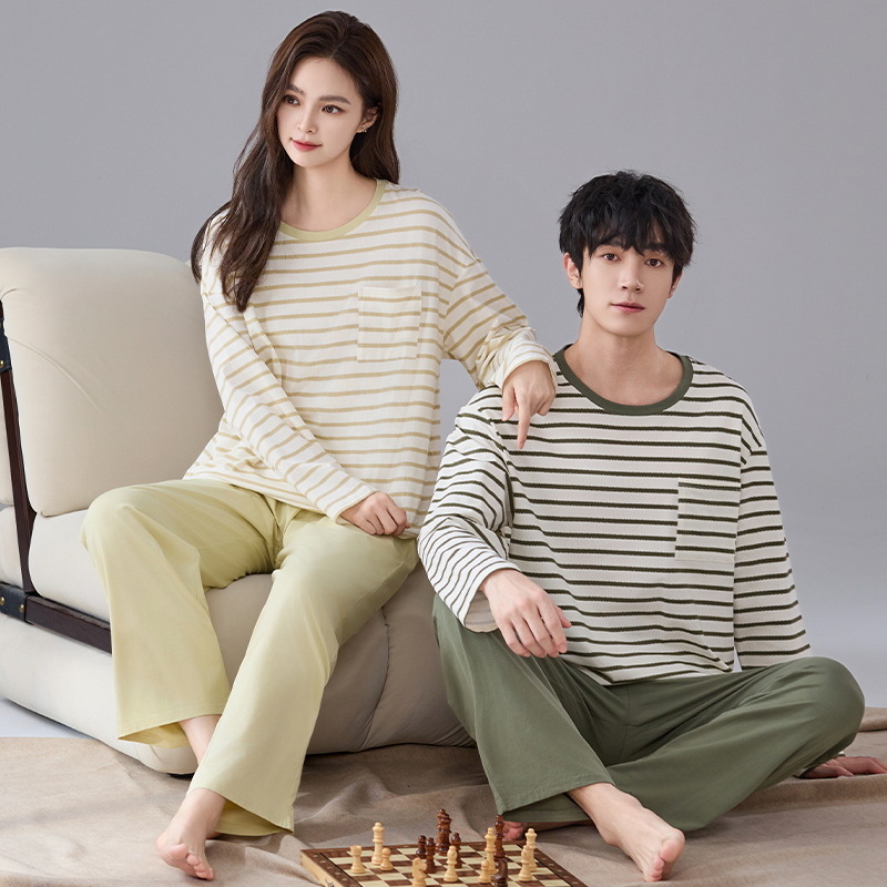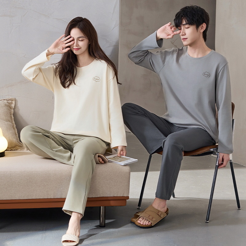 클래스 A 항균 100% 면 커플 잠옷 봄과 가을 여성의 긴 소매 둥근 목 플러스 사이즈 면 홈 옷