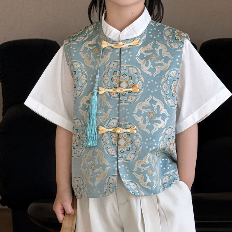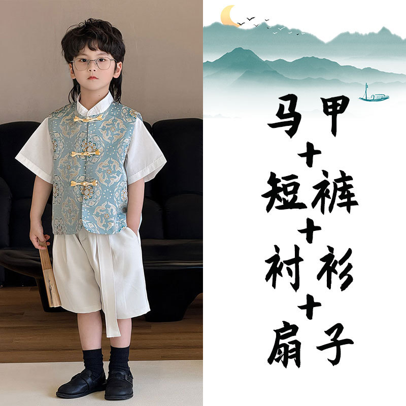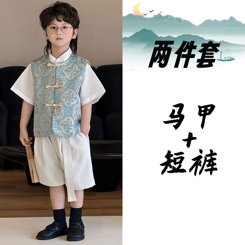 어린이 2025 년 여름 새로운 양복 조끼 반바지 새로운 중국 소년 탕 세트 한 세트 잘 생긴 국가 스타일스토어 가기