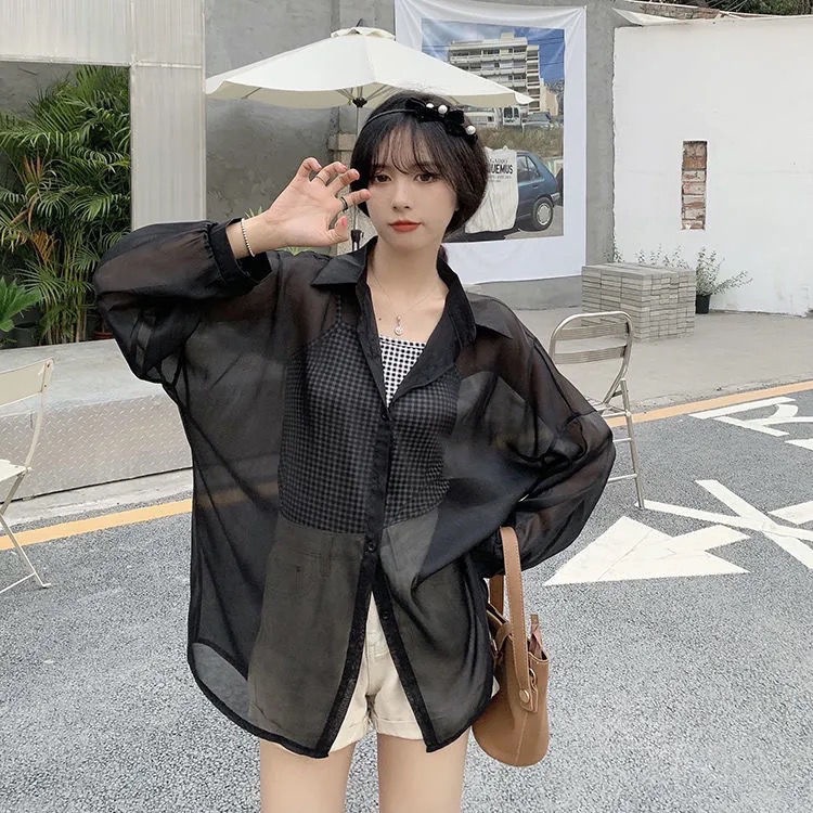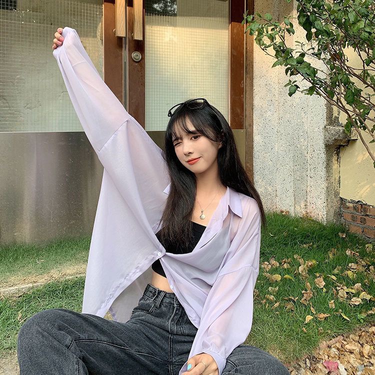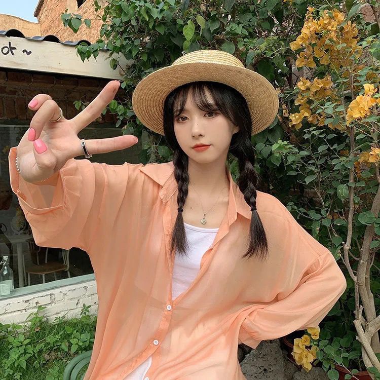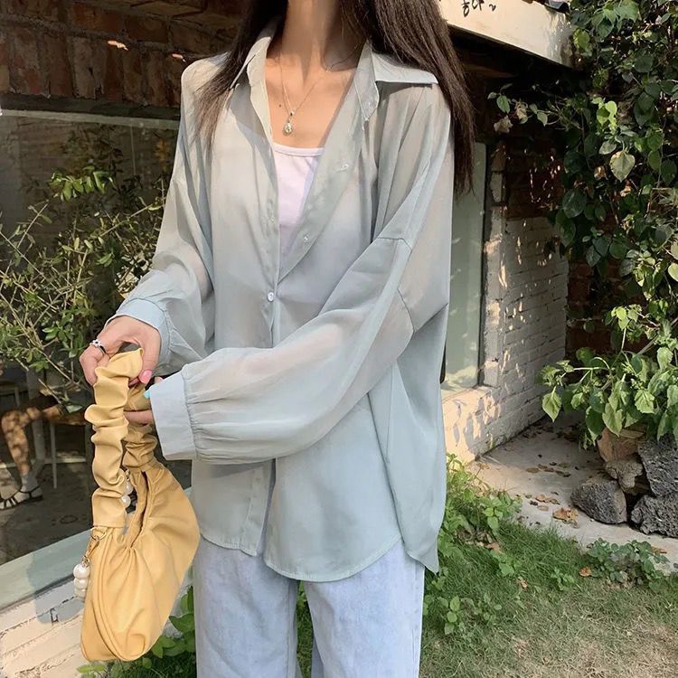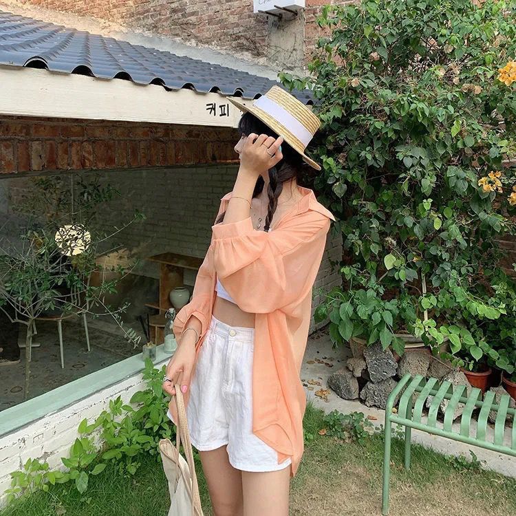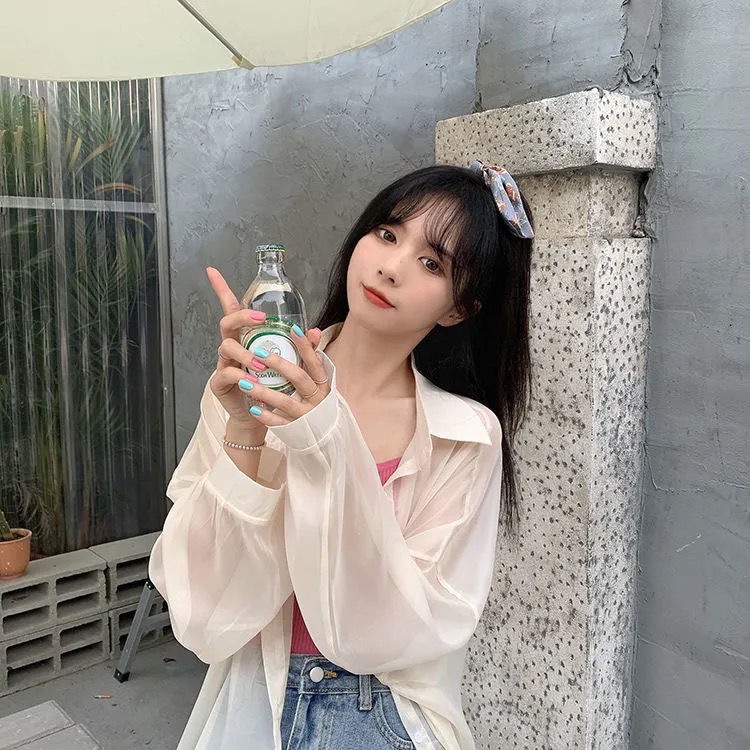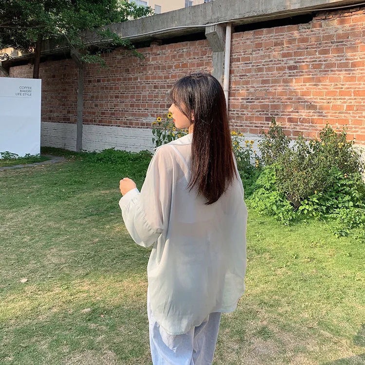 단색 선 스크린 쉬폰 셔츠 재킷 여성의 얇은 2023 새로운 여름 디자인 센스 달콤한 긴 소매 탑스토어 가기