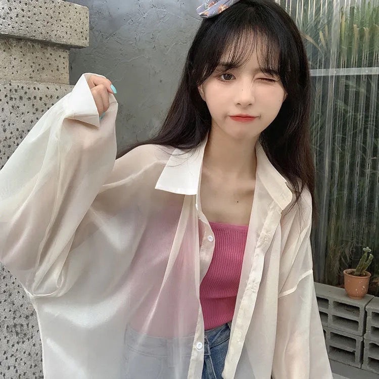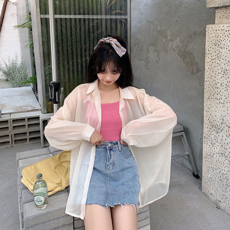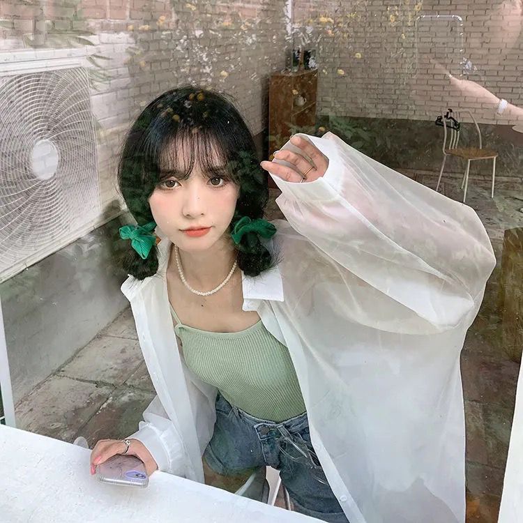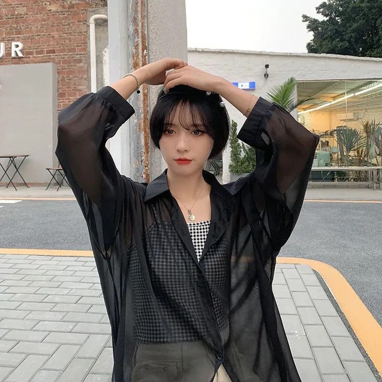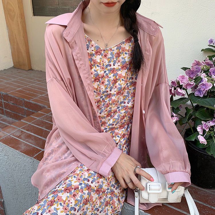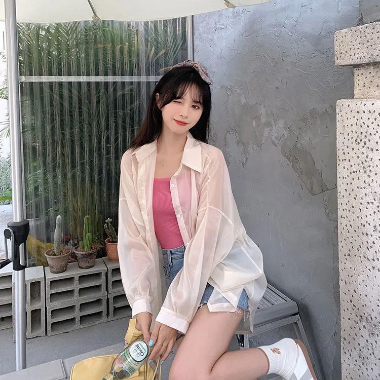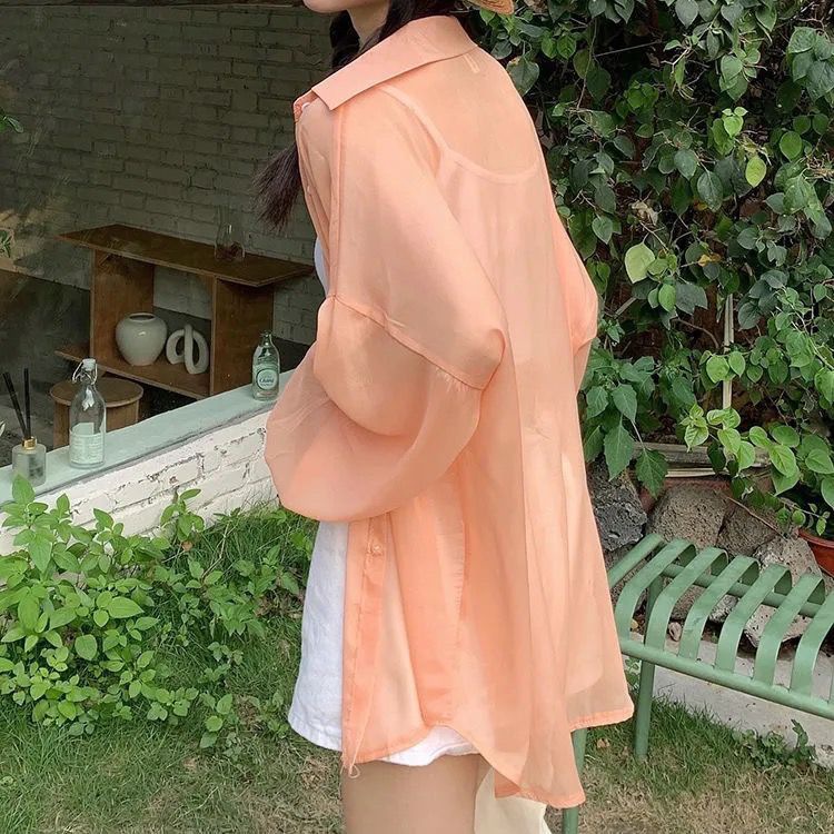 단색 선 스크린 쉬폰 셔츠 재킷 여성의 얇은 2023 새로운 여름 디자인 센스 달콤한 긴 소매 탑스토어 가기