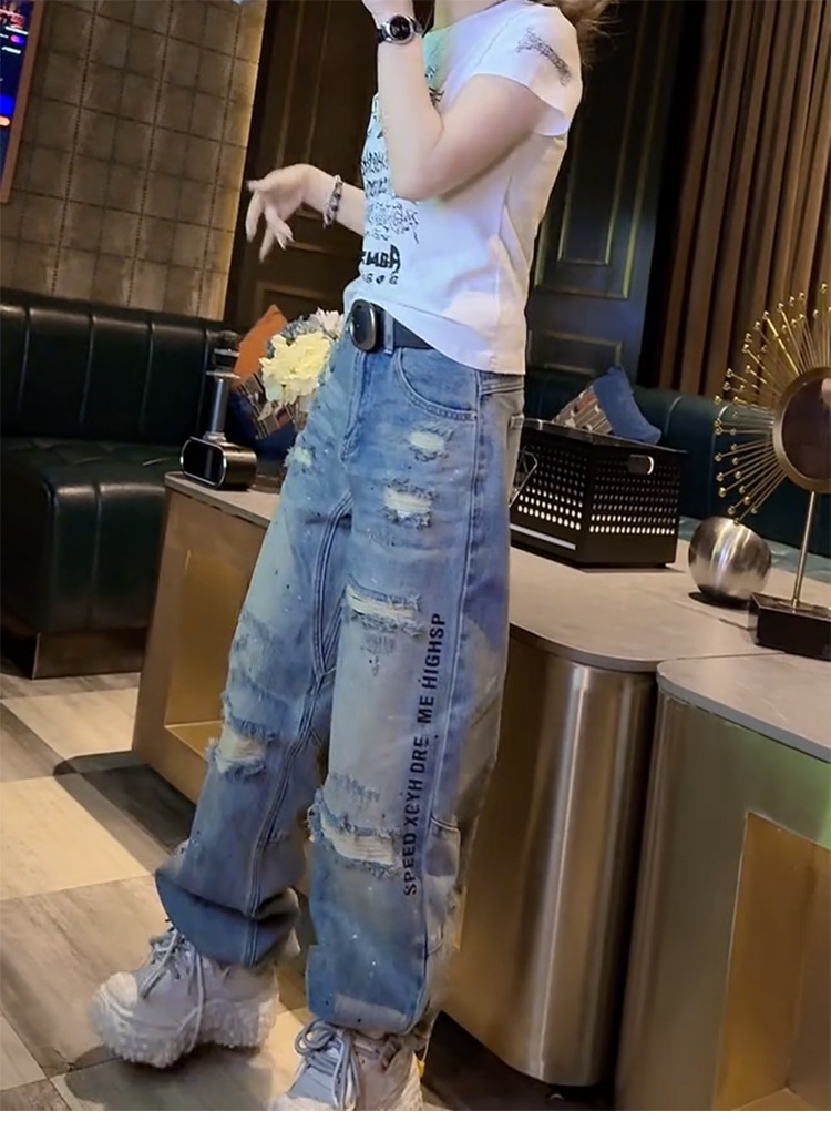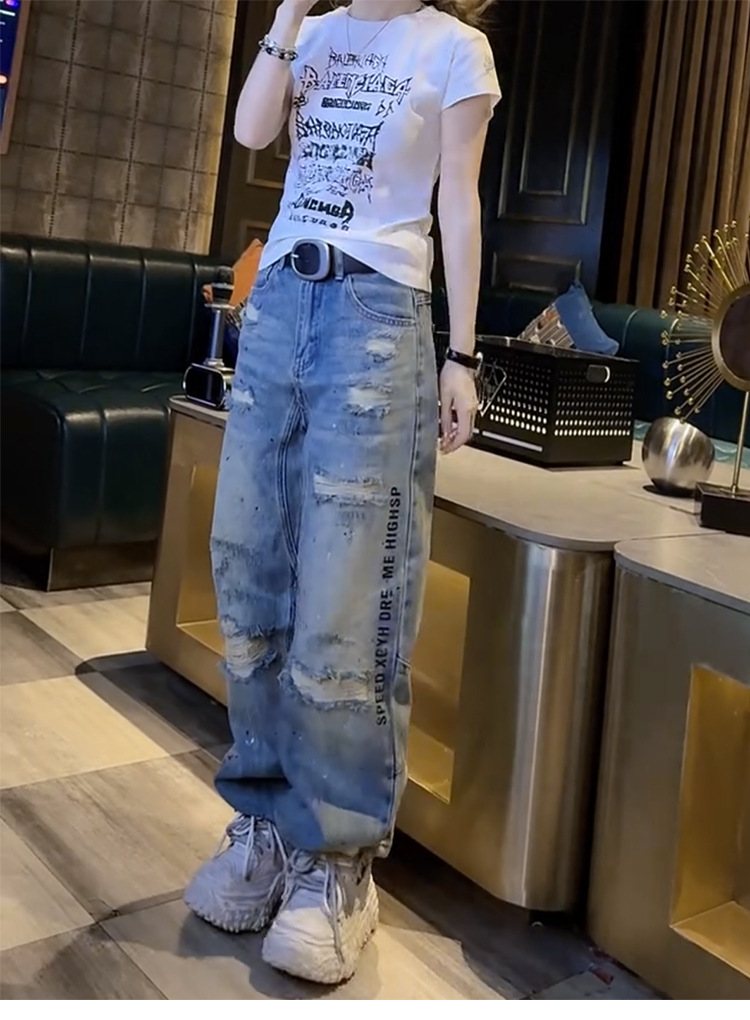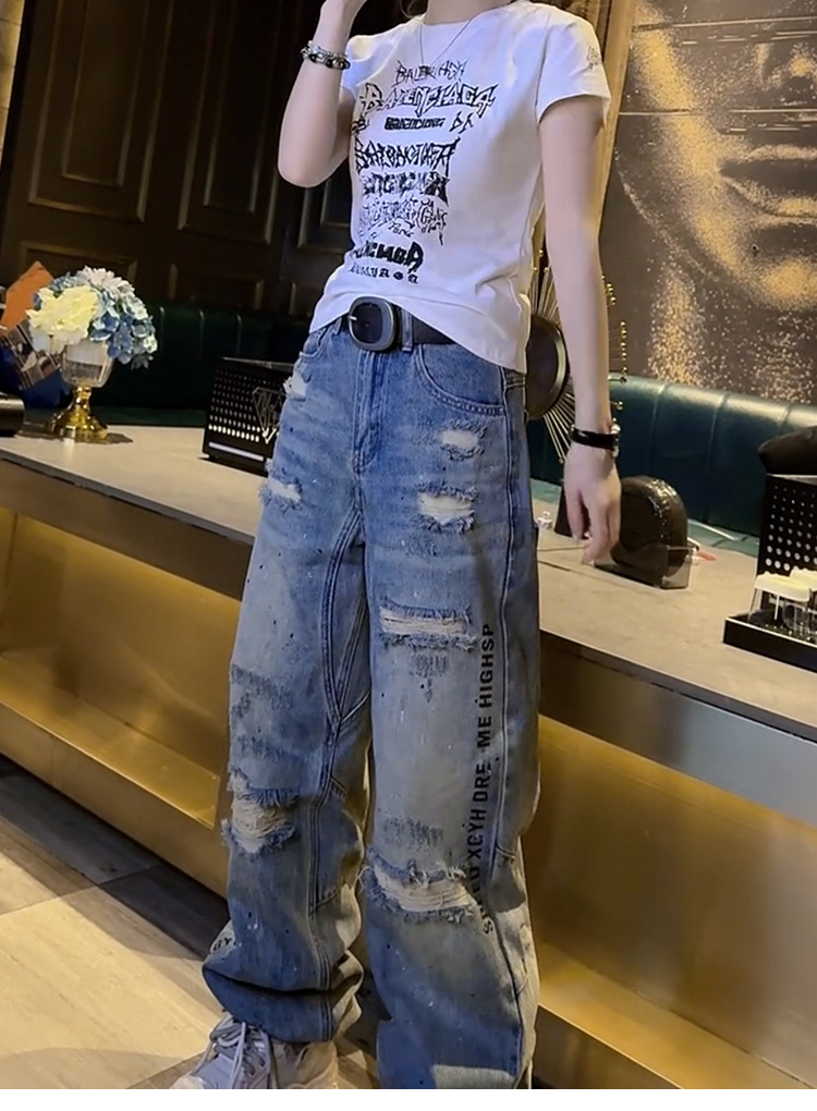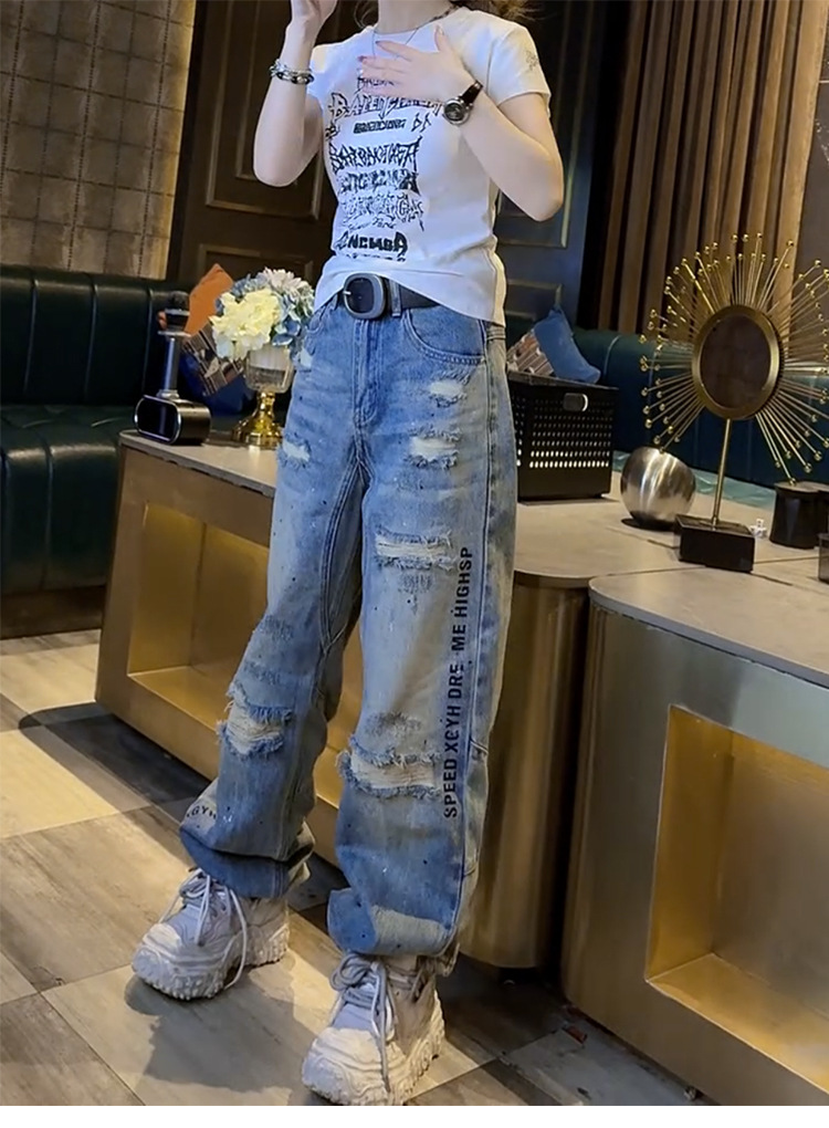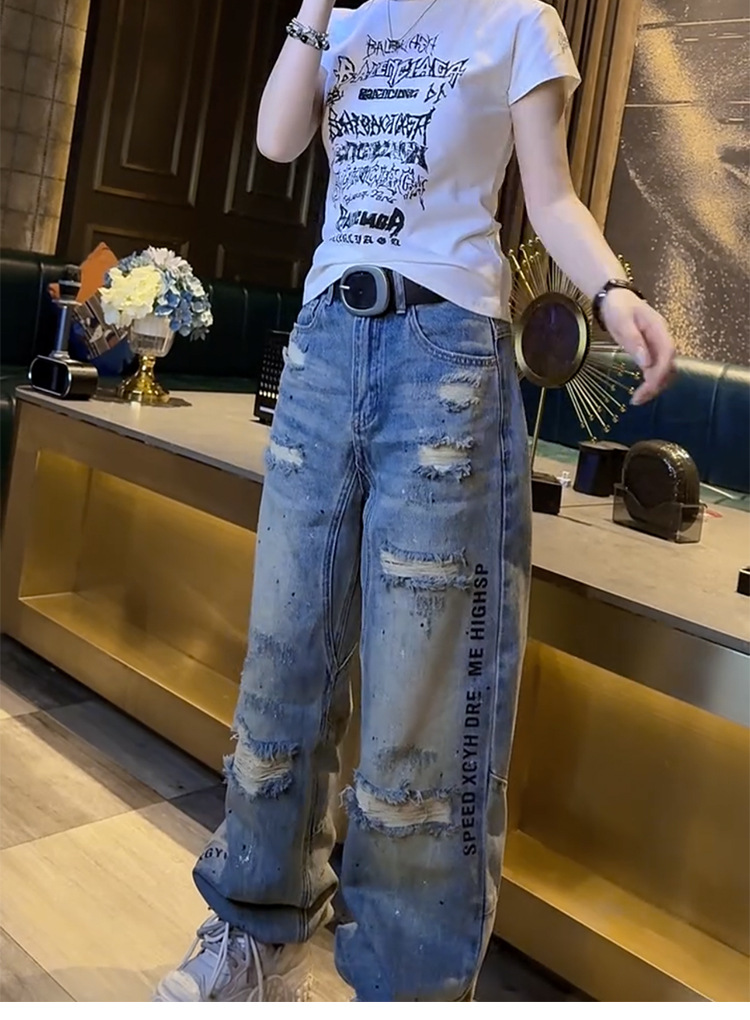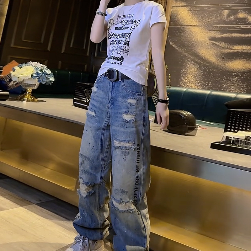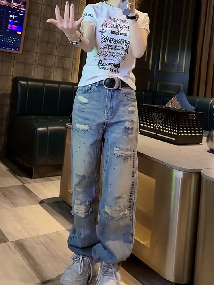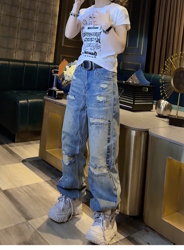 플러스 사이즈 찢어진 스트레이트 청바지 여자 봄 2025 새로운 높은 허리 통통녀 슬리밍 느슨한 시미 터 넓은 다리 바지스토어 가기