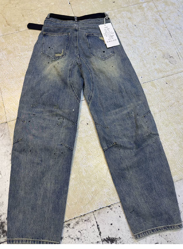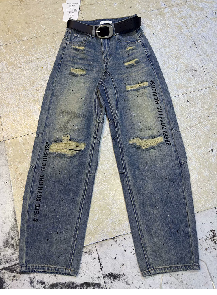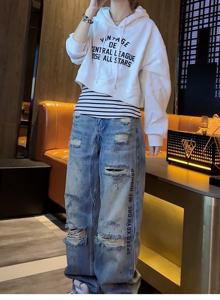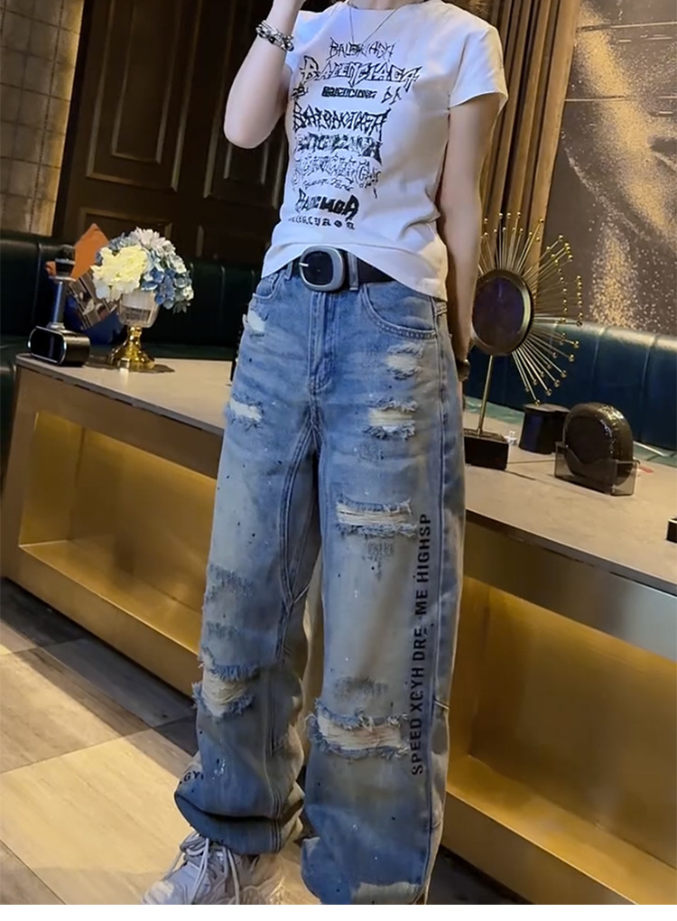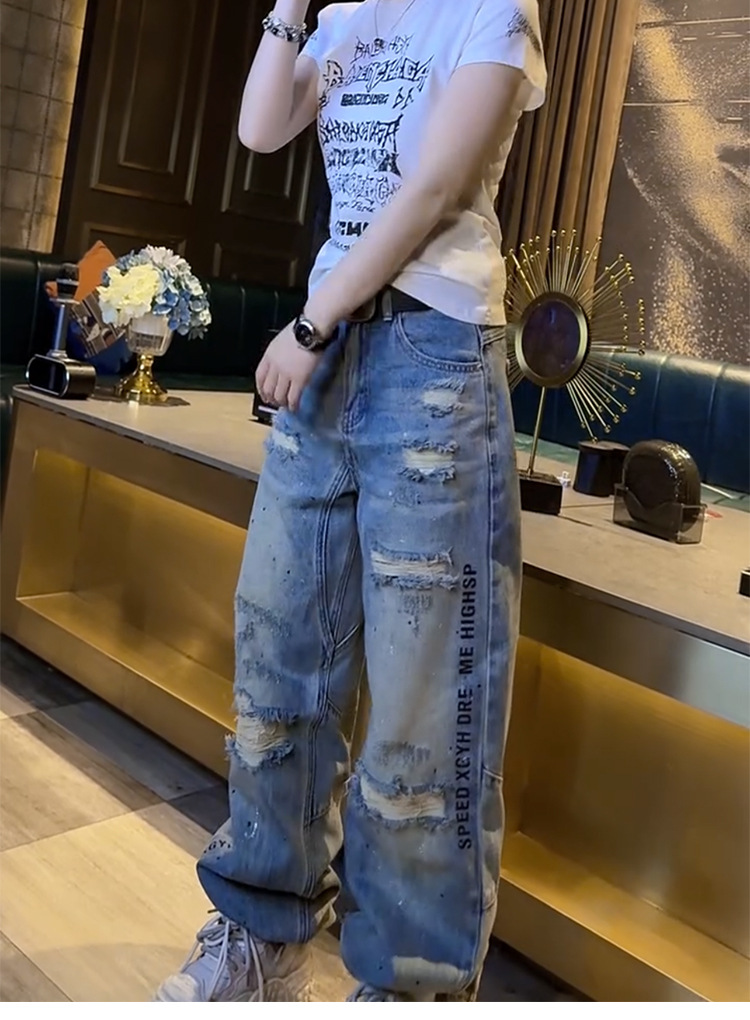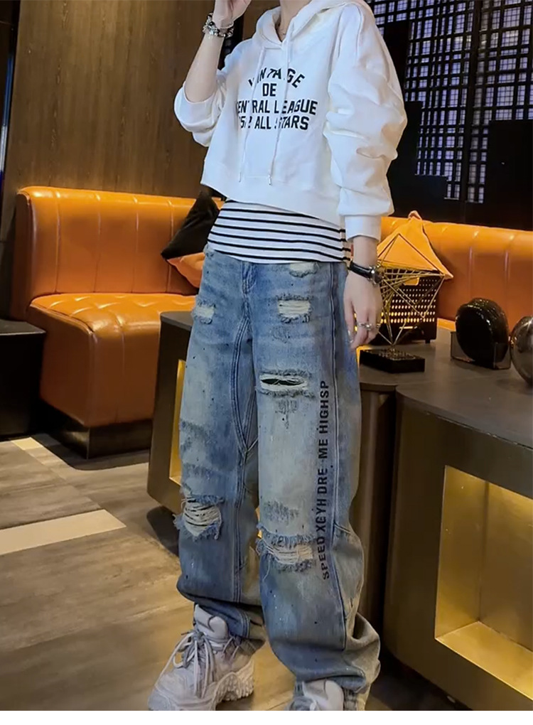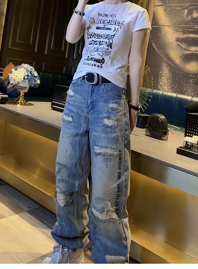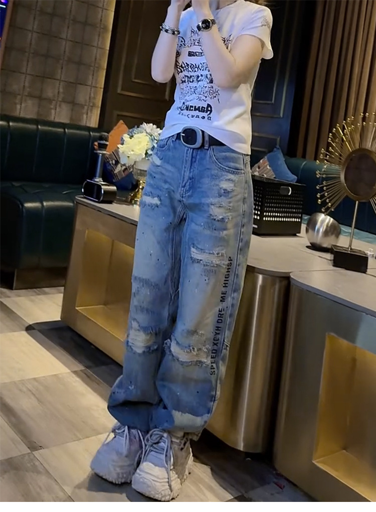 플러스 사이즈 찢어진 스트레이트 청바지 여자 봄 2025 새로운 높은 허리 통통녀 슬리밍 느슨한 시미 터 넓은 다리 바지스토어 가기