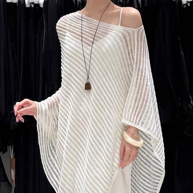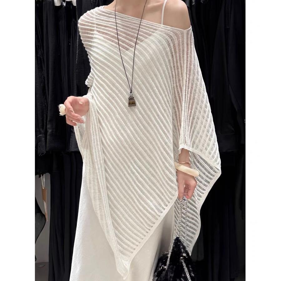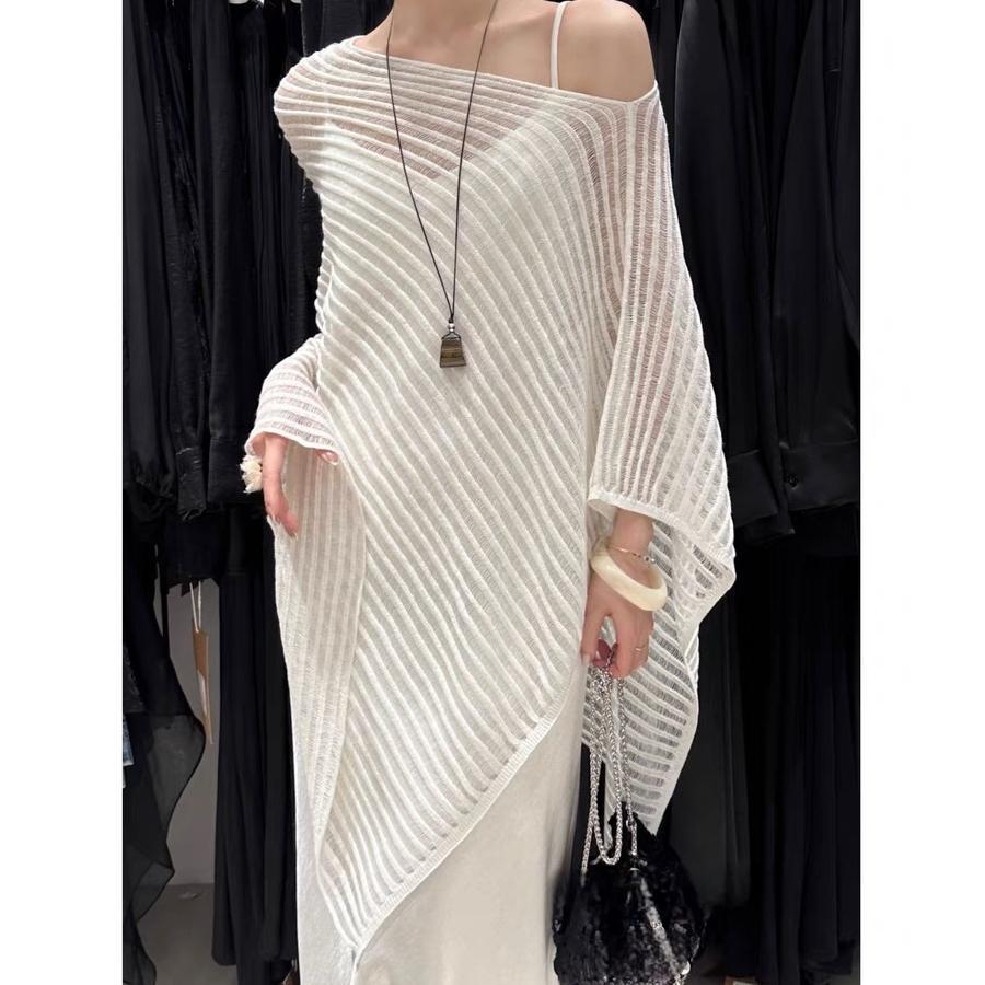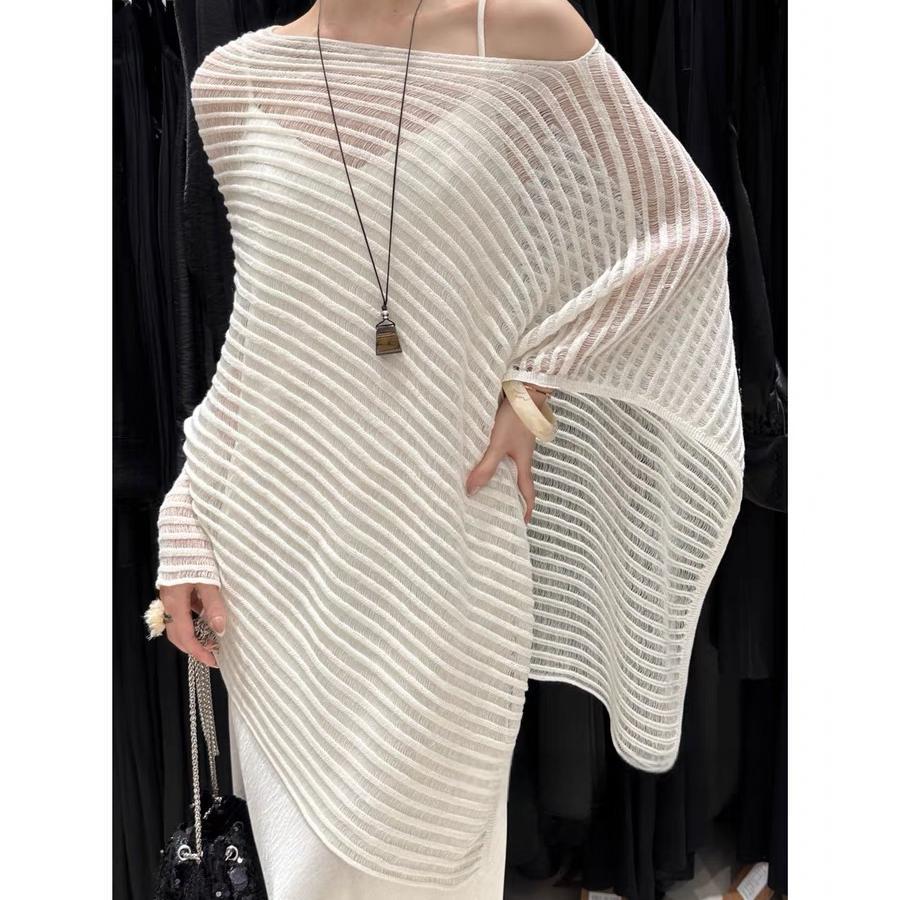 한국 스타일 게으른 스타일 슬랜트 칼라 할로우 니트 스웨터 여자 2025 년 여름 새 레트로 불규칙한 줄무늬 니트 블라우스