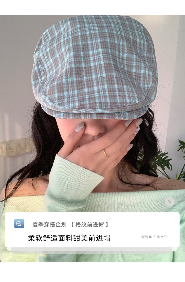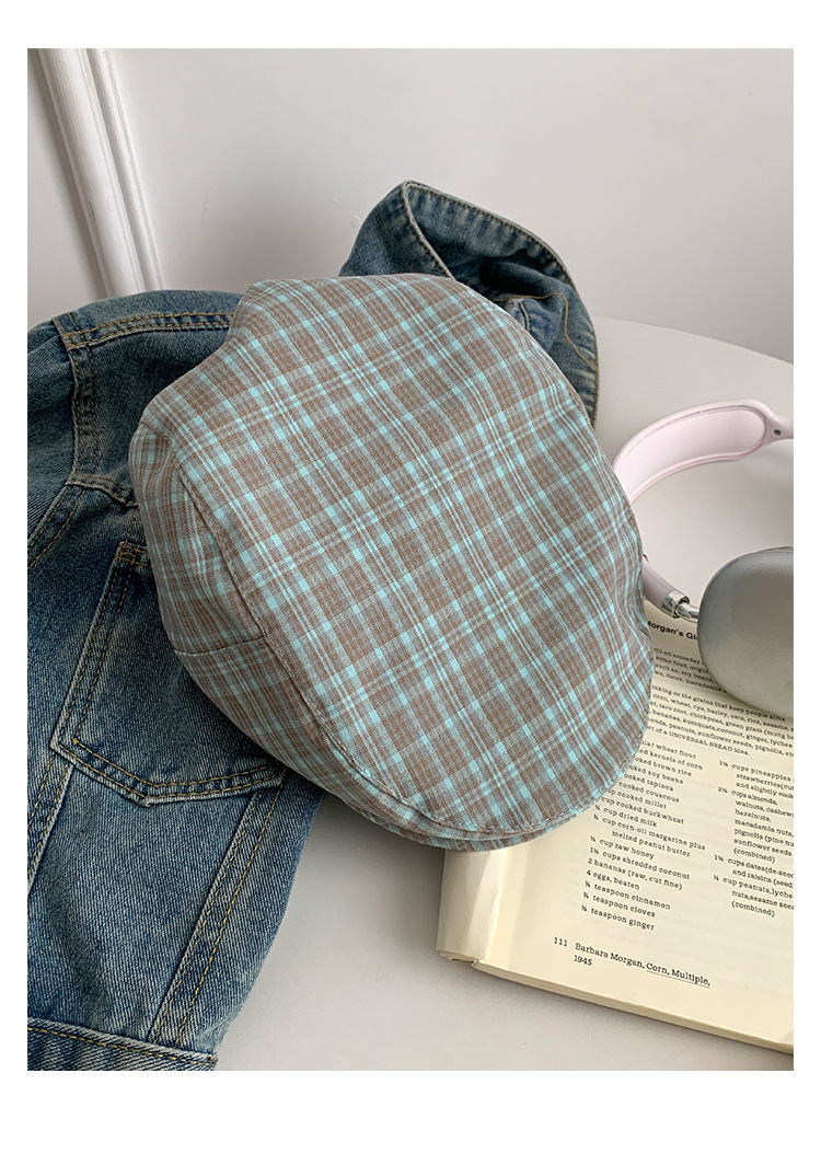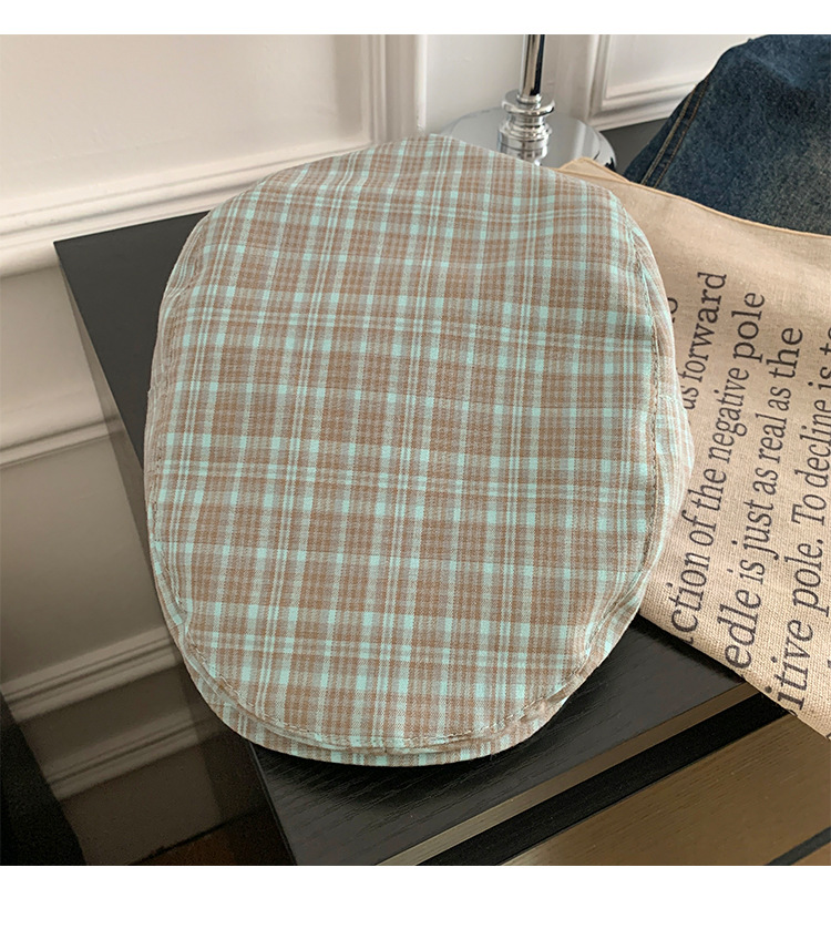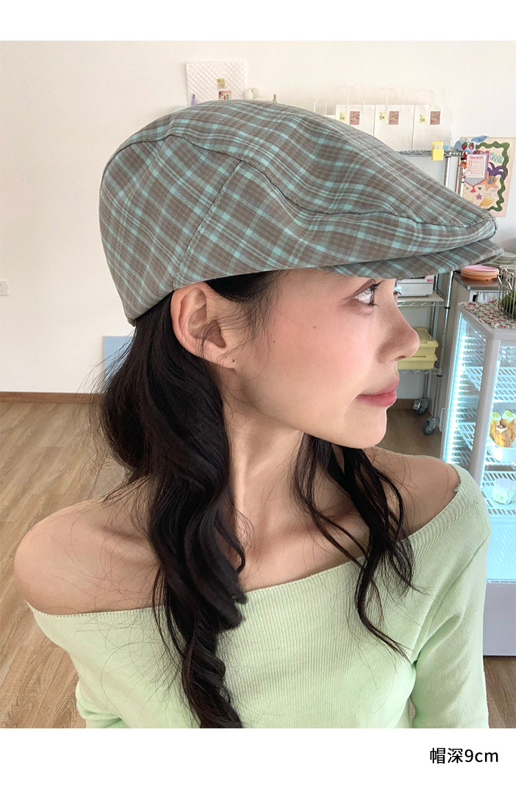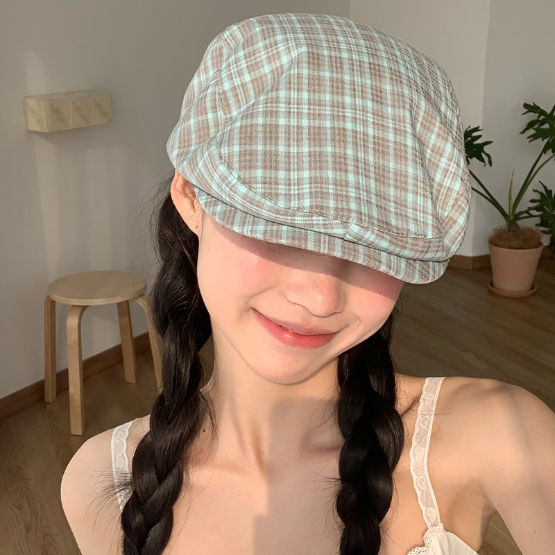 빈티지 블루 다크 브라운 체크 앞으로 모자 여성의 봄과 여름 큰 머리 둘레 착용 모자 얼굴-작은 뉴스 보이 모자 트렌디 표시스토어 가기