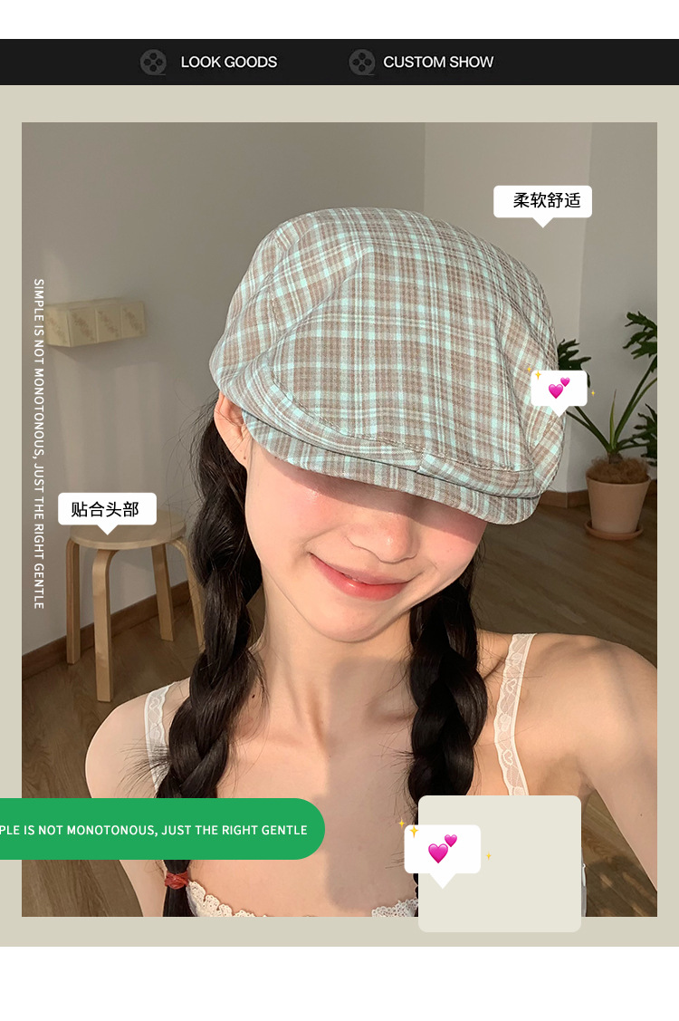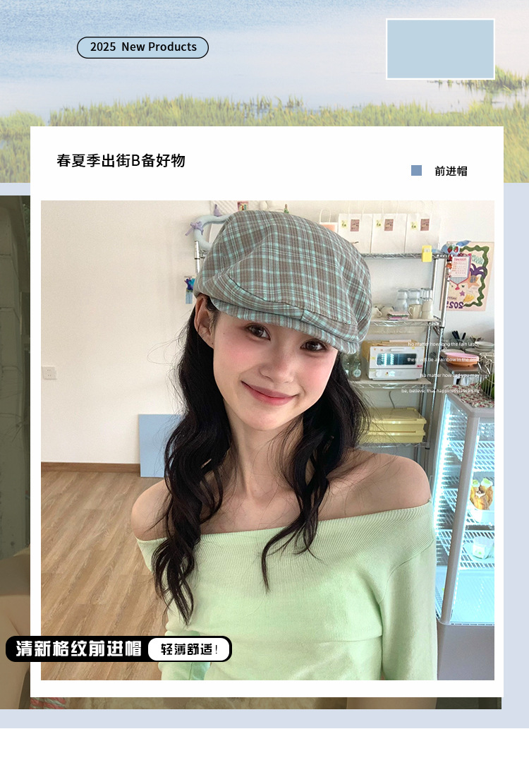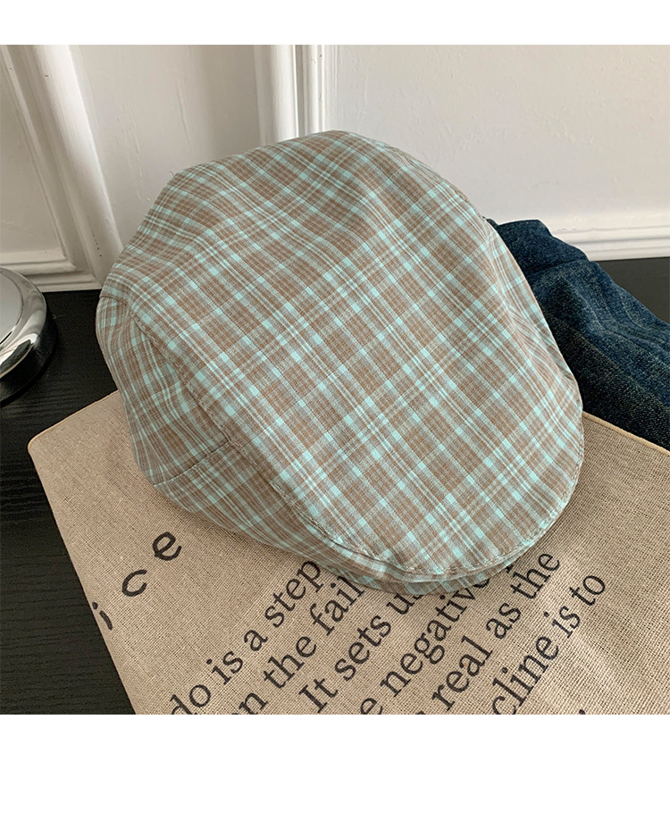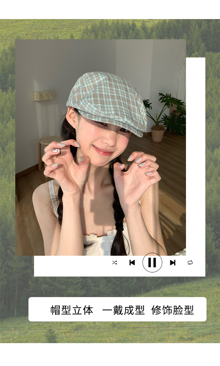 빈티지 블루 다크 브라운 체크 앞으로 모자 여성의 봄과 여름 큰 머리 둘레 착용 모자 얼굴-작은 뉴스 보이 모자 트렌디 표시스토어 가기