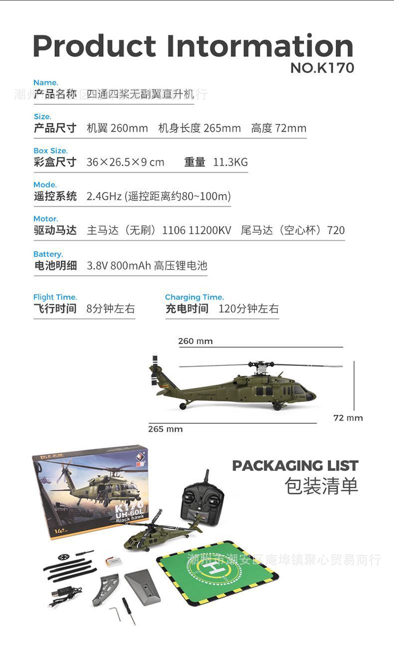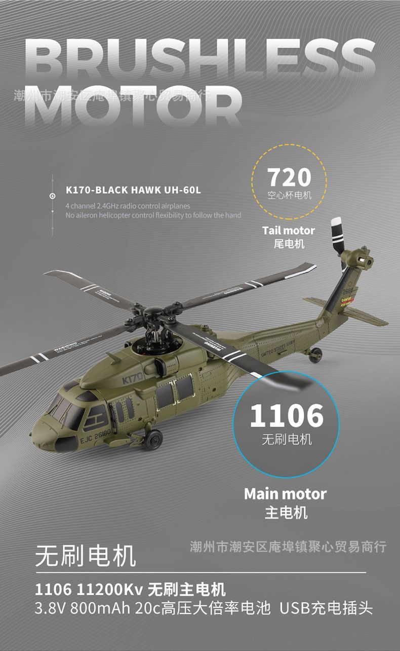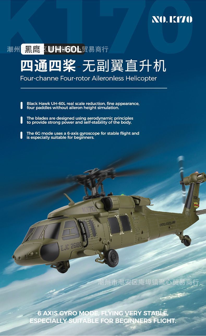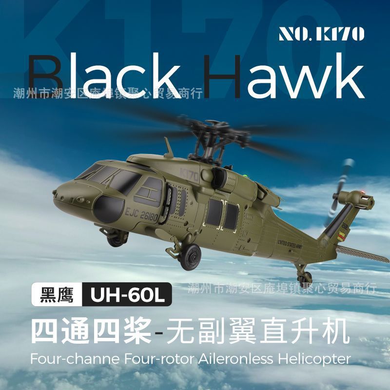 Weili K170 원격 제어 헬리콥터 4 방향 단일 패들 브러시리스 모터 블랙 호크 원격 제어 UAV 항공 모델 항공기