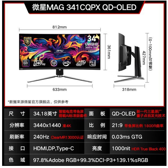 MPG 341CQPX QD-OLED 34 "Quasi 4K 240Hz 양자 점 OLED 게임 비디오 디스플레이 화면