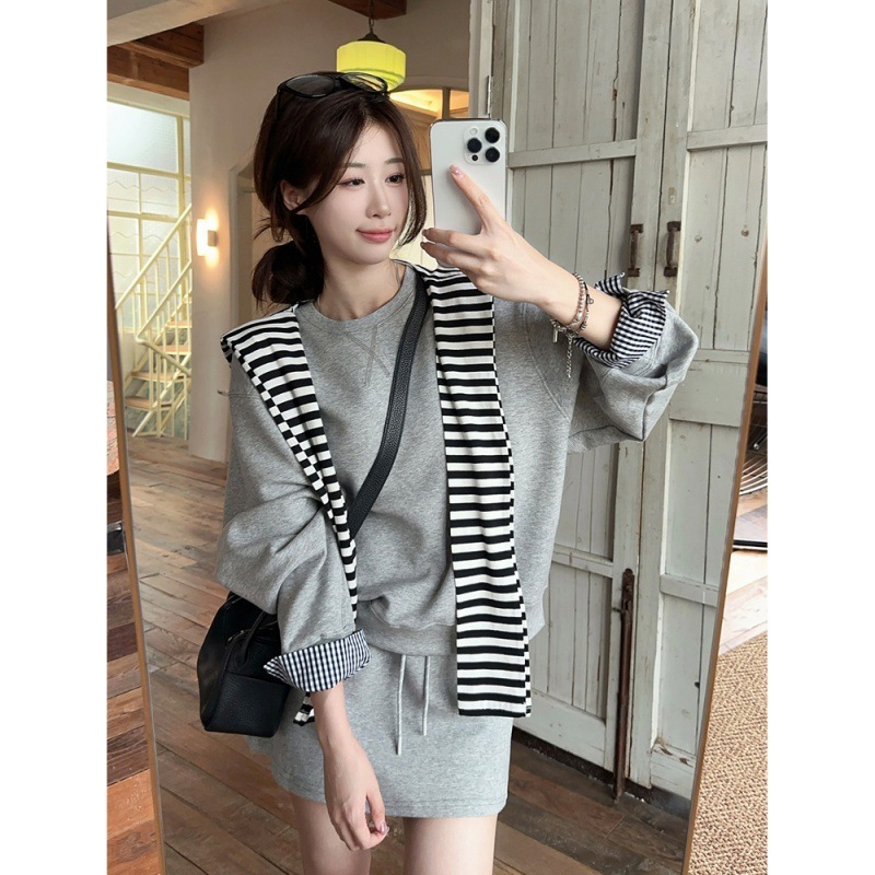 • 그레이 맨투맨+스커트+스트라이프 숄[3종세트]