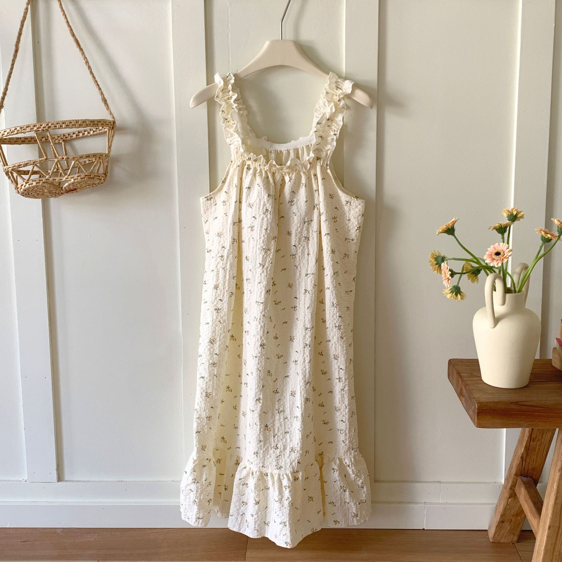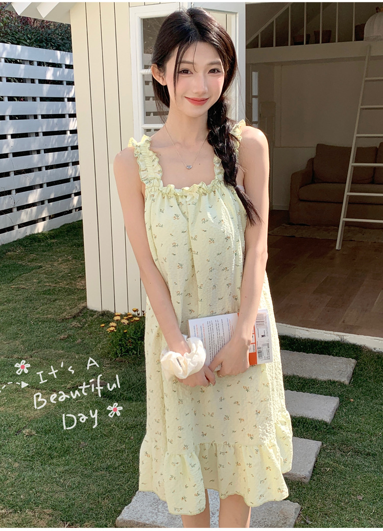 • T636 가슴 패드가 있는 잠옷, 베이지색 작은 노란색 꽃