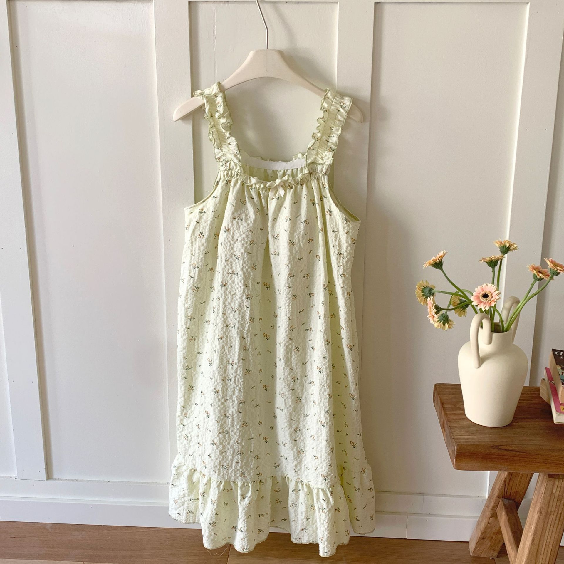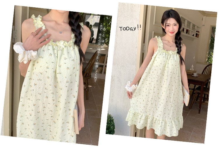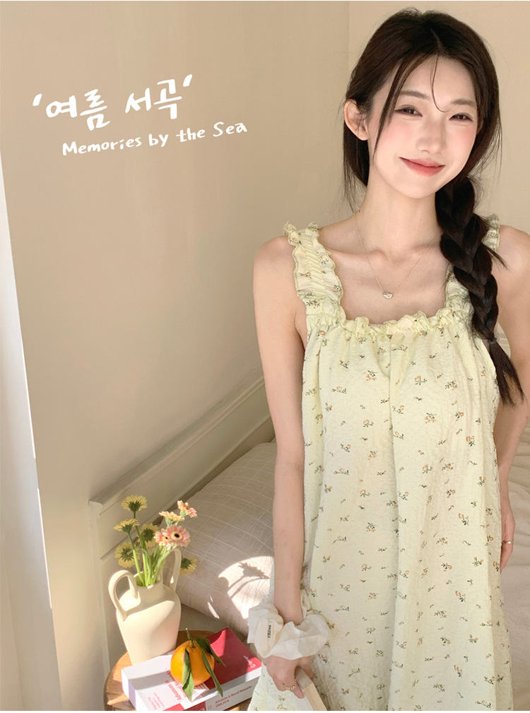• T636 가슴 패드 잠옷 녹색 작은 노란색 꽃