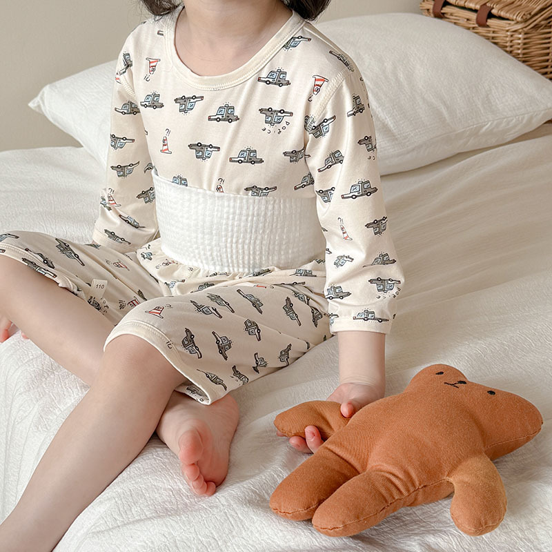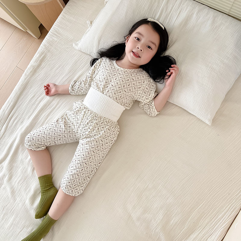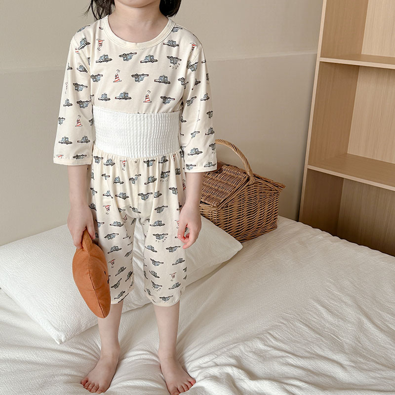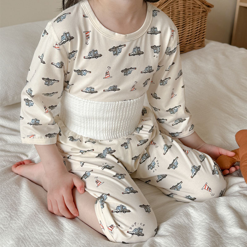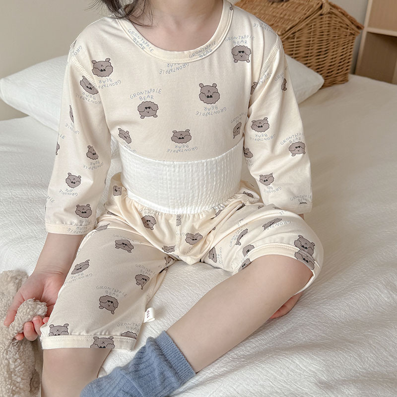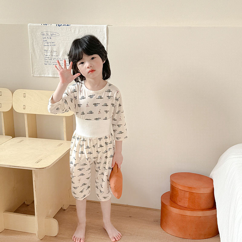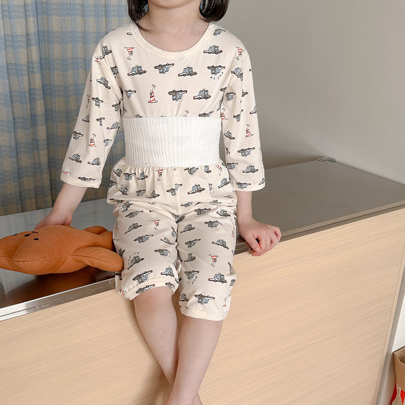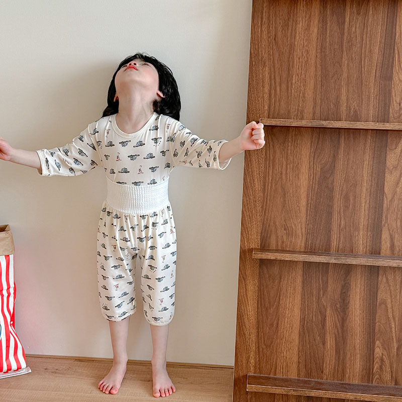 여름 아기 집 옷 소년의 높은 허리 배꼽 보호 잠옷 어린이 얇은 안티 냉각 에어컨 옷 7 포인트 세트스토어 가기
