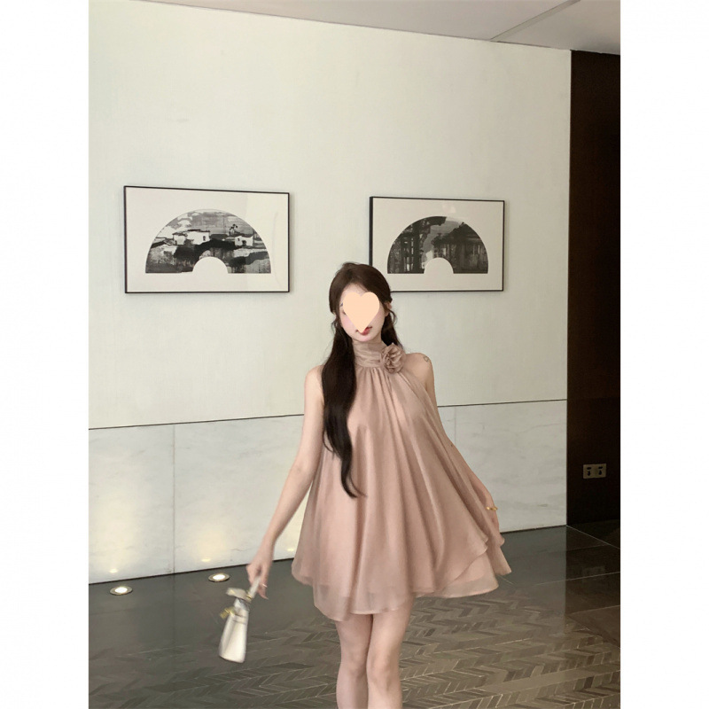 우아한 사교계 3 차원 꽃 목 민소매 원피스 여성 여름 부드러운 느슨한 오프 숄더 스커트스토어 가기