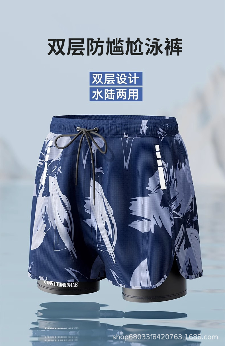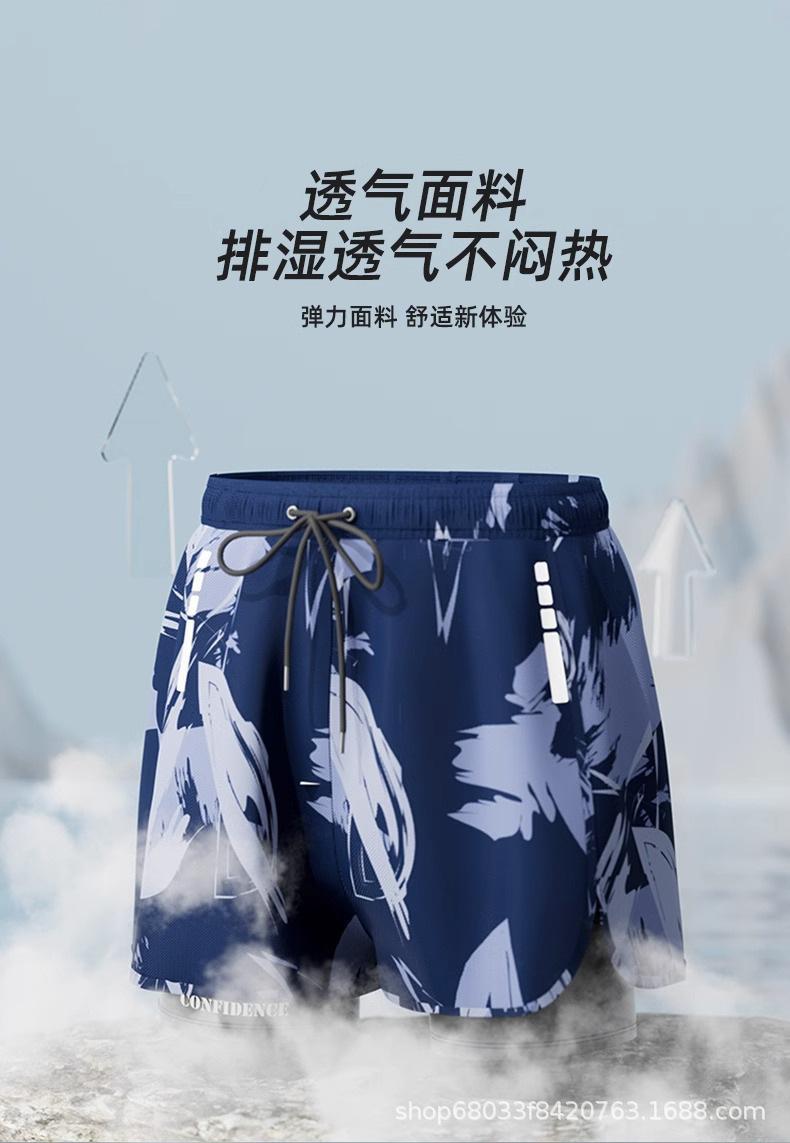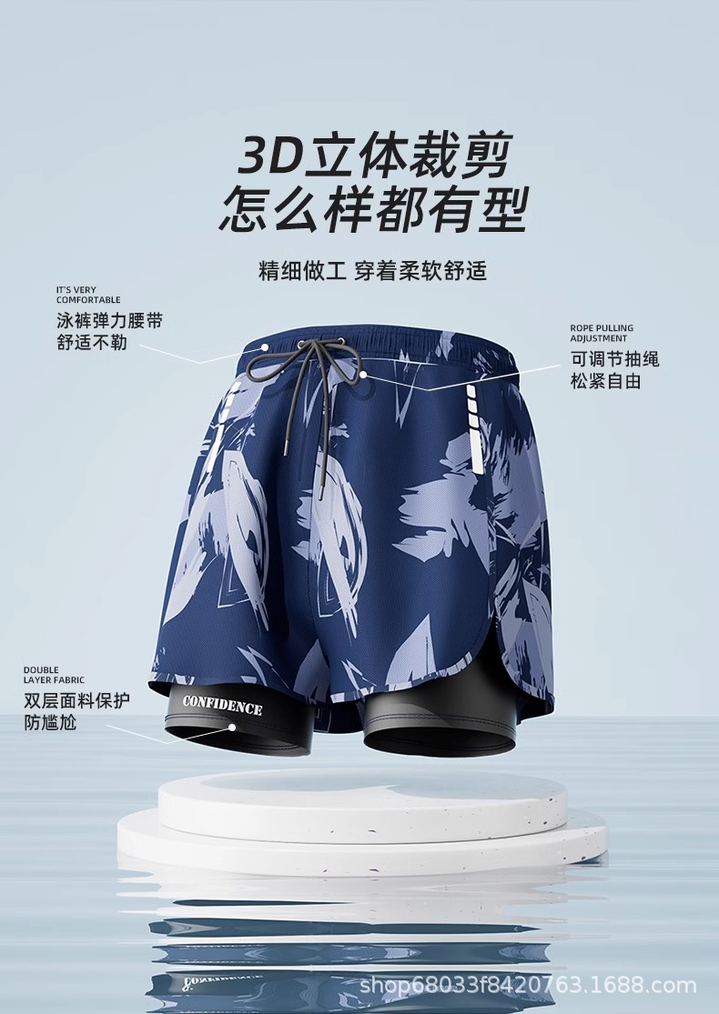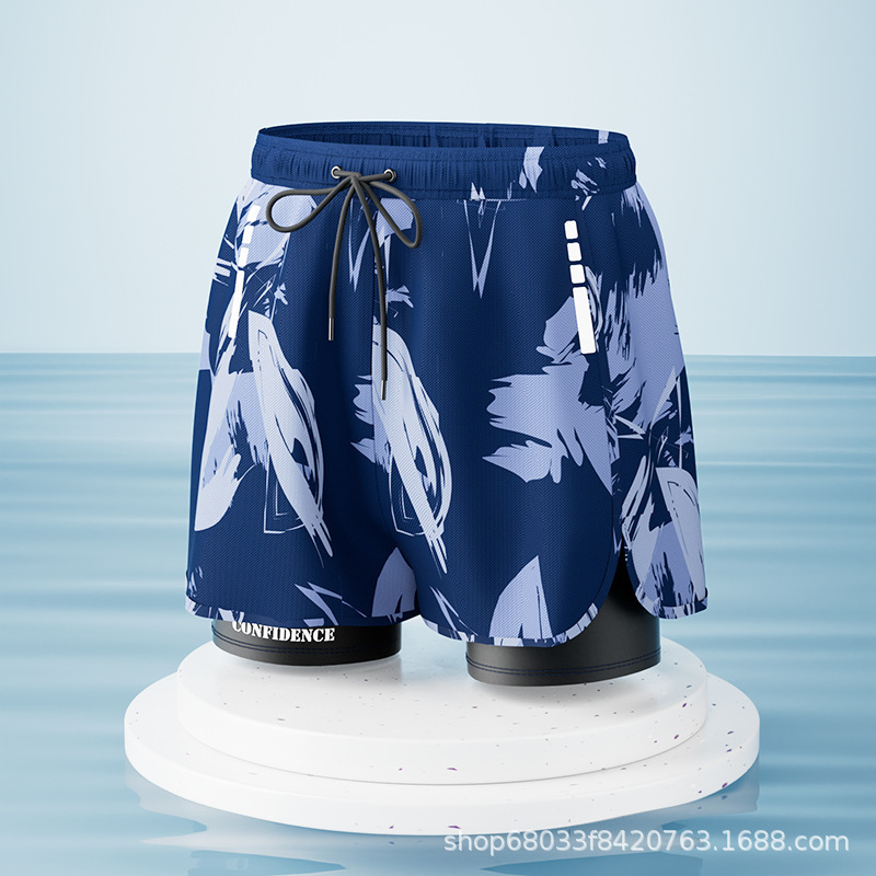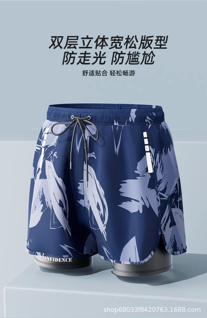 남성 색상 빠른 건조 느슨한 캐주얼 5 점 해변 더블 레이어 가짜 투피스 방황 수영 트렁크