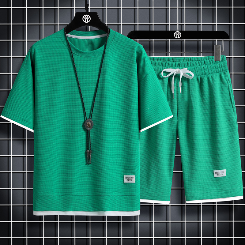 무료 배송 와플 반소매 티셔츠 남성 레저 스포츠 세트 도매 여름 느슨한 가짜 두 반소매 티셔츠 두