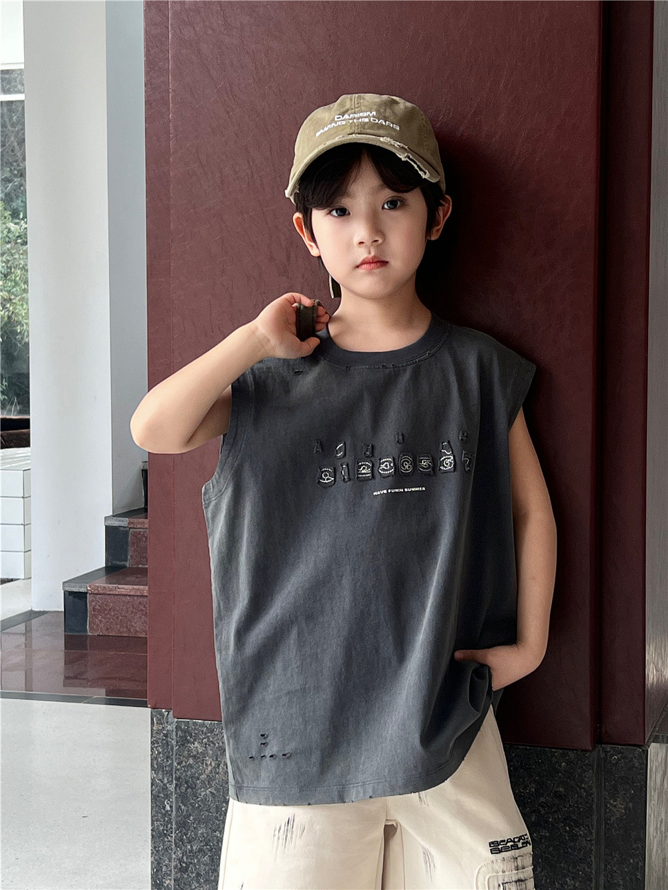 트렌디 브랜드 아동용 반팔티 2025 여름 디지털 패치 자수 디스트레스드 남녀공용 민소매 티셔츠스토어 가기