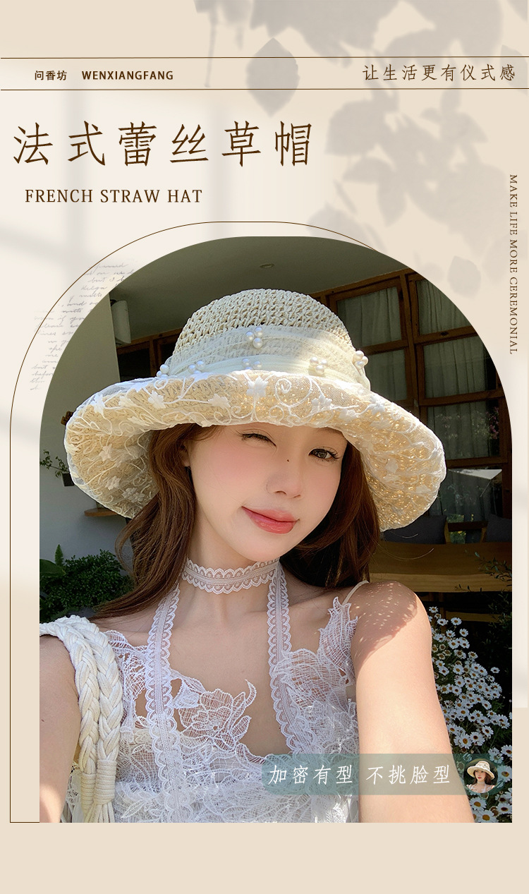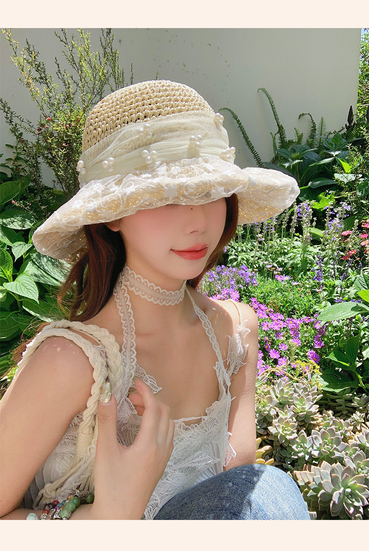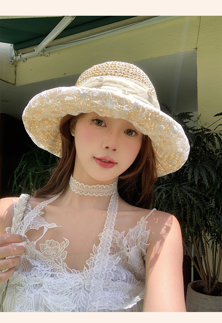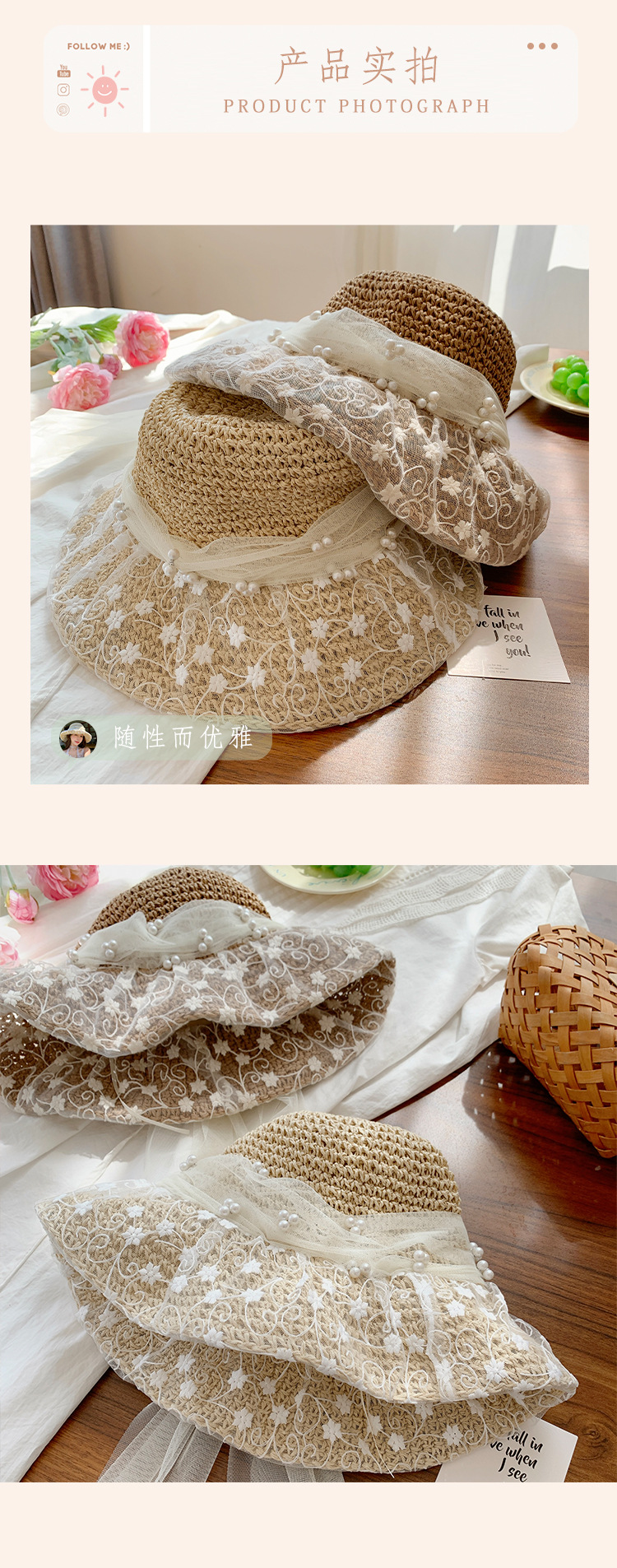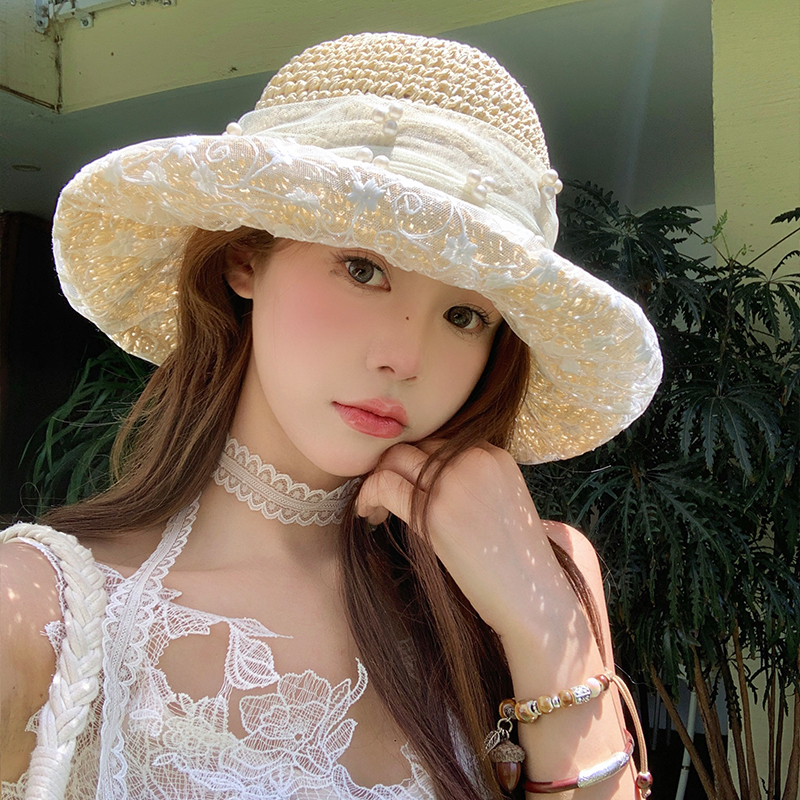 레이스 진주 짠 어부 모자 여성의 봄과 여름 휴일 스타일 해변 모자 큰 가장자리 태양 보호 모자스토어 가기