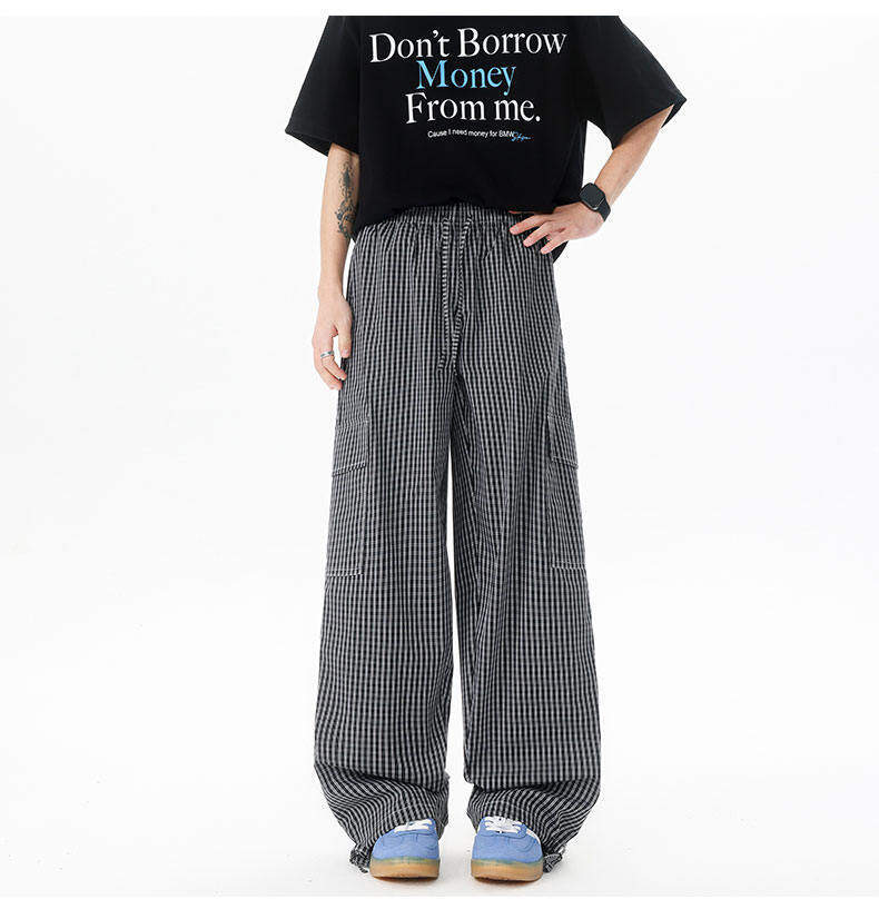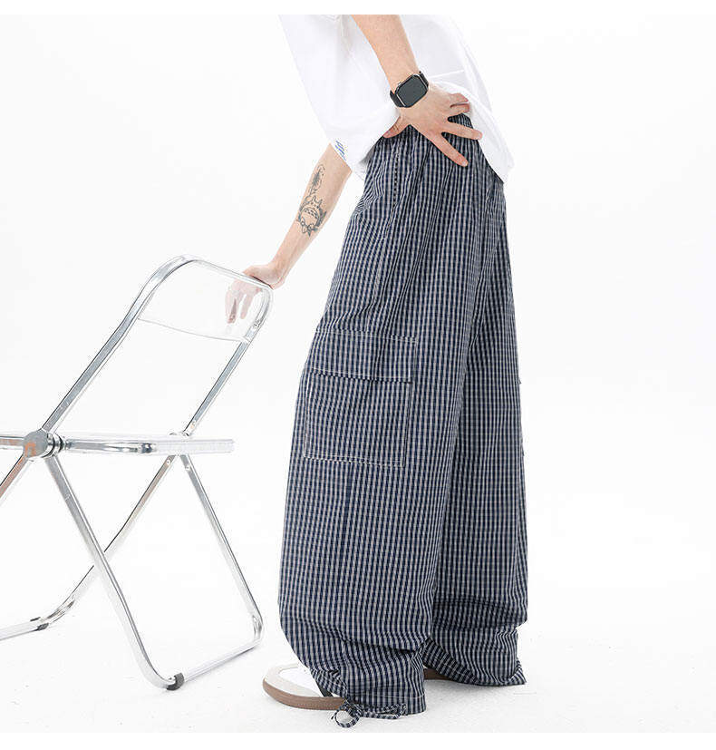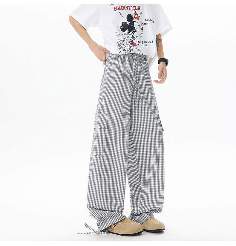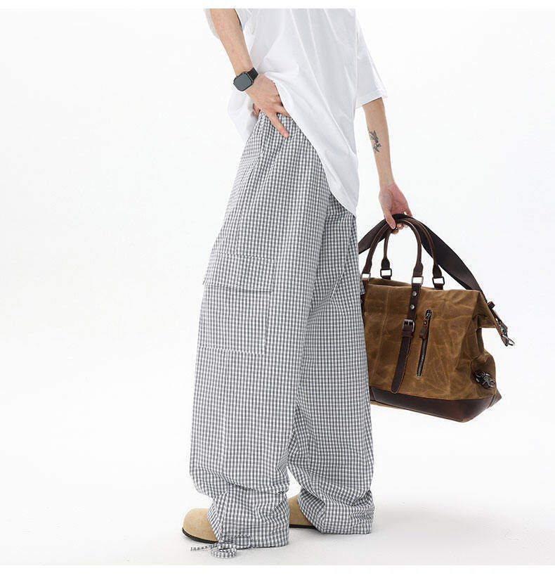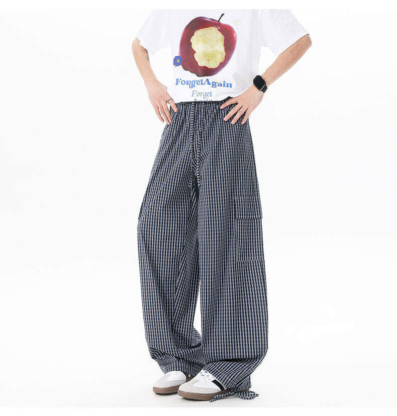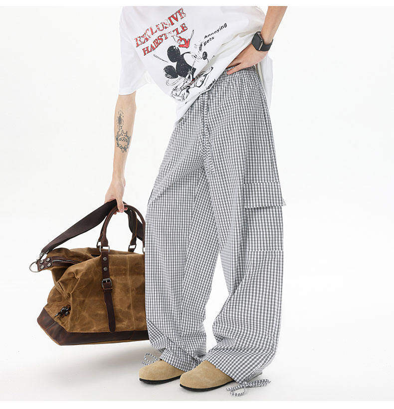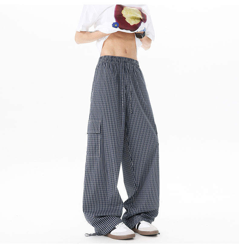 무료 배송 2025 봄 복고풍 작은 소나무 대비 색상 스티칭 디자인 드로스트링 높은 허리 조커 격자 무늬 작업 바지