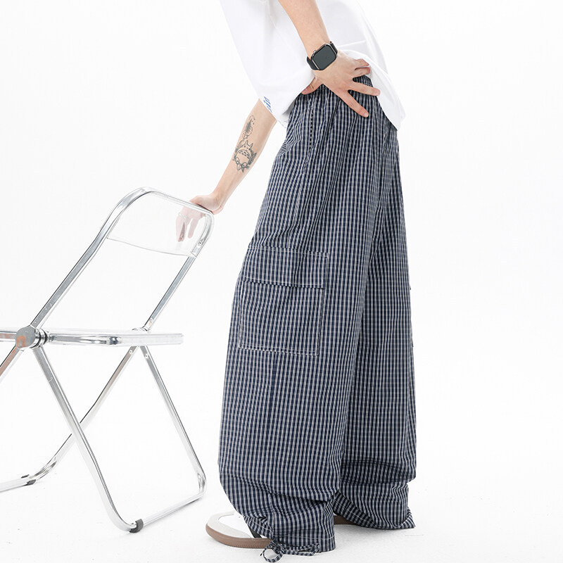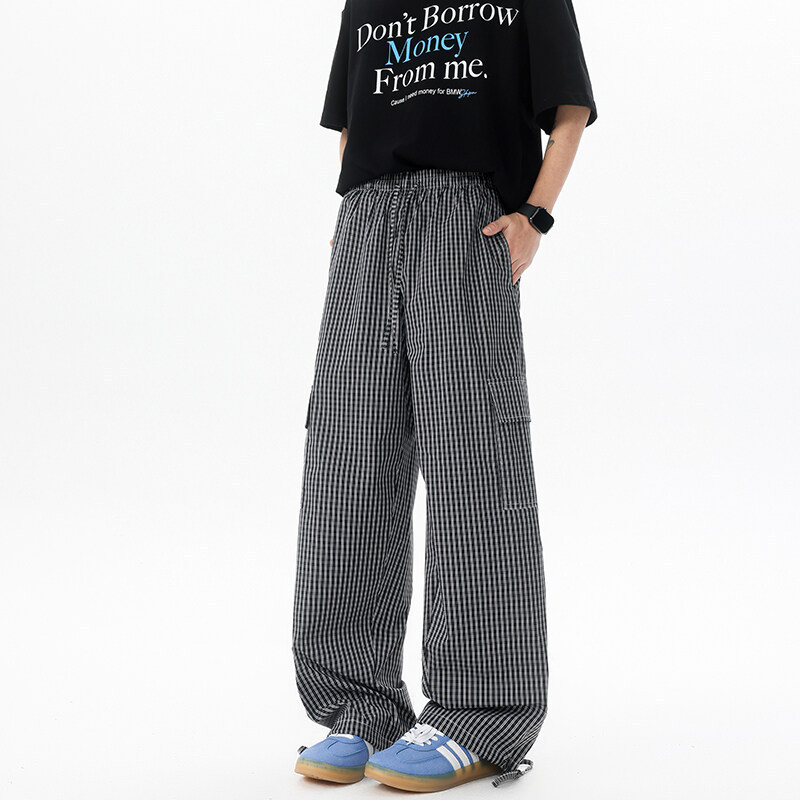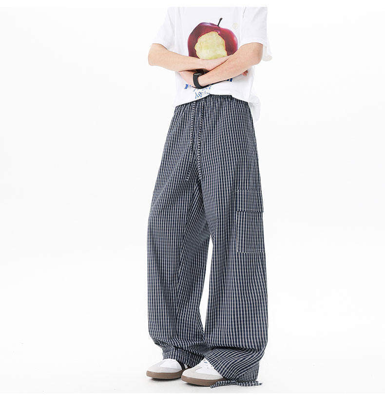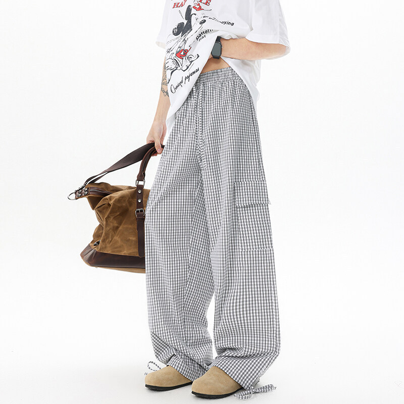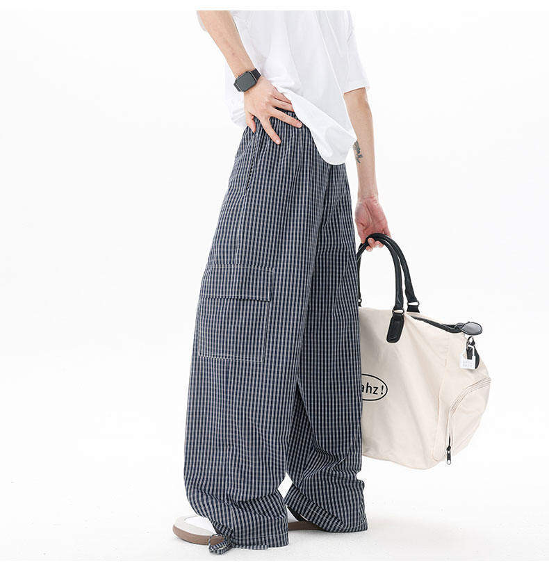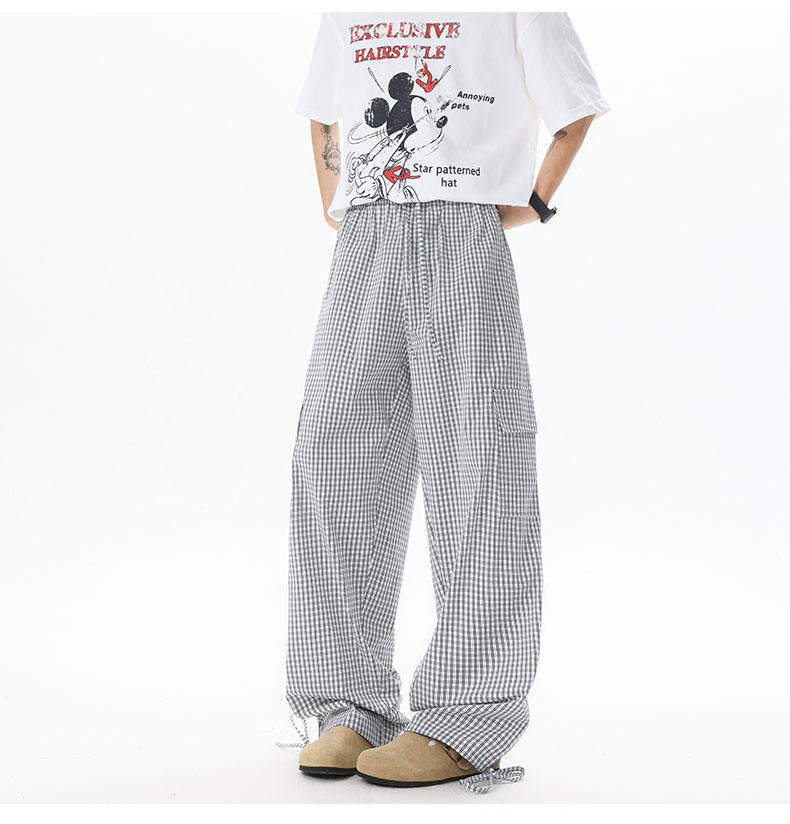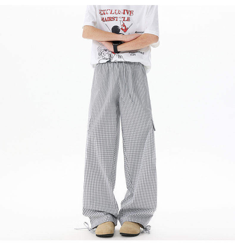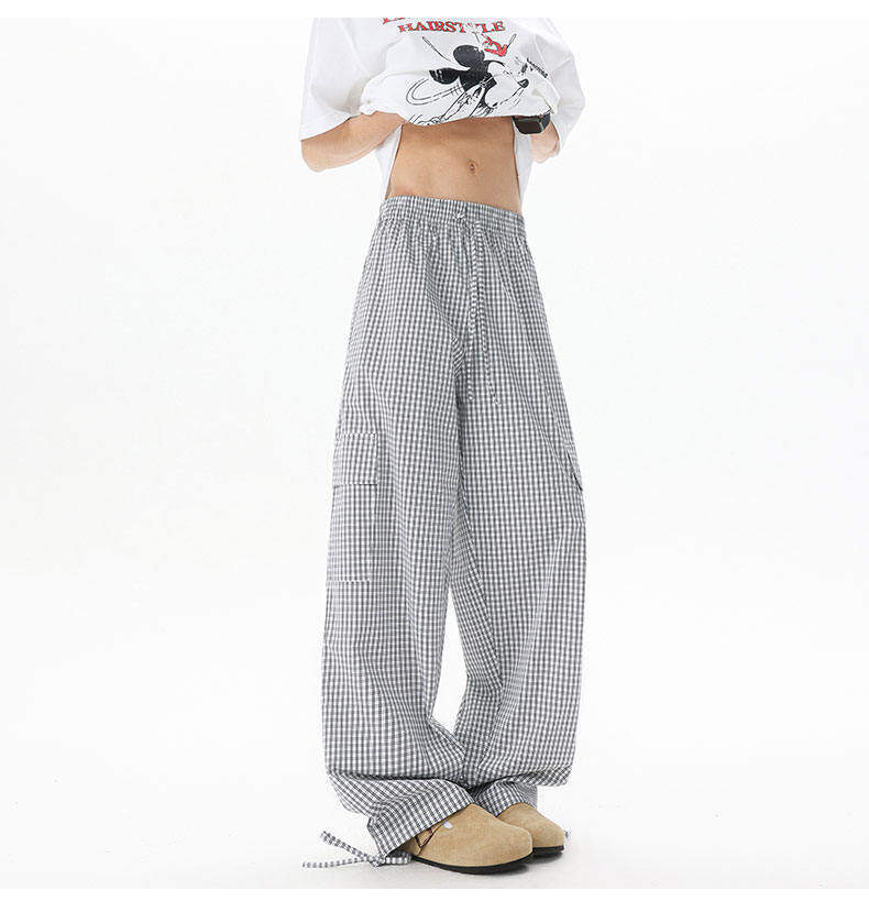 무료 배송 2025 봄 복고풍 작은 소나무 대비 색상 스티칭 디자인 드로스트링 높은 허리 조커 격자 무늬 작업 바지