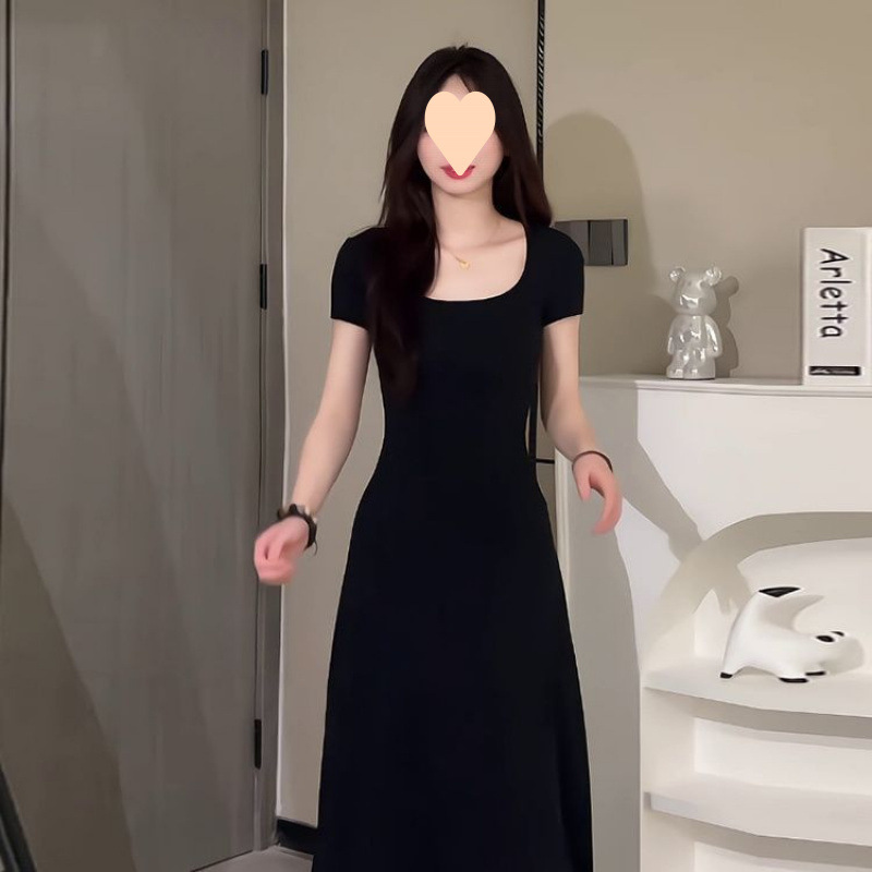 플러스 사이즈 200 진 하이 엔드 기질 스퀘어 넥 반팔 원피스 뚱뚱한 여름 무릎 꽉 허리 슬림 핏 스커트