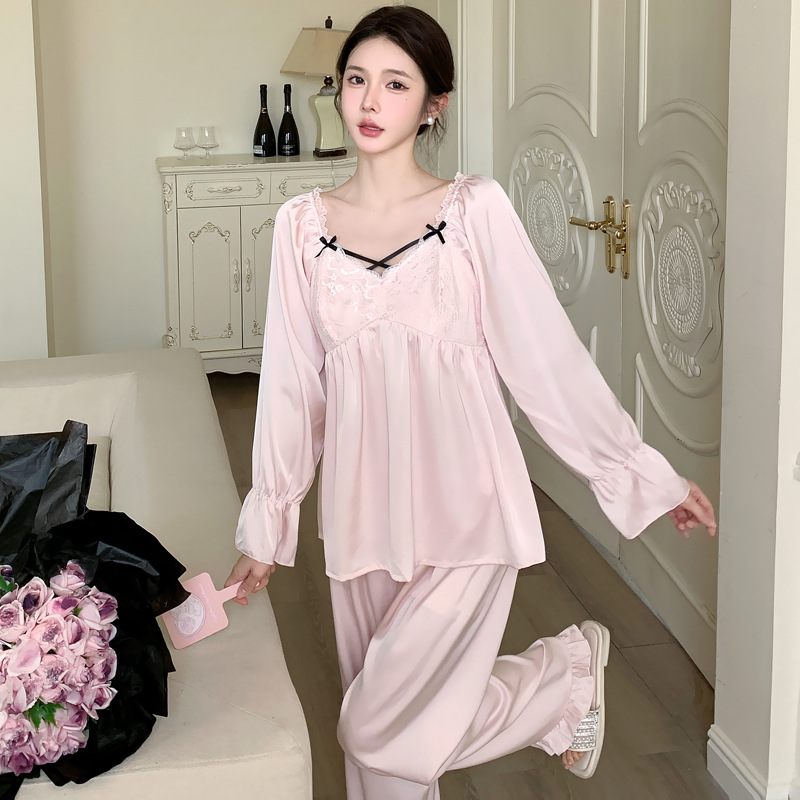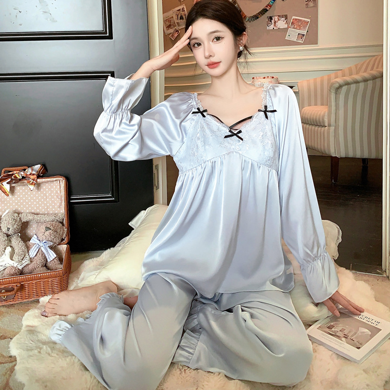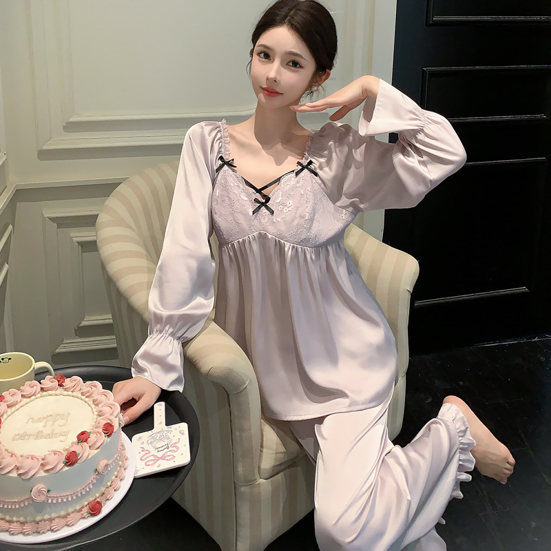 새로운 여름 아이스 실크 파자마 세트 여성의 봄과 가을 하이 엔드 실크 같은 홈 옷 가슴 패드가 달린 긴팔 바지