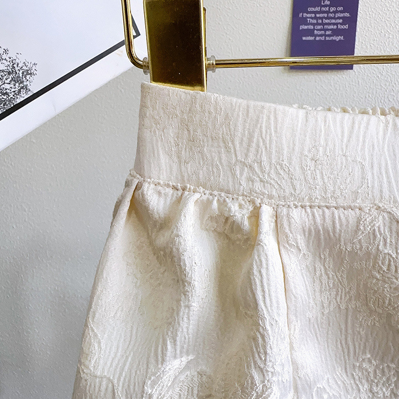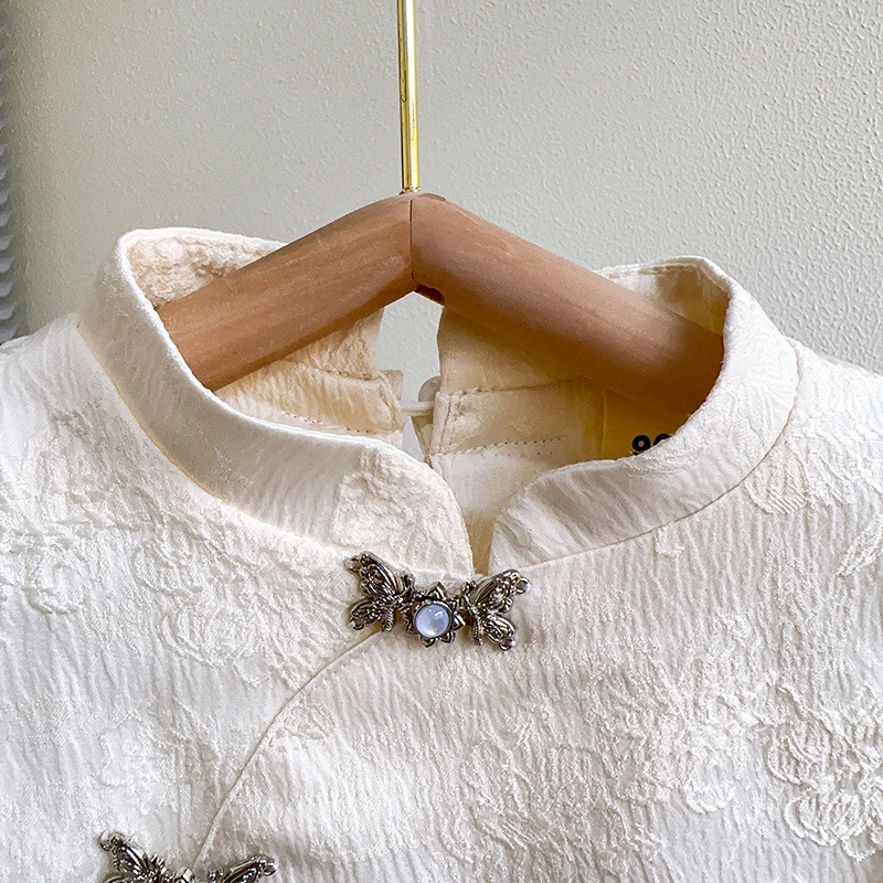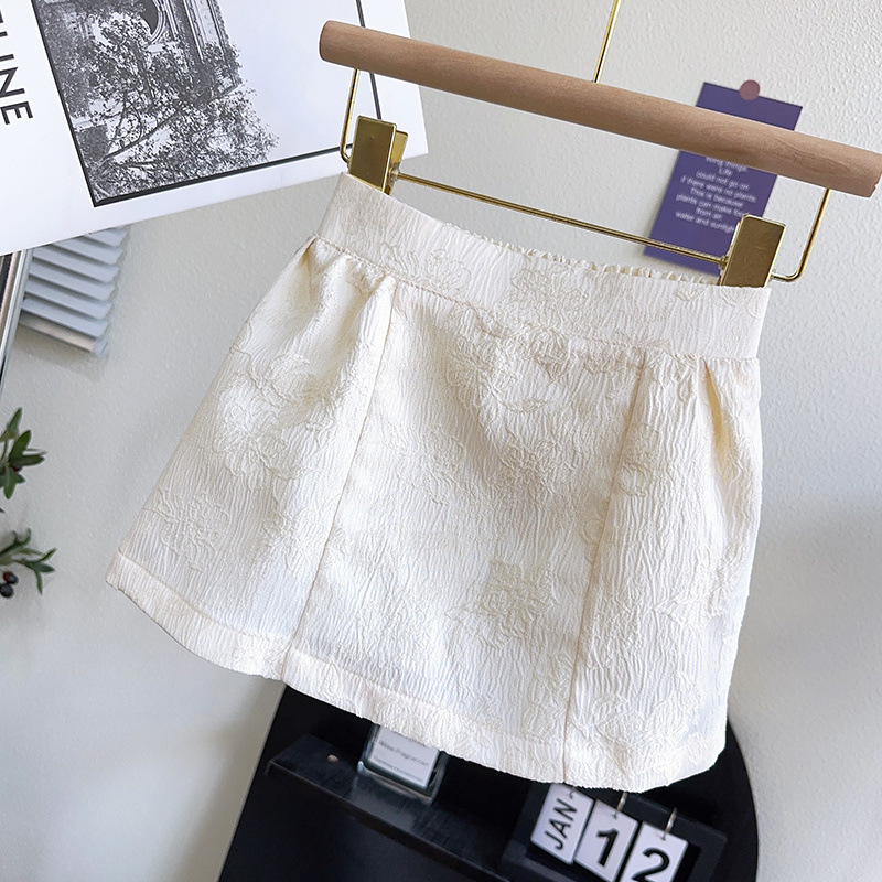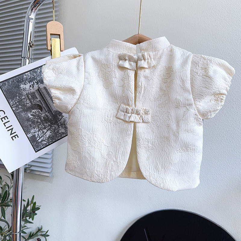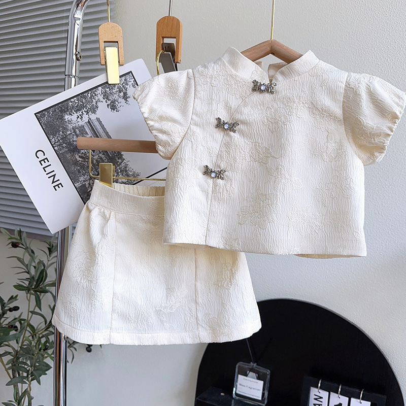 새로운 중국 스타일 걸스 세트 2025 여름 퍼프 슬리브 탕 세트 최고 중국 스타일 자카드 스커트 투피스 세트