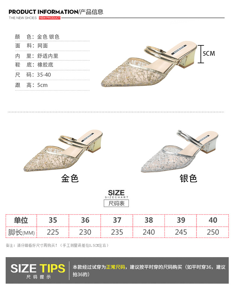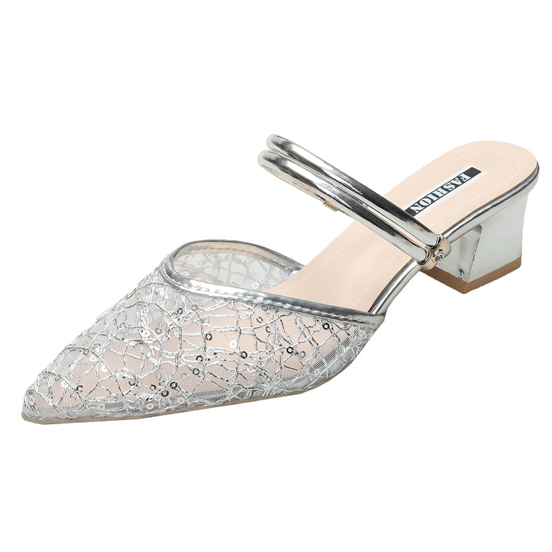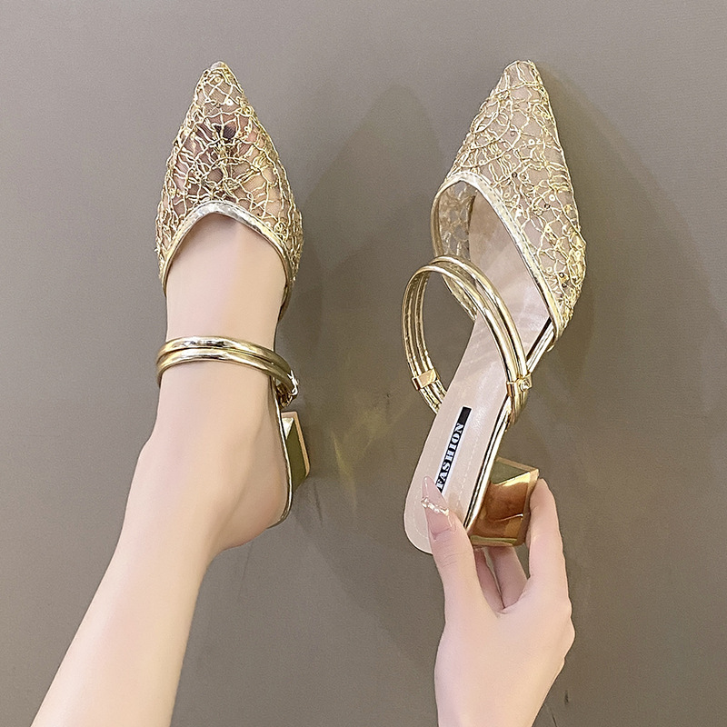 2025 년 여름 신형 바오터우 투웨어 미드힐 슬리퍼 여성 캐주얼 페어리 스타일 포인팅 두꺼운 힐 아웃웨어 패션 여성 신발스토어 가기