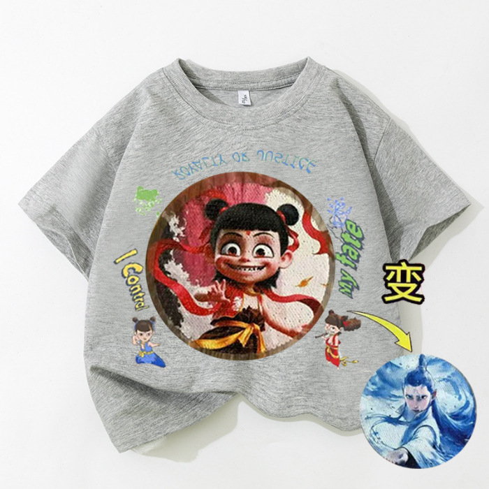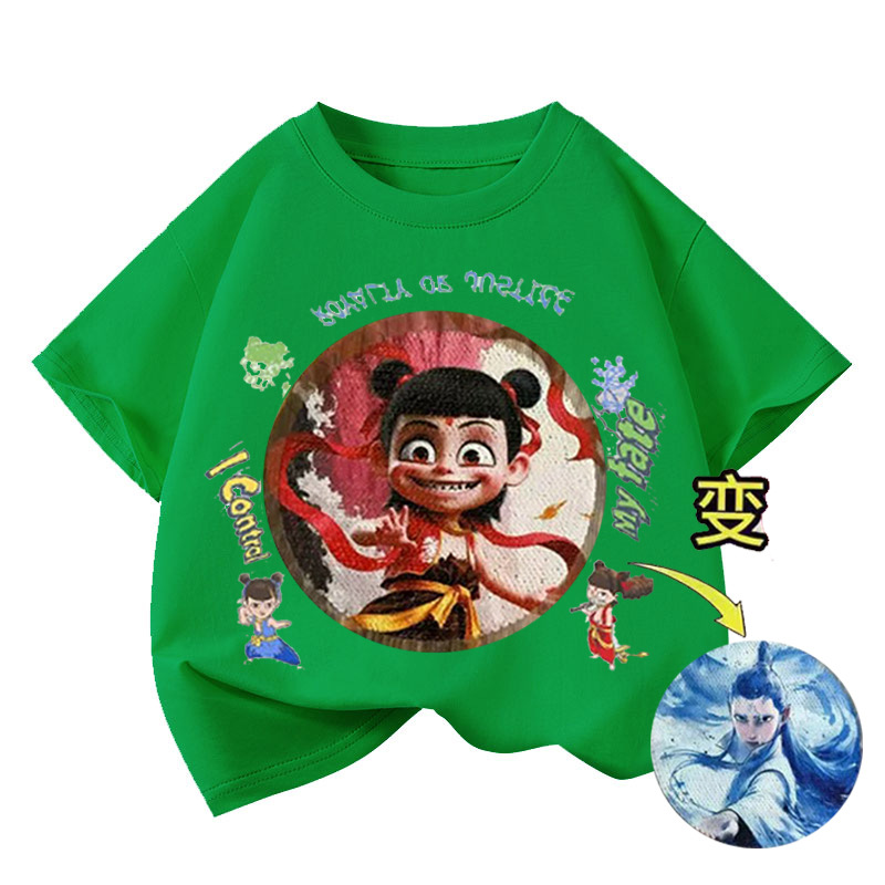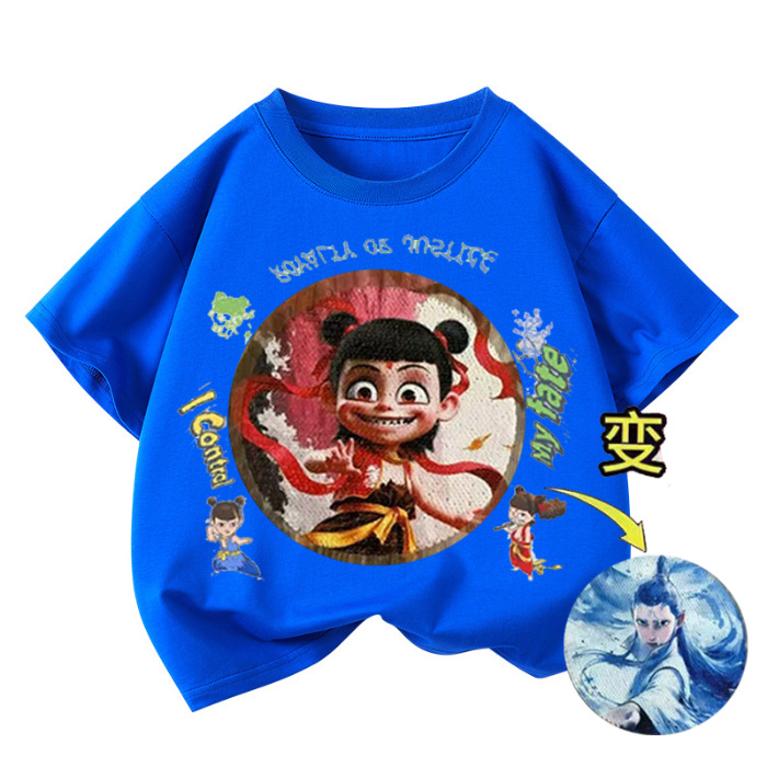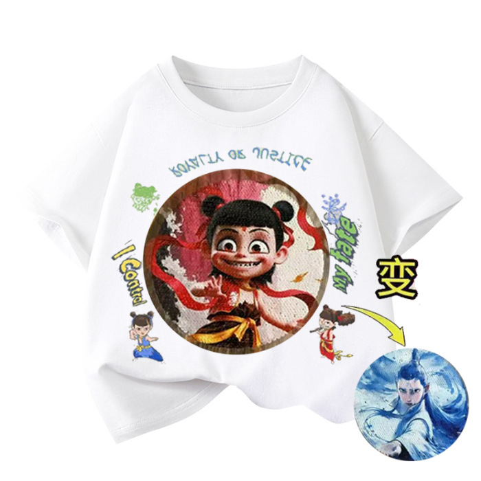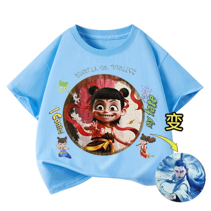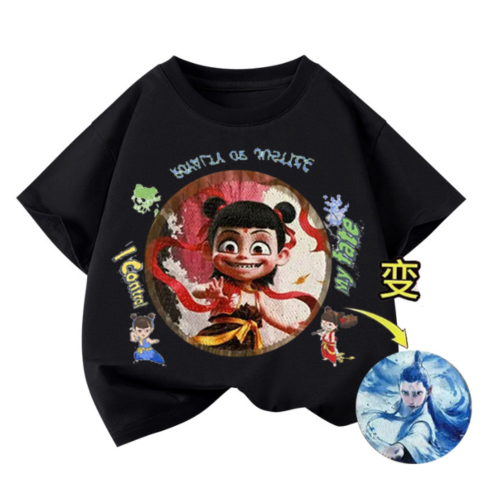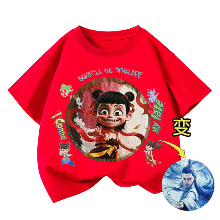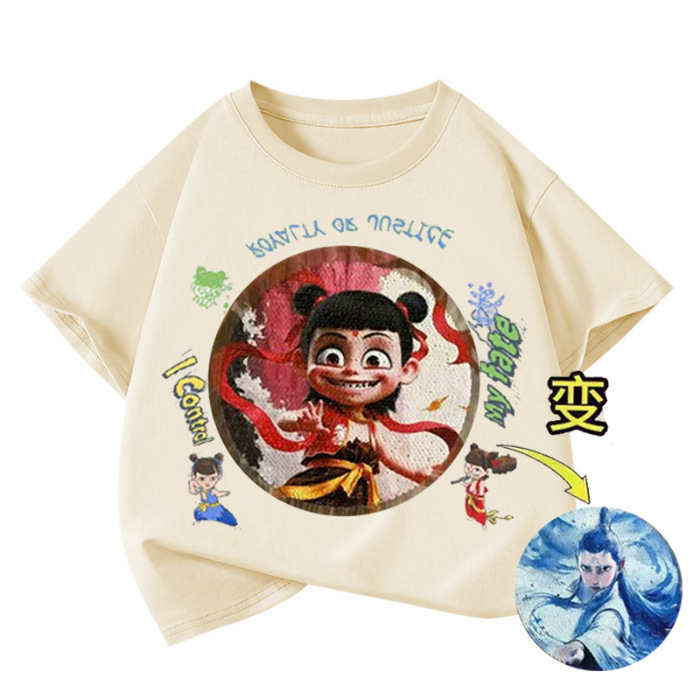 남학생 프라이드 스트리트 네자 세퀸 반팔 티셔츠 여름 어린이 구슬 자수 만화 데가 색상 변경 퓨어 코튼 탑 T스토어 가기